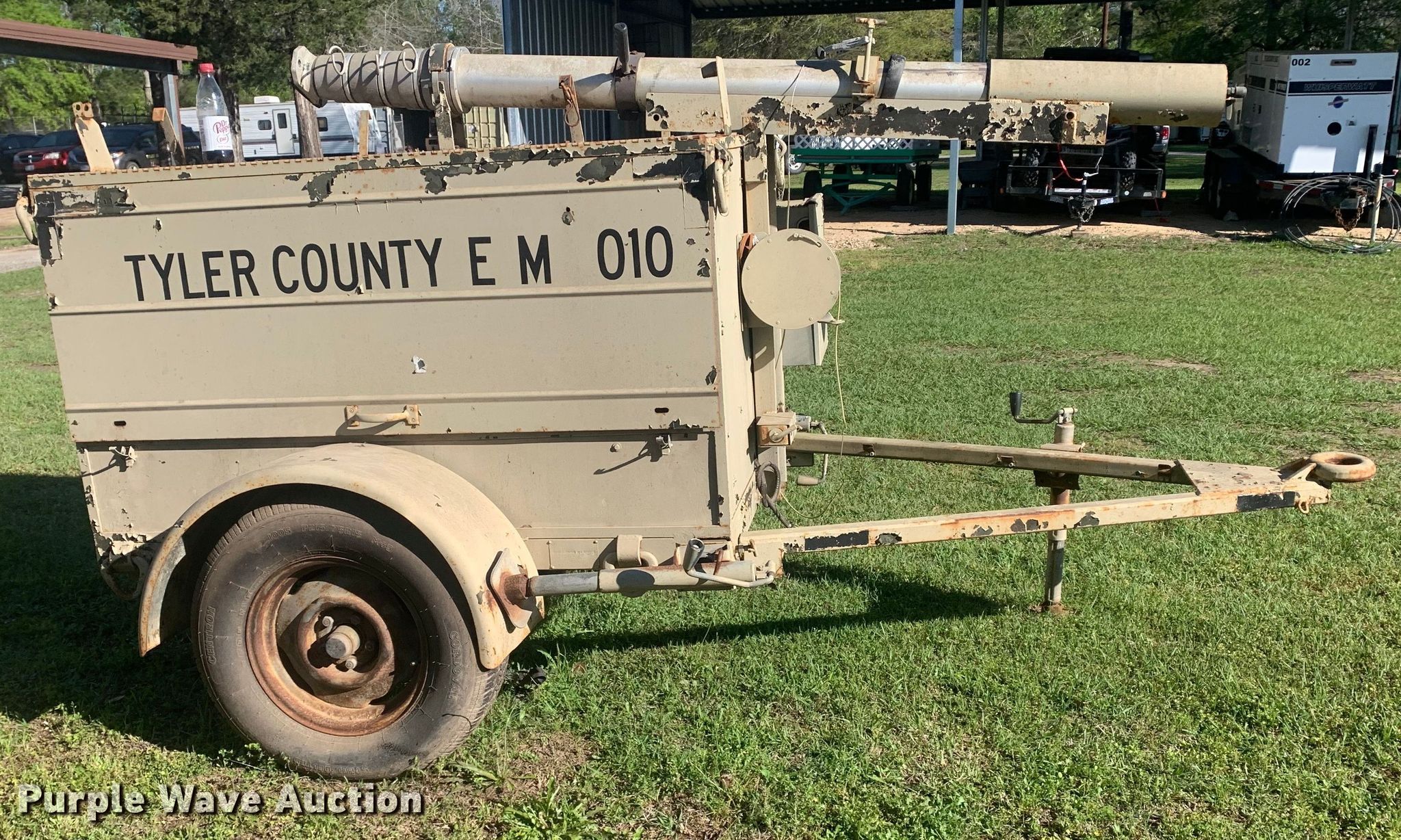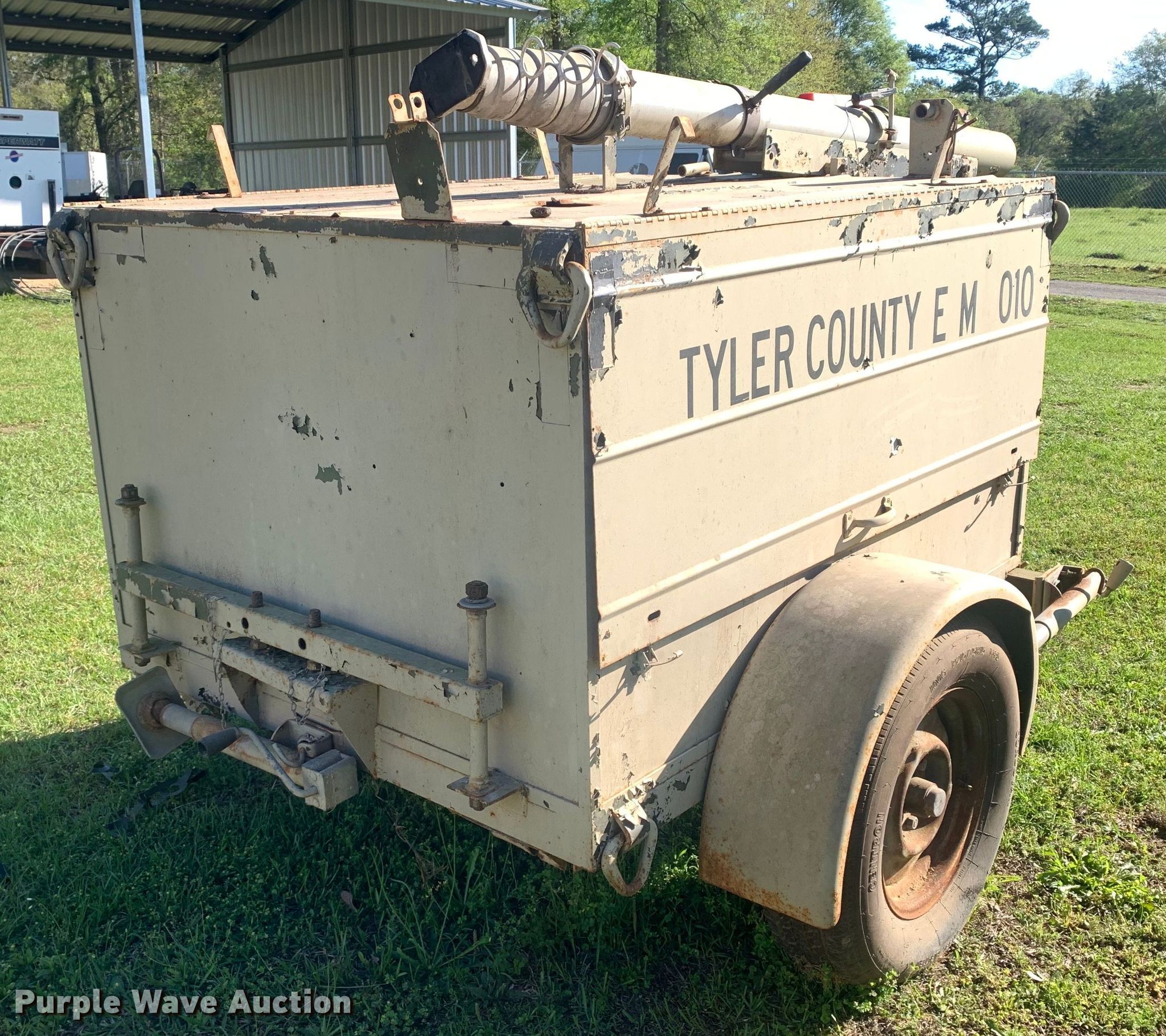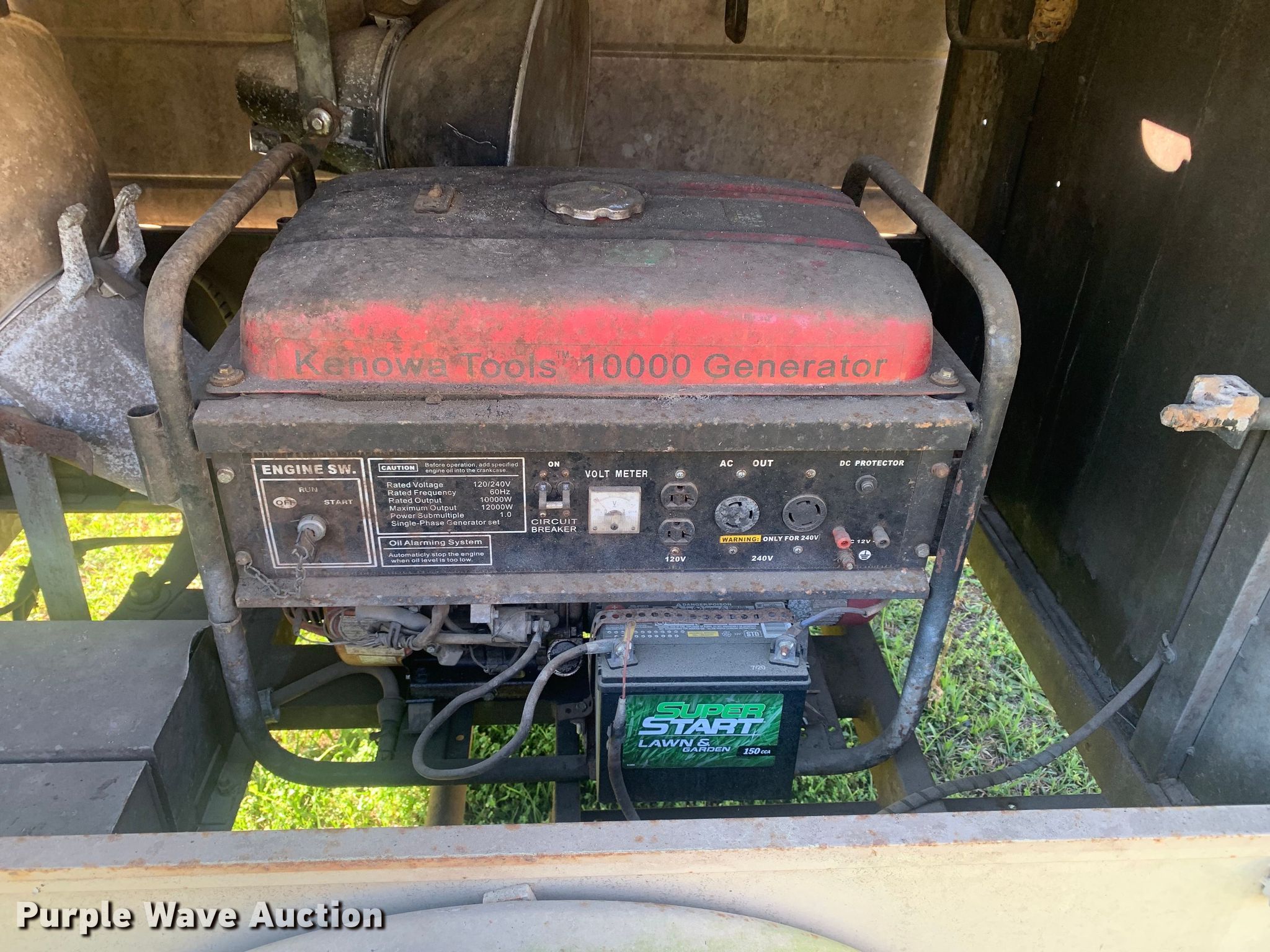 Kenowa 10000 light plant. Engine. Sanding 168F-II, Displacement: 196cc, Cylinders: 1, Fuel type: Gas, HP: 18. Features Generator Kenowa 10000, Watts: 10,000, Phase: Single, Backup start, Electric start, Fuel tank, Light plant Bulbs: 2, Hoist: Manual, Stabilizers. Trailer 10' L x 72" W, Hitch: Pintle, Suspension: Spring, Axles: Single, Tire size: P215/75R15. Notes Dead battery, Non-operational unit. Transfer of ownership documentation will be a bill of sale. Tyler County, TX. 201 Veterans Way. Woodville, TX 75979