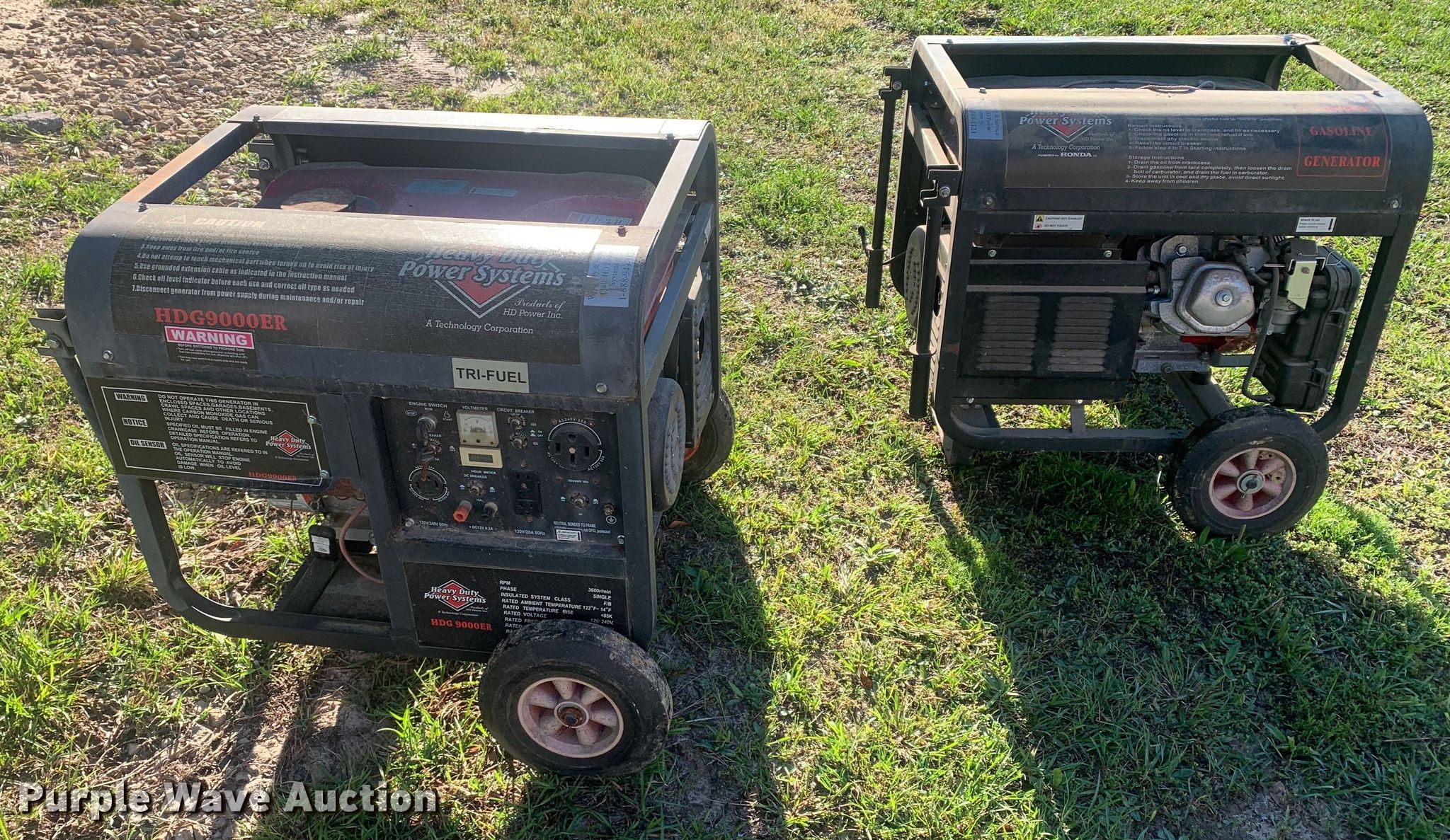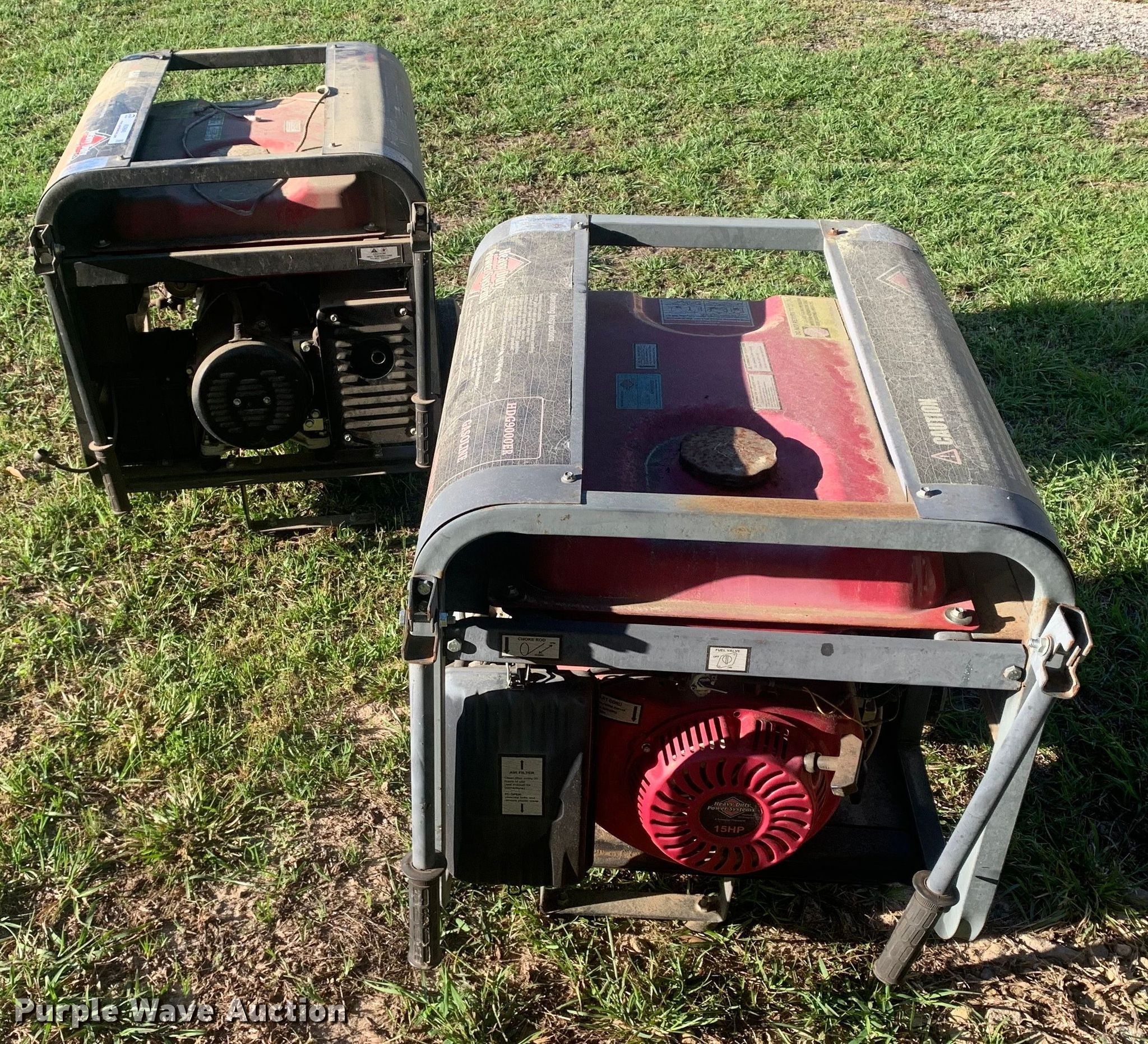 (2) generators. Heavy Duty Power HDG9000ER. Hours: 37 on meter. Engine Heavy Duty Power 4202GD, Displacement: 420cc, Cylinders: 1, Fuel type: Gas, LPG, Natural gas, HP: 15. Features Generator Heavy Duty Power HDG9000ER, Watts: 9,000, Phase: Single, Backup start, Electric start, Fuel tank. Notes Dead battery. Heavy Duty Power HD8000GE Hours: 1 on meter. Engine Honda GX390, Displacement: 389cc, Cylinders: 1, Fuel type: Gas, HP: 13, kW: 8.7. Features Generator Heavy Duty Power HD8000GE, Watts: 8,000, Phase: Single, Backup start, Electric start, Fuel tank. Notes Engine turns over but does not start, Dead battery, Unknown operating condition. Tyler County, TX. 201 Veterans Way. Woodville, TX 75979