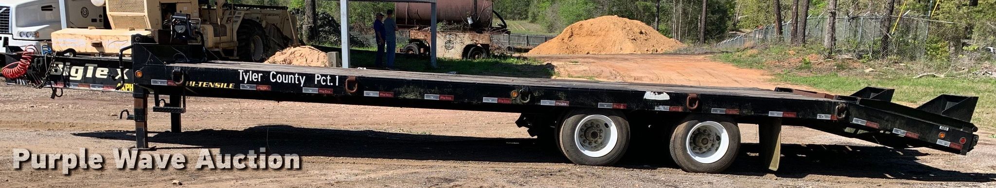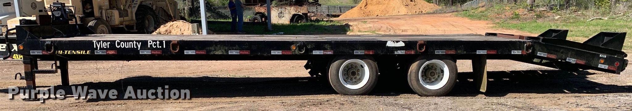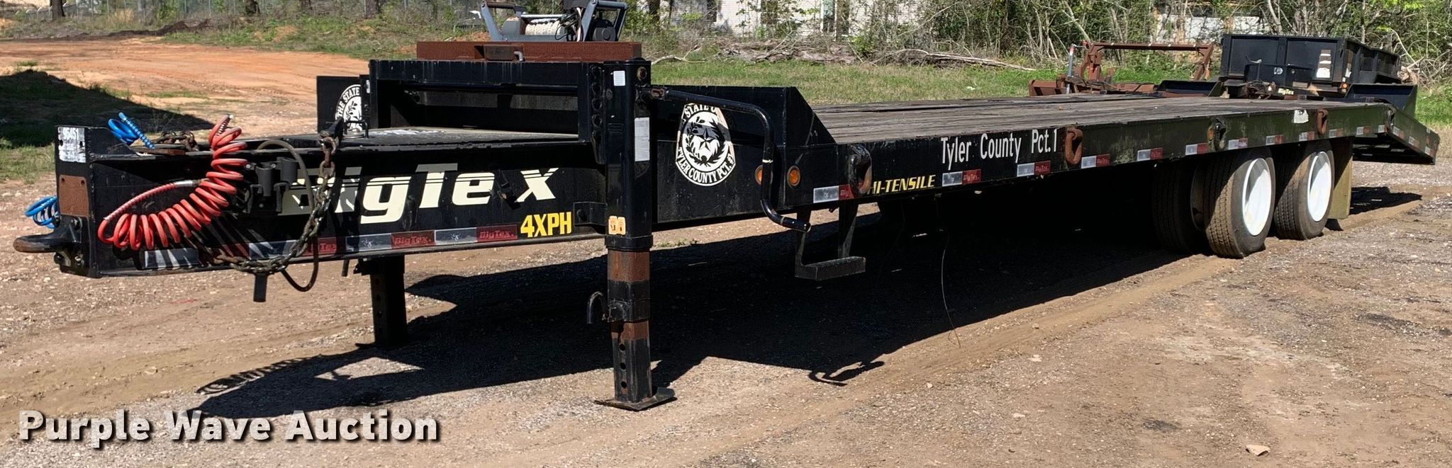2016 Big Tex 4XPH-25+5 equipment trailer. VIN: 16VHX2521G2095451. Dimensions Overall: 37' L x 8' 6" W, Deck: 25' L x 8' 6" W, Deck height: 34", Tail length: 5', Ramps: Manual Length: 4' 7". Features Deck type: Steel, Wood, Winch Mile Marker SEC12, Capacity: 12,000 lbs, Hydraulic controls: Manual. Chassis Hitch: Pintle, Landing gear: Dual, Suspension: Spring, Brakes: Air, Axles: Tandem, GVWR: 48,000 lbs, GAWR: 18,160 lbs. Tires Steel wheels, Size: 215/75R17.5. Texas title. Tyler County, TX. 179 County Road 4260. Woodville, TX 75979