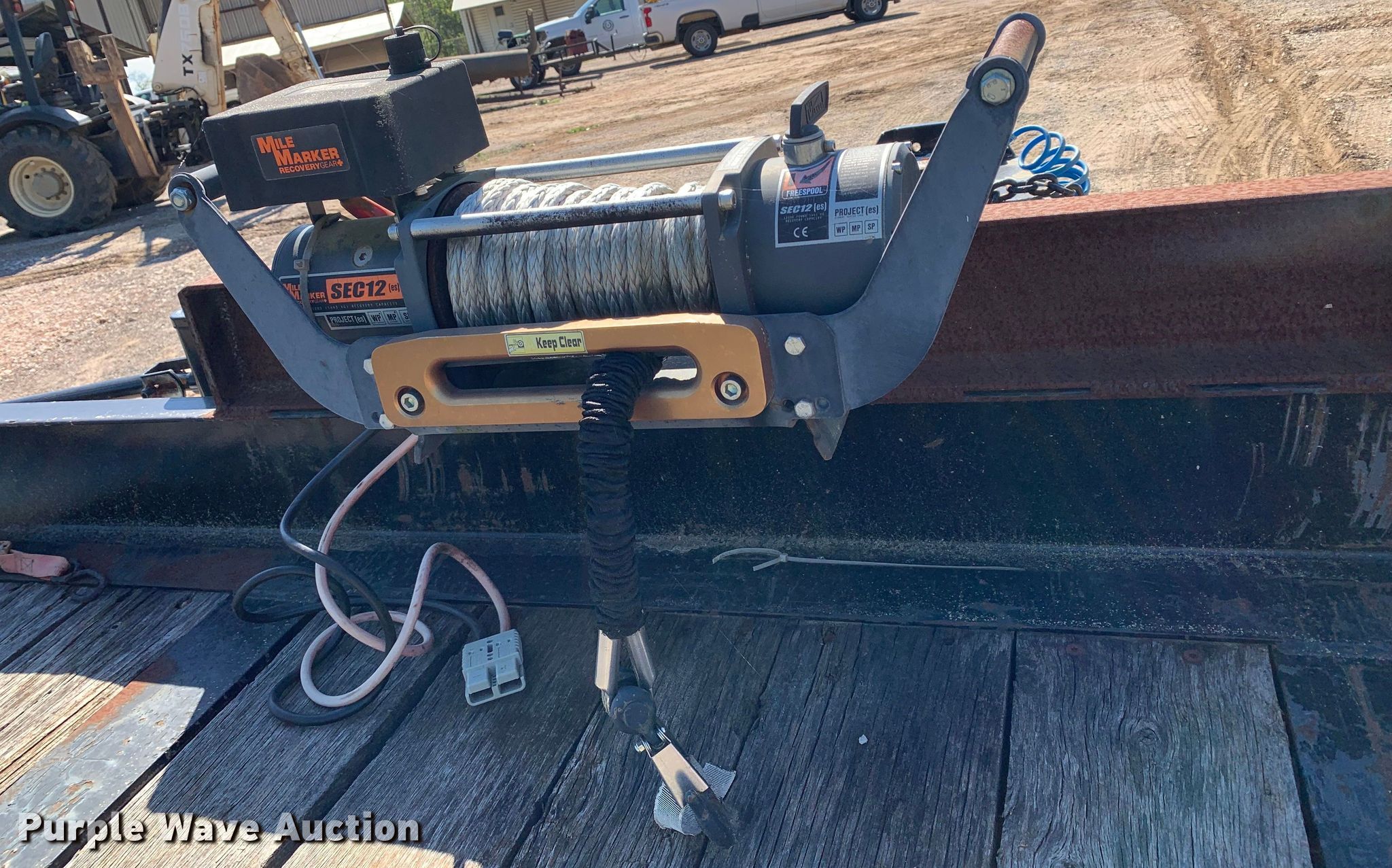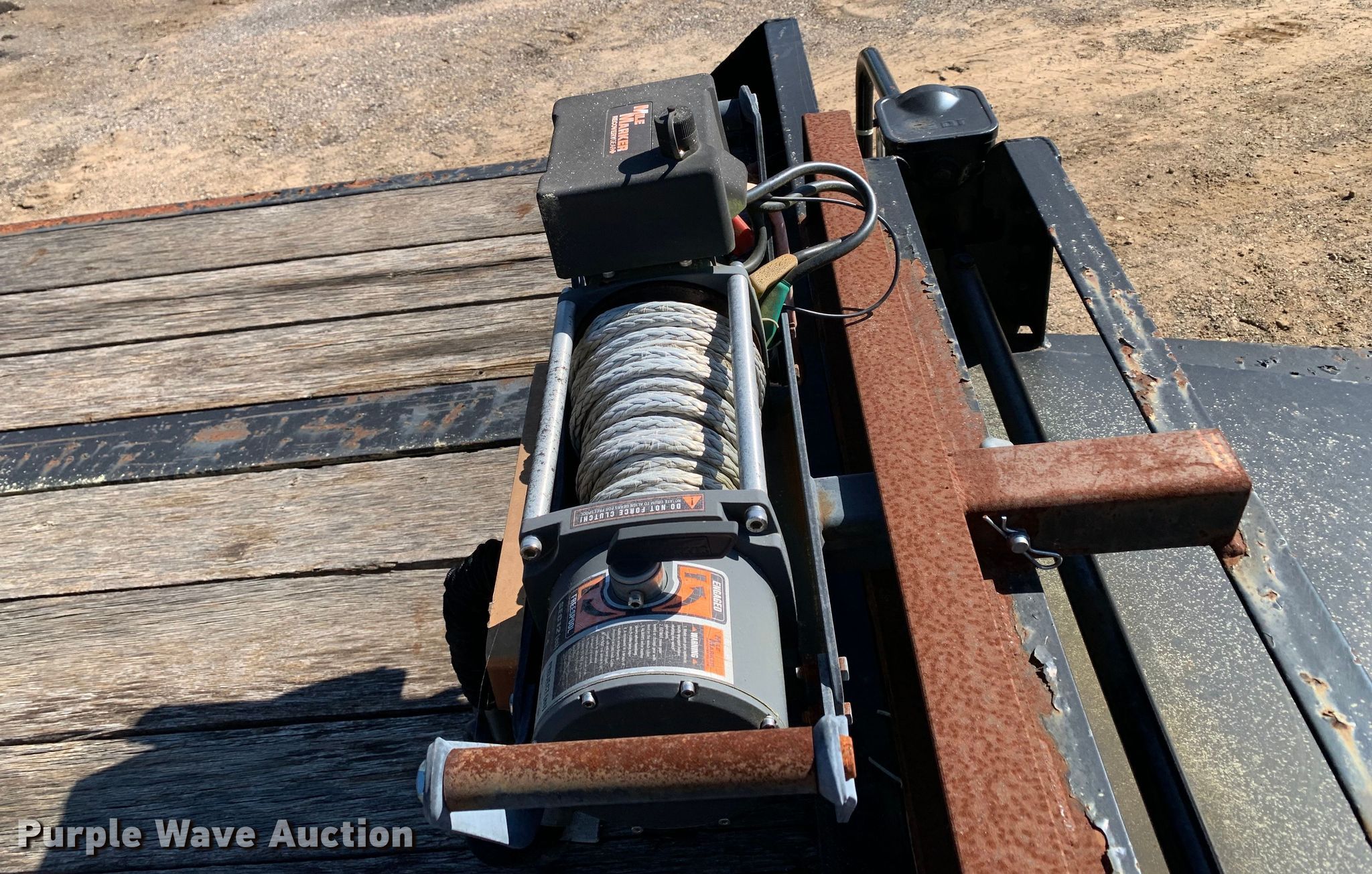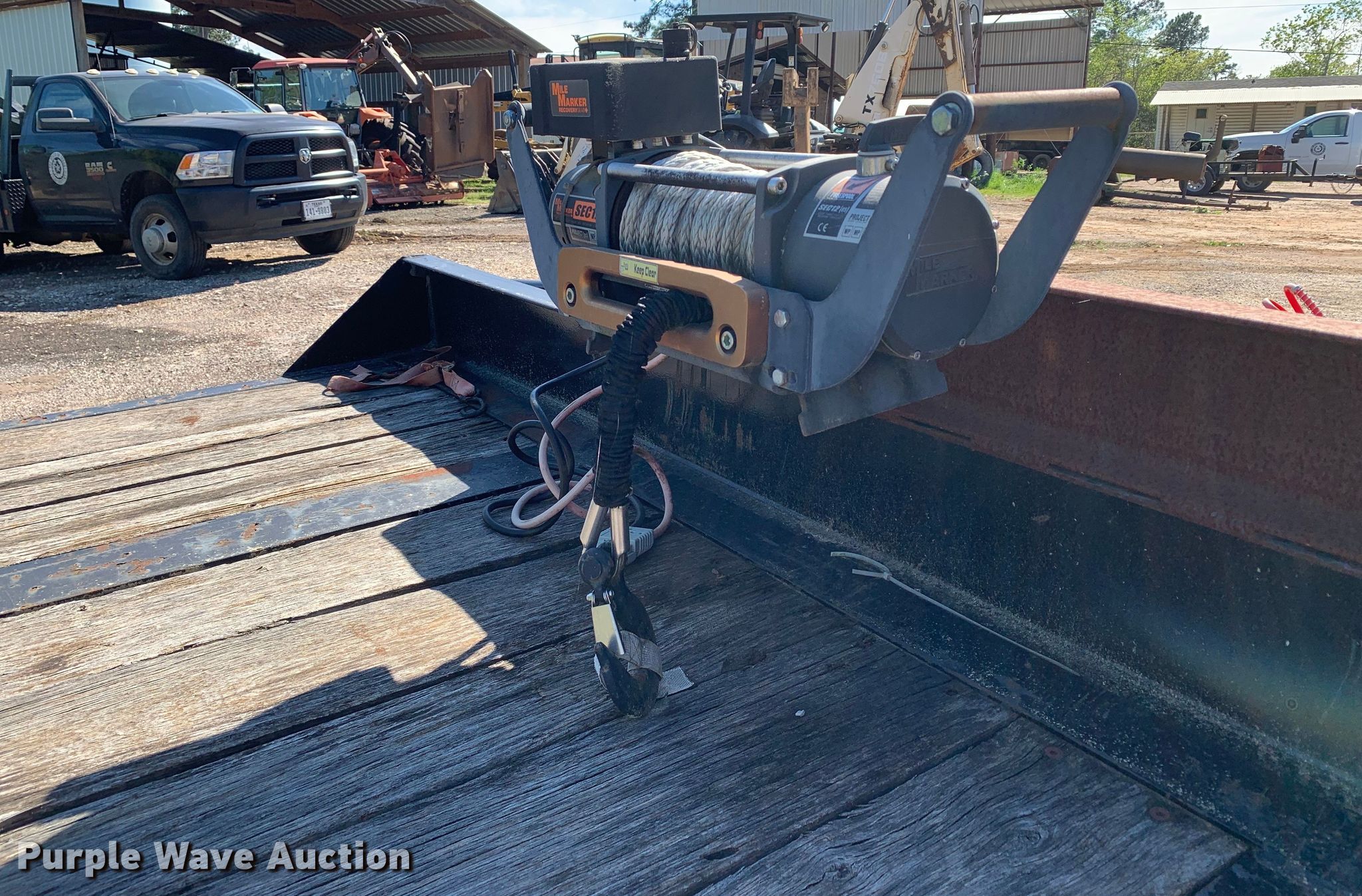 2016 Big Tex 4XPH-25+5 equipment trailer. VIN: 16VHX2521G2095451. Dimensions Overall: 37' L x 8' 6" W, Deck: 25' L x 8' 6" W, Deck height: 34", Tail length: 5', Ramps: Manual Length: 4' 7". Features Deck type: Steel, Wood, Winch Mile Marker SEC12, Capacity: 12,000 lbs, Hydraulic controls: Manual. Chassis Hitch: Pintle, Landing gear: Dual, Suspension: Spring, Brakes: Air, Axles: Tandem, GVWR: 48,000 lbs, GAWR: 18,160 lbs. Tires Steel wheels, Size: 215/75R17.5. Texas title. Tyler County, TX. 179 County Road 4260. Woodville, TX 75979