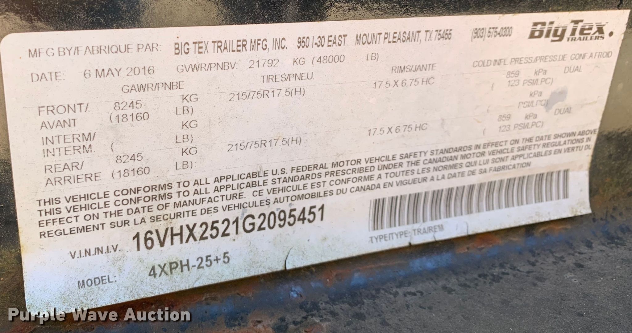 Purple Wave is selling a used Equip. Trailer in Texas. This item is a 2016 Big Tex 4XPH-25+5 equipment trailer with the following: VIN: 16VHX2521G2095451
