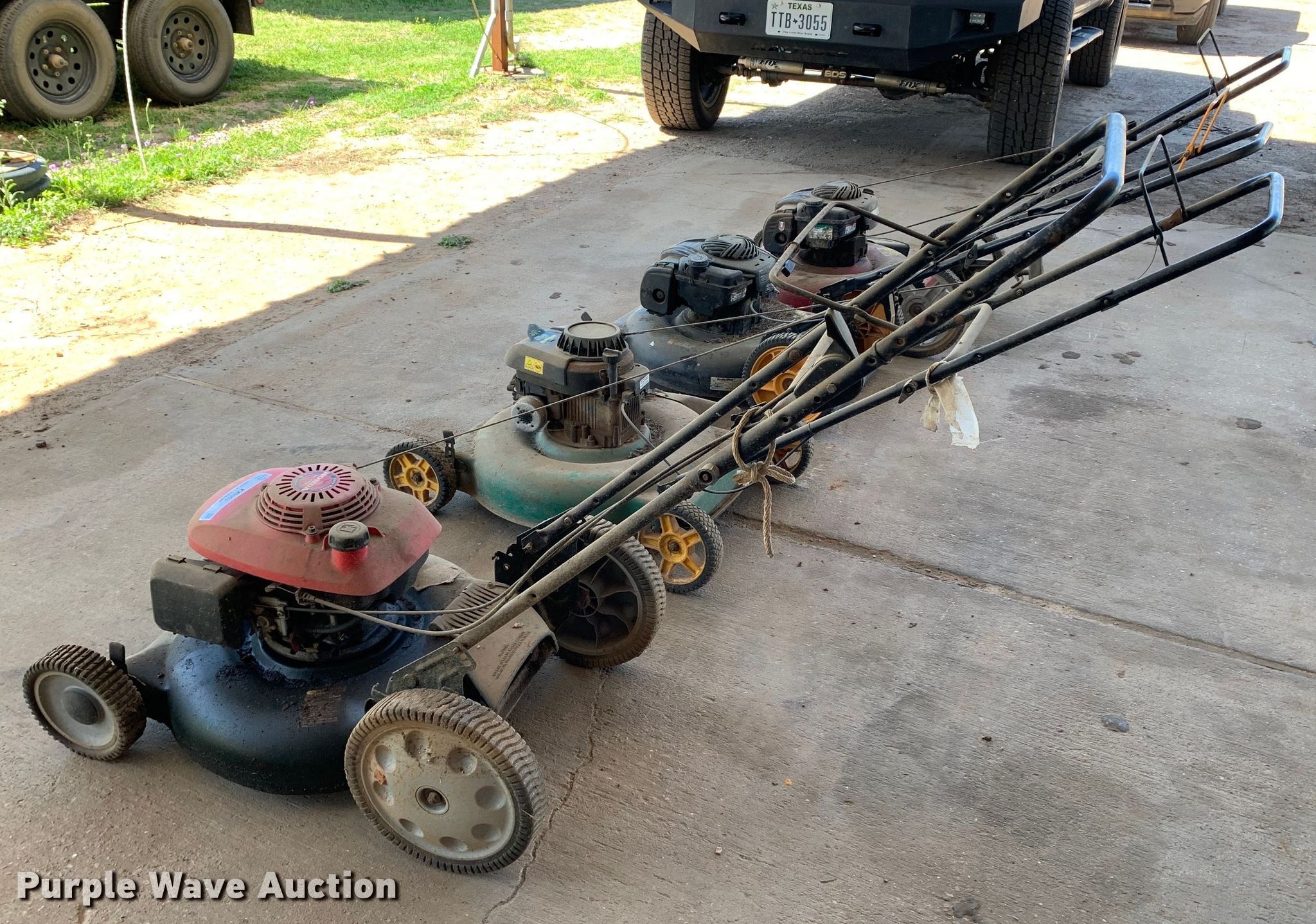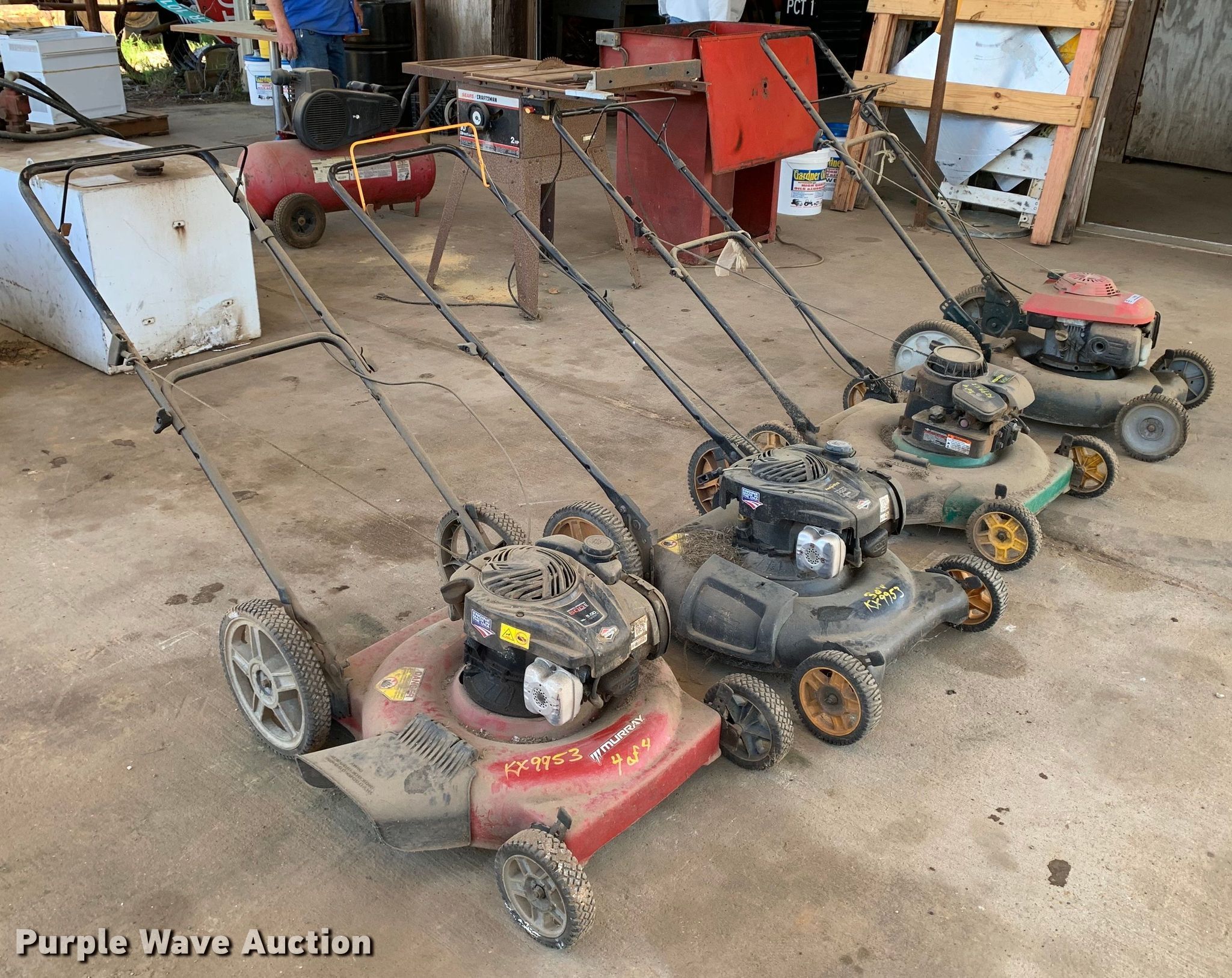 Purple Wave is selling a used Lawn Mower in Texas. This item is a (4) push mowers with the following: Murray, Engine: Briggs & Stratton 500E, Fuel type: Gas, Poulan, Engine: Briggs & Stratton 500E, Fuel type: Gas, Weedeater, Engine: Briggs & Stratton, Fuel type: Gas, Craftsman, Engine: Honda, Fuel type: Gas, Non-operational units