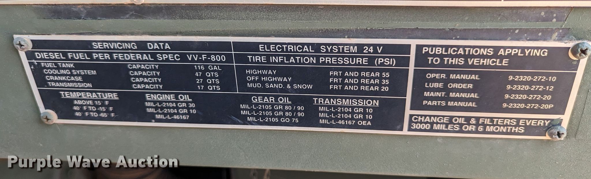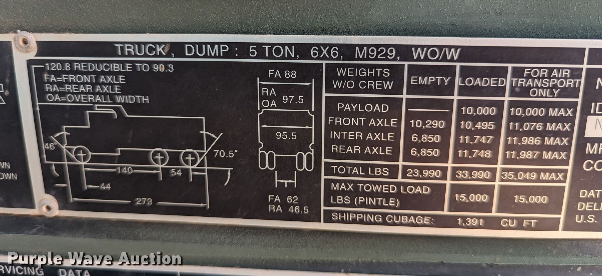 1985 AM General M929 dump truck. Miles: 3,695 on odometer, Hours: 165 on meter, VIN: NL0A6TC52900139, Unit #: D302-264. Engine Cummins NHC-250, Serial: 11133254, Displacement: 855 C.I.D., Cylinders: 6, Fuel type: Diesel, HP: 240. Transmission Automatic. Chassis Six wheel drive, Axles: Tandem, Differential lock: Full, Suspension: Spring, Brakes: Air, PTO, Wheelbase: 167". Interior Heat. Features Dump bed 10' 6" L x 96" W, Side height: 24", Bed type: Steel, Ram: Single. Tires Size: 11.00R20. Notes Parts missing, Non-operational unit. Oklahoma title. Title distribution may be delayed up to 30 days from verification of funds. Cleveland County. 14701 S Westminster Rd. Oklahoma City, OK 73165
