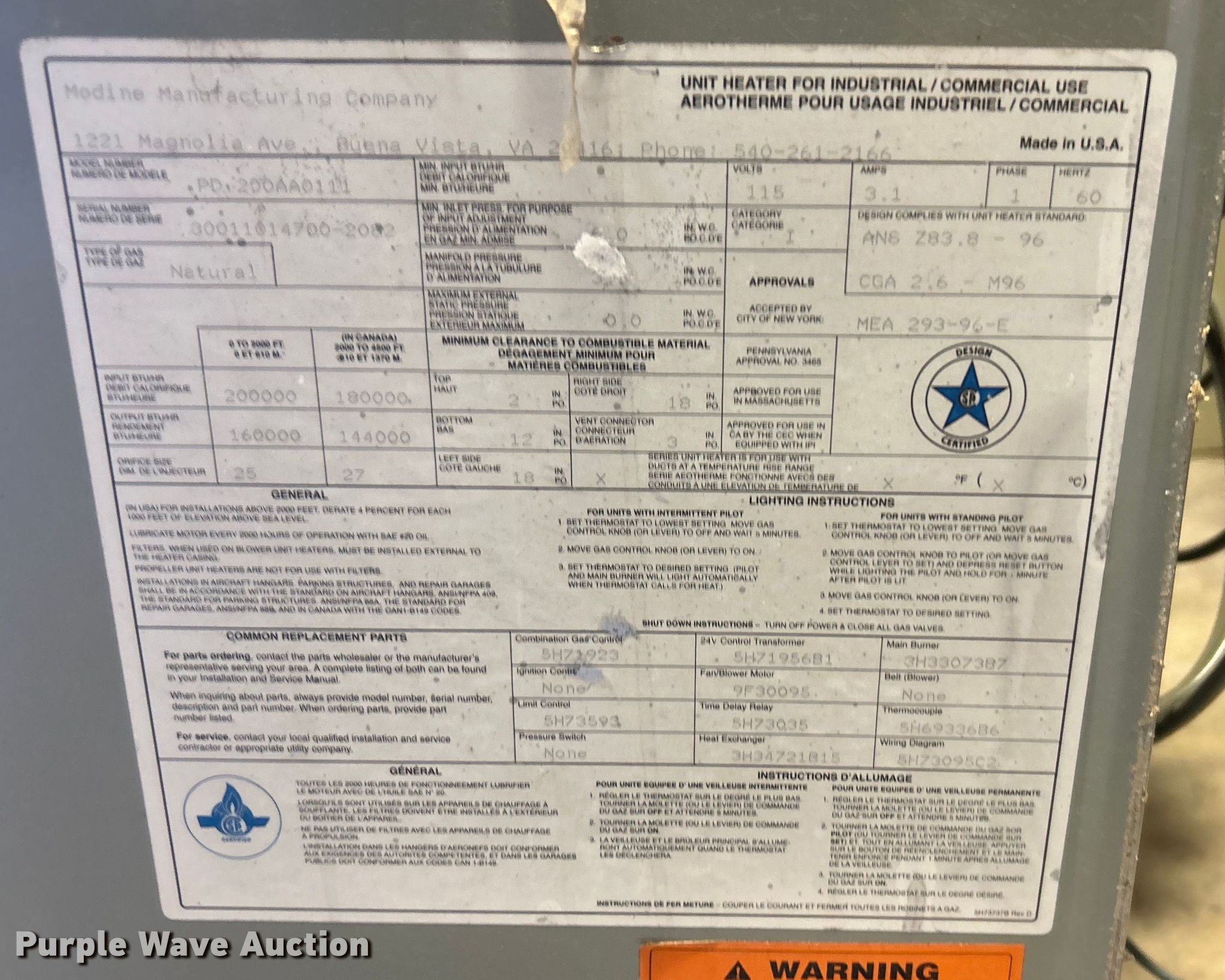 (2) Modine heaters. Modine PD200AA0111. Serial: 30011014700-2082, Fuel type: Natural gas, Phase: Single, Volts: 115, BTU input: 200,000, BTU output: 160,000. Modine PD200AA0111 Serial: 30011010401-5097, Fuel type: Natural gas, Phase: Single, Volts: 115, BTU input: 250,000, BTU output: 200,000. Tulsa Housing Authority. Tulsa, OK 74115
