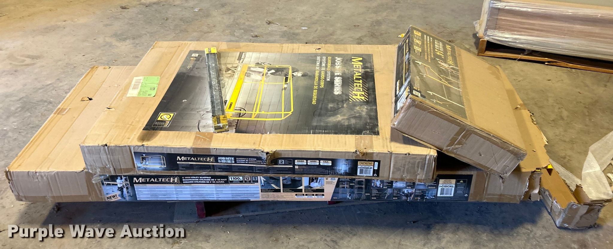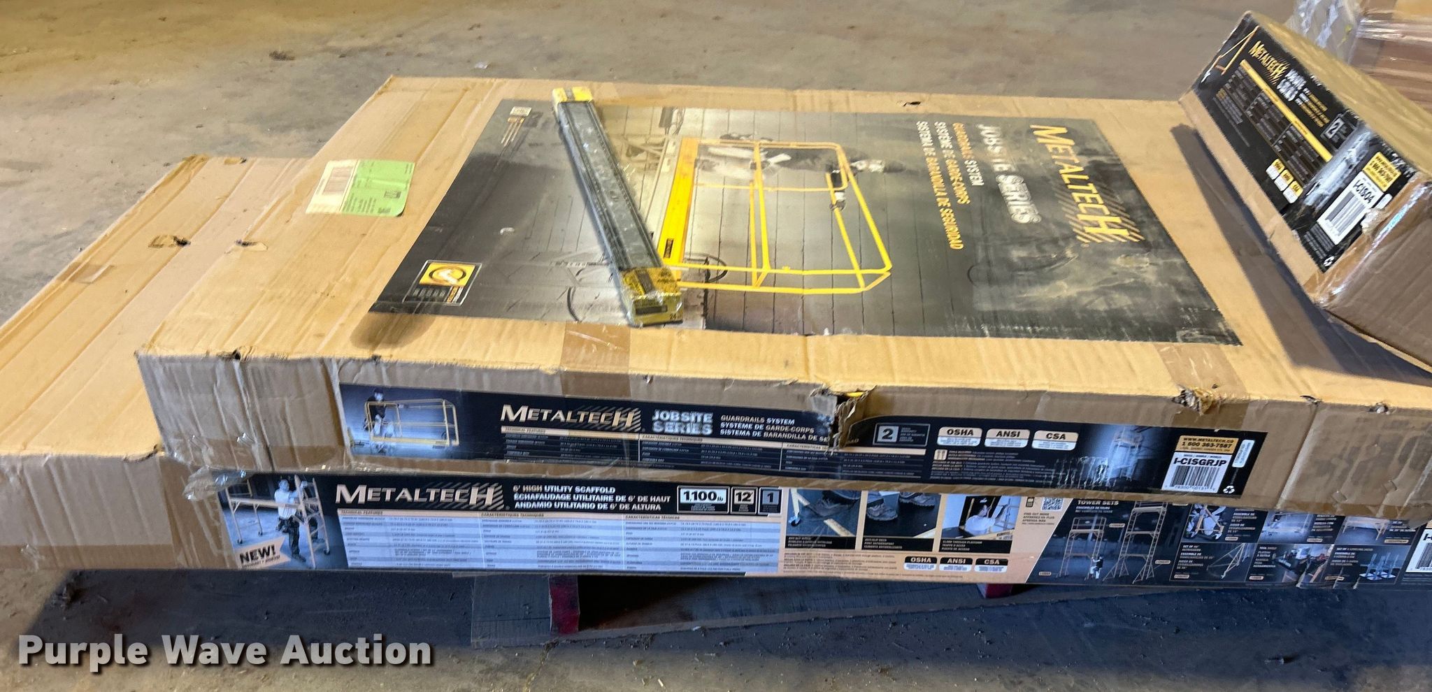 Purple Wave is selling a used Tools in Oklahoma. This item is a (2) MetalTech 6' Baker scaffolding sets with the following: 74" L x 29" W x 71" H, Load capacity: 1,100 lbs, Working heights: 27" to 73", Guard rail system, 14" outriggers with casters, Step stool, (2) shelving sections