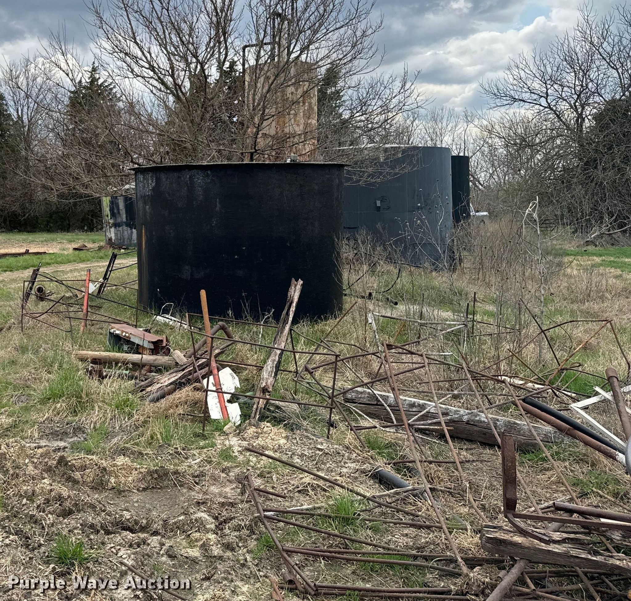 Oilfield equipment. Unit #: 2023FP3-04 - Hattan, (3) steel tanks Capacity: Approx. 200 BBL, Gun barrel tank Capacity: Approx. 100 BBL, Fiberglass tank Capacity: Approx. 100 BBL, (6) pipe panels Length: approx. 15' L, 2" plumbing, (2) 4 1/2" well heads, (2) casings Approx. 3' L, (2) 4.5" casings Approx. 18" L, Approx. 19 joints of 2 3/8" tubing Length: Approx. 32', Approx. 26 joints of 3/4" rods Length: Approx. 25', Approx. 20 joints of 2 7/8" tubing Length: Approx. 31'. Tanks have not been cleaned, possible residue. Unknown amount or type of contents in tanks. KCC Conservation Division Oilfield Salvage Disposal. Independance, KS 67301