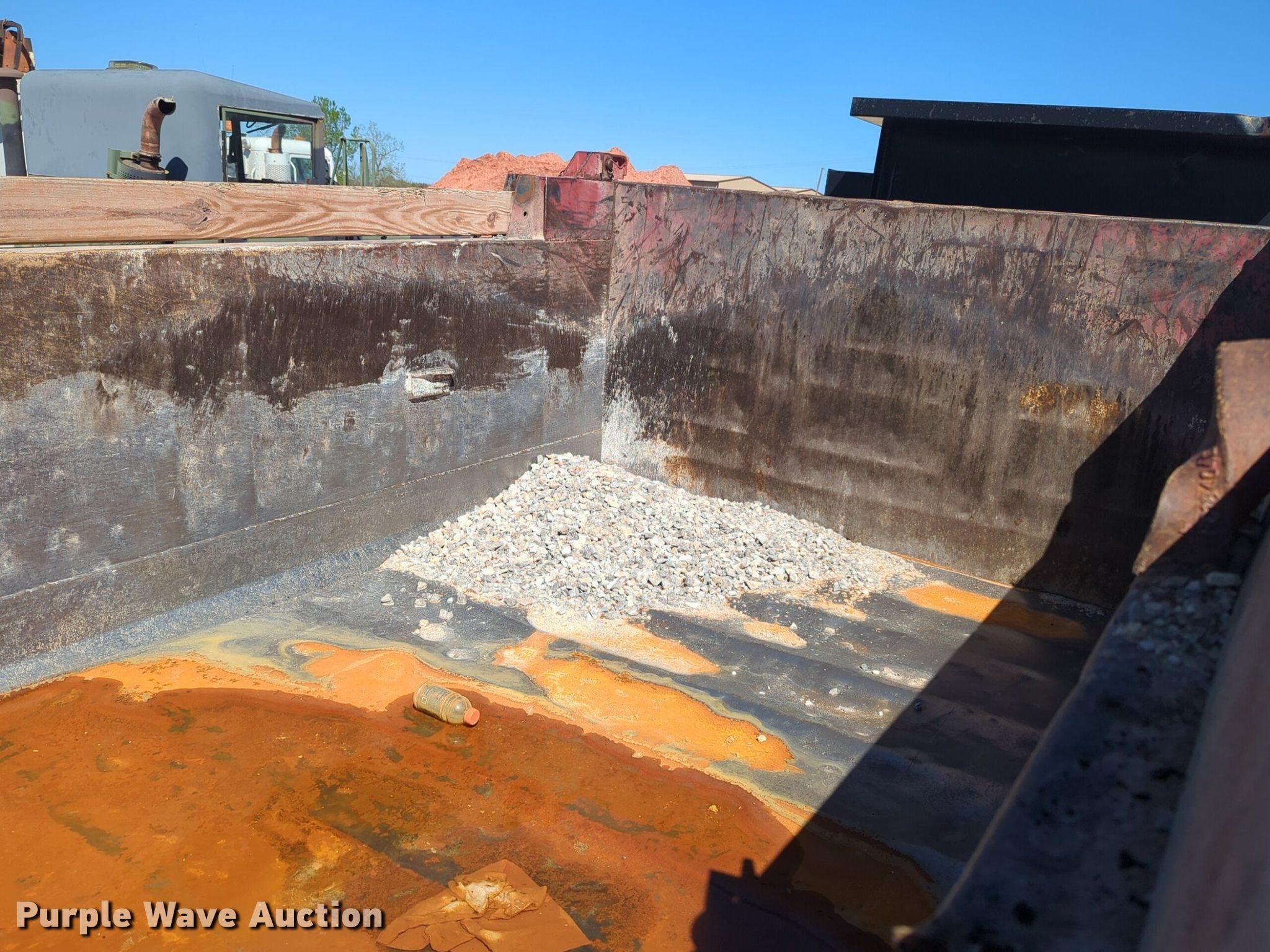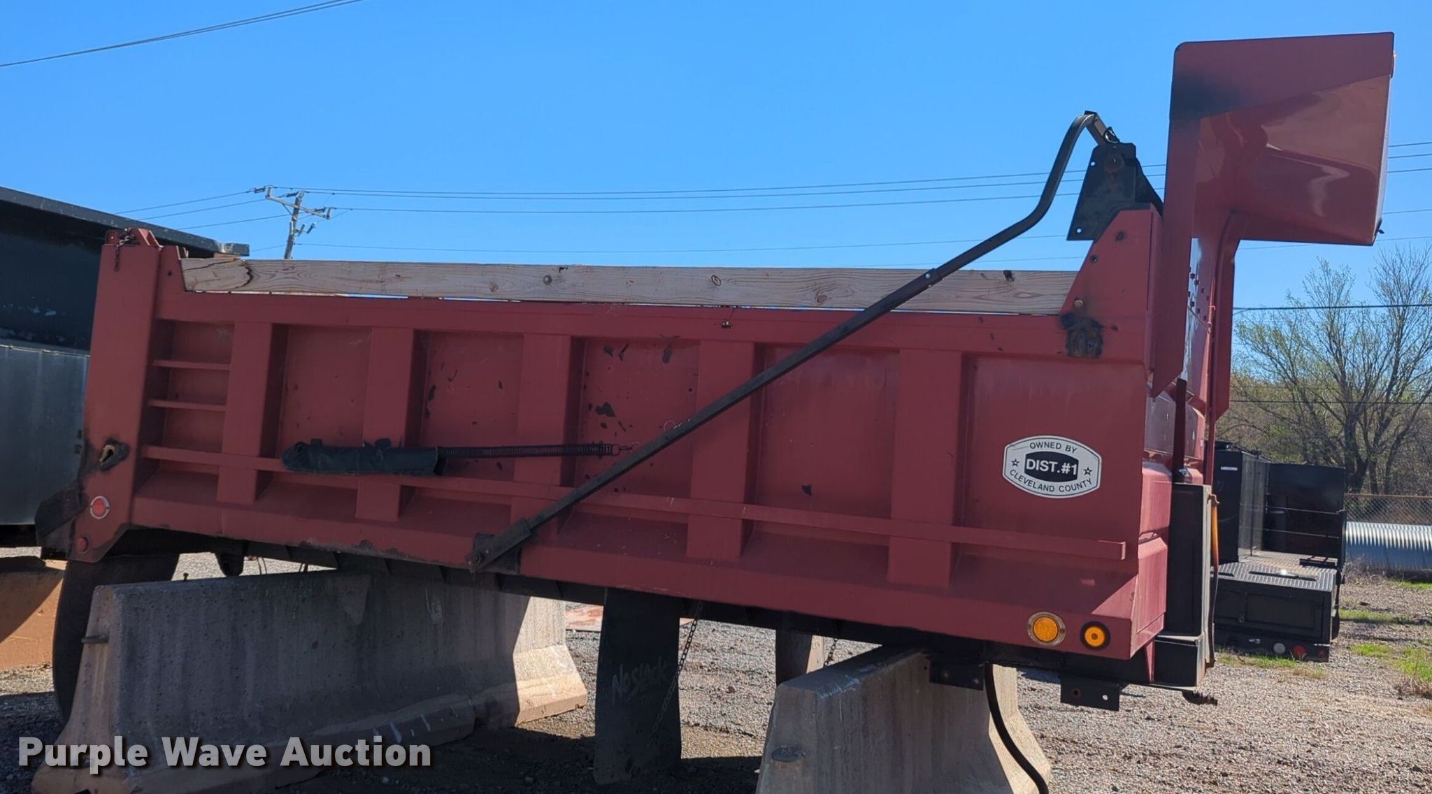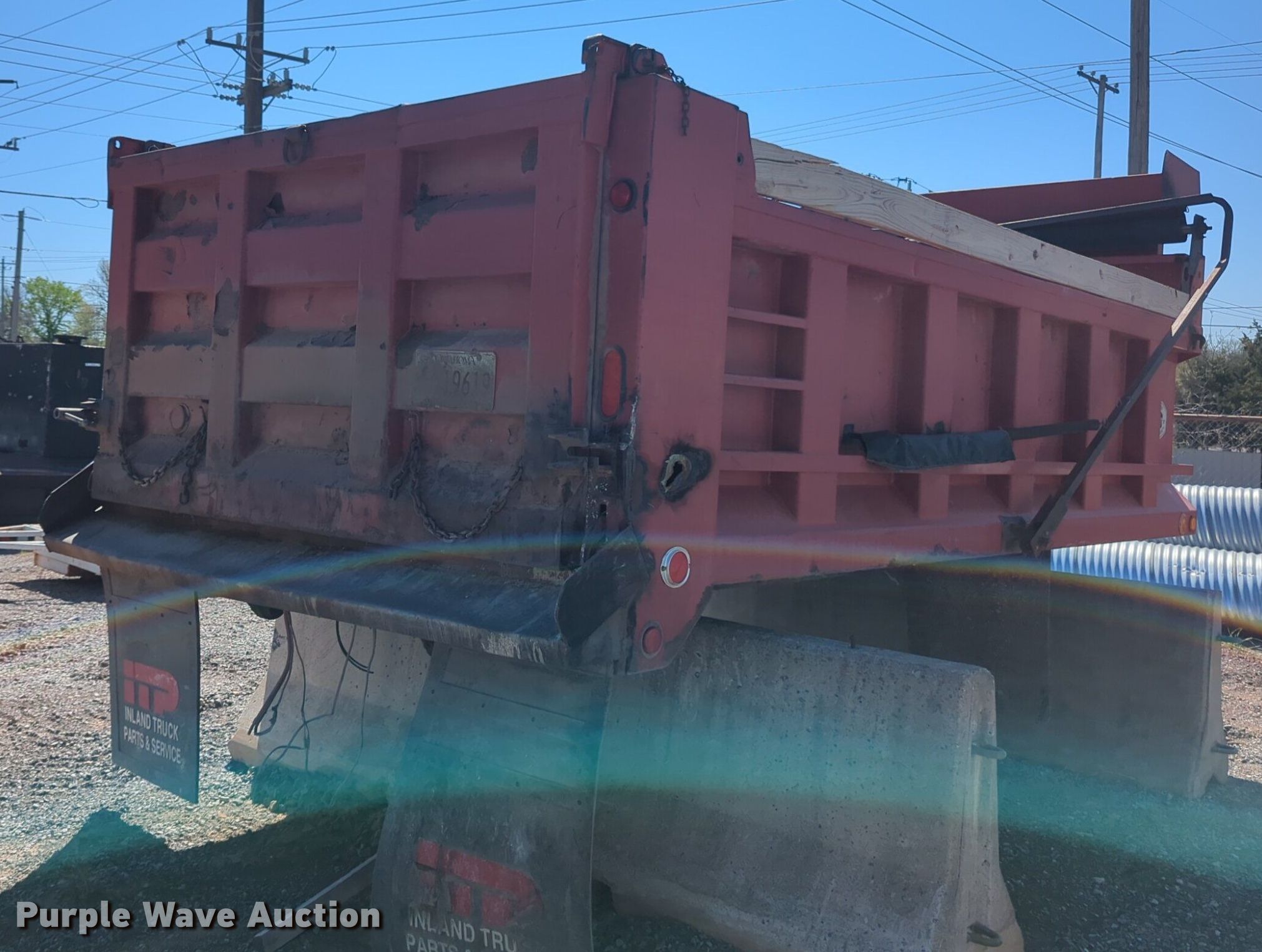 Purple Wave is selling a used Truck Part and Attach. in Oklahoma. This item is a Goodwin Mfg Co 500T dump bed with the following: 15' L x 96" W, Side height: 40", Side board height: 6", Bed type: Steel, Roll tarp, Ram: Single, End gate: Air operated