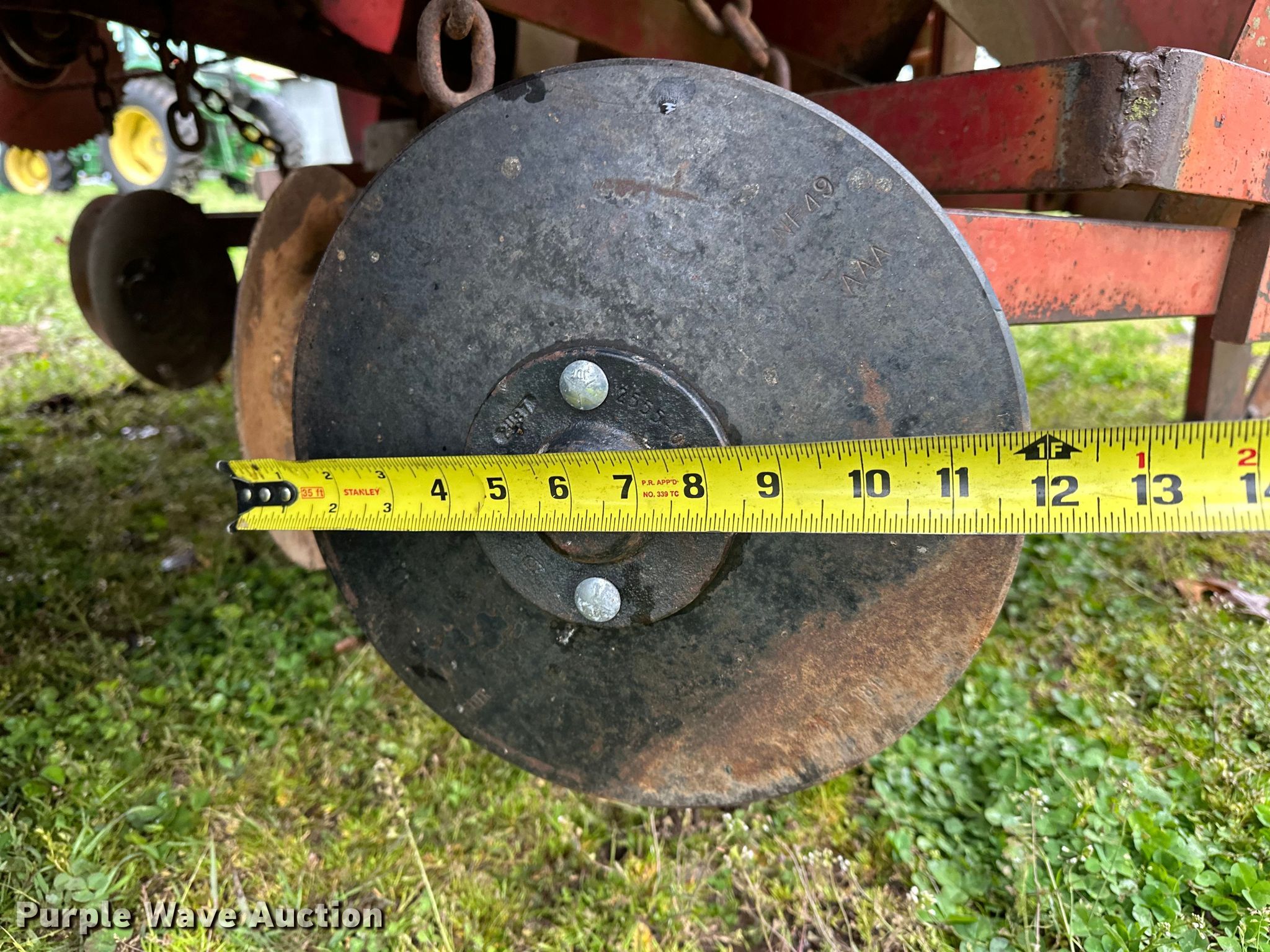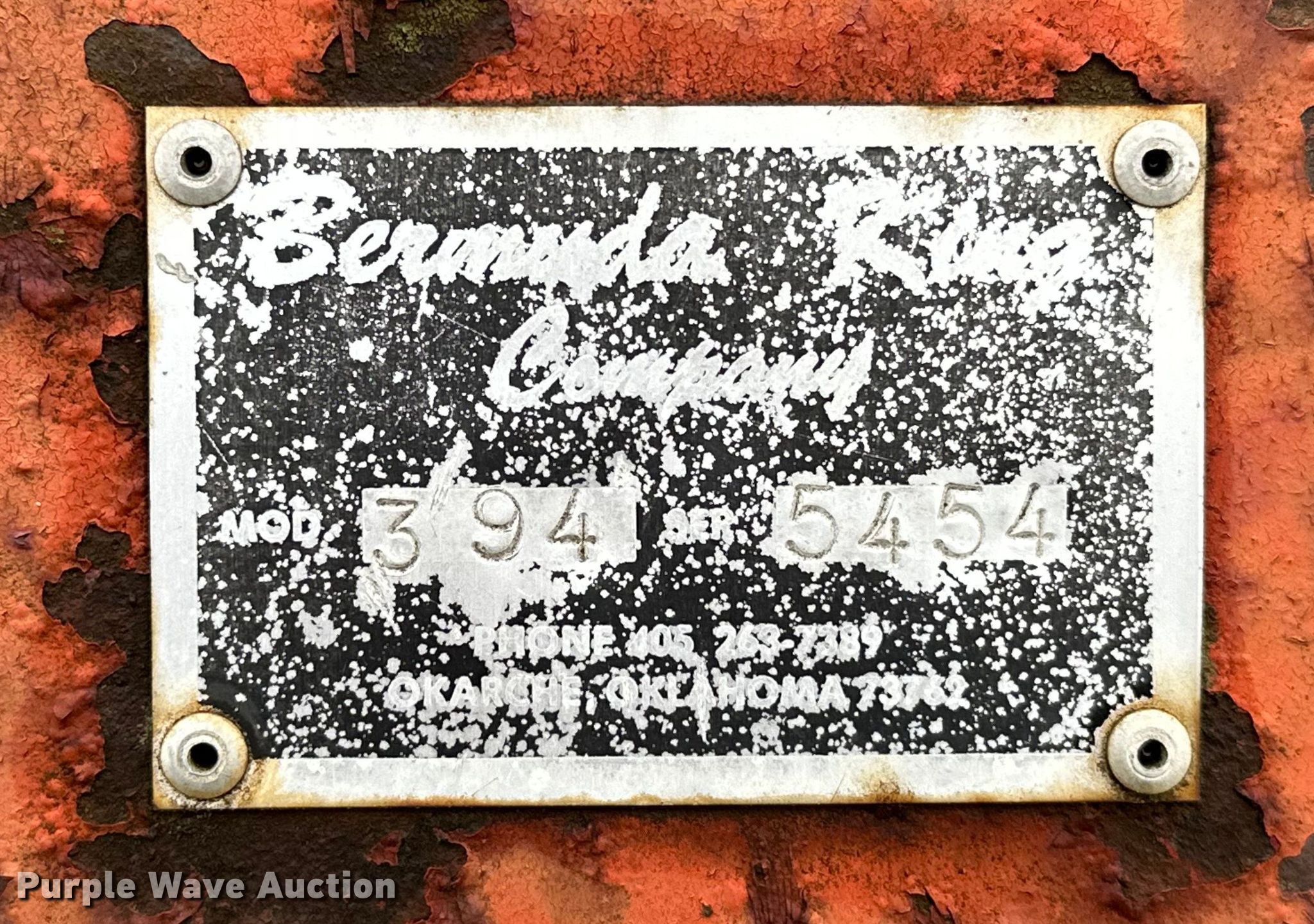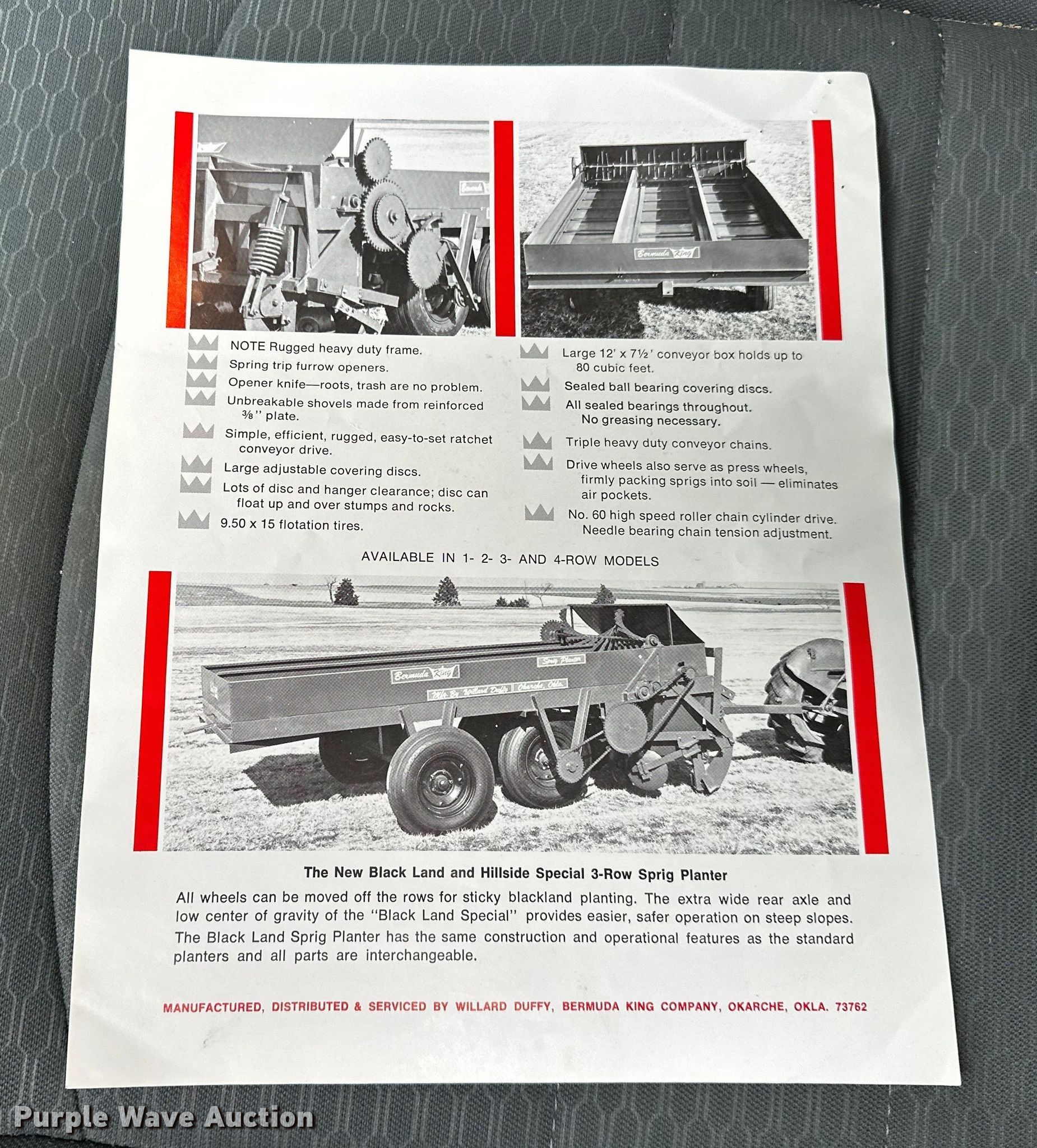 Bermuda King 394 sprig planter. Serial: 5454. Features Frame Rear hitch, Seed delivery Bulk fill system, Row units Meter drive: Ground, Quantity: 3, Down pressure: Spring, Furrow openers: Single, Closing system: Double Type: Cast.. Tires Transport tire size: 11L-15 Quantity: 2, Drive/ outside tire size: 11L-15 Quantity: 3. Notes Feed hopper issues, Drive tire flat. Adair County Conservation District. 468670 Oklahoma 100. Stilwell, OK 74960