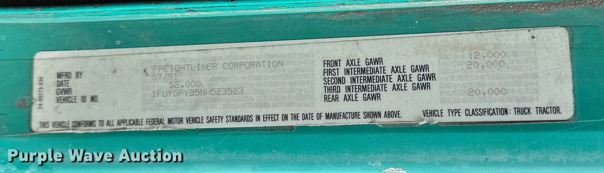 Purple Wave is selling a used Truck Tractor in Oklahoma. This item is a 1992 Freightliner FLD120 semi truck with the following: Miles: 305,182 on odometer, VIN: 1FUYDPYB5NH523523, Unit #: 236, Sale #: 2438-KP