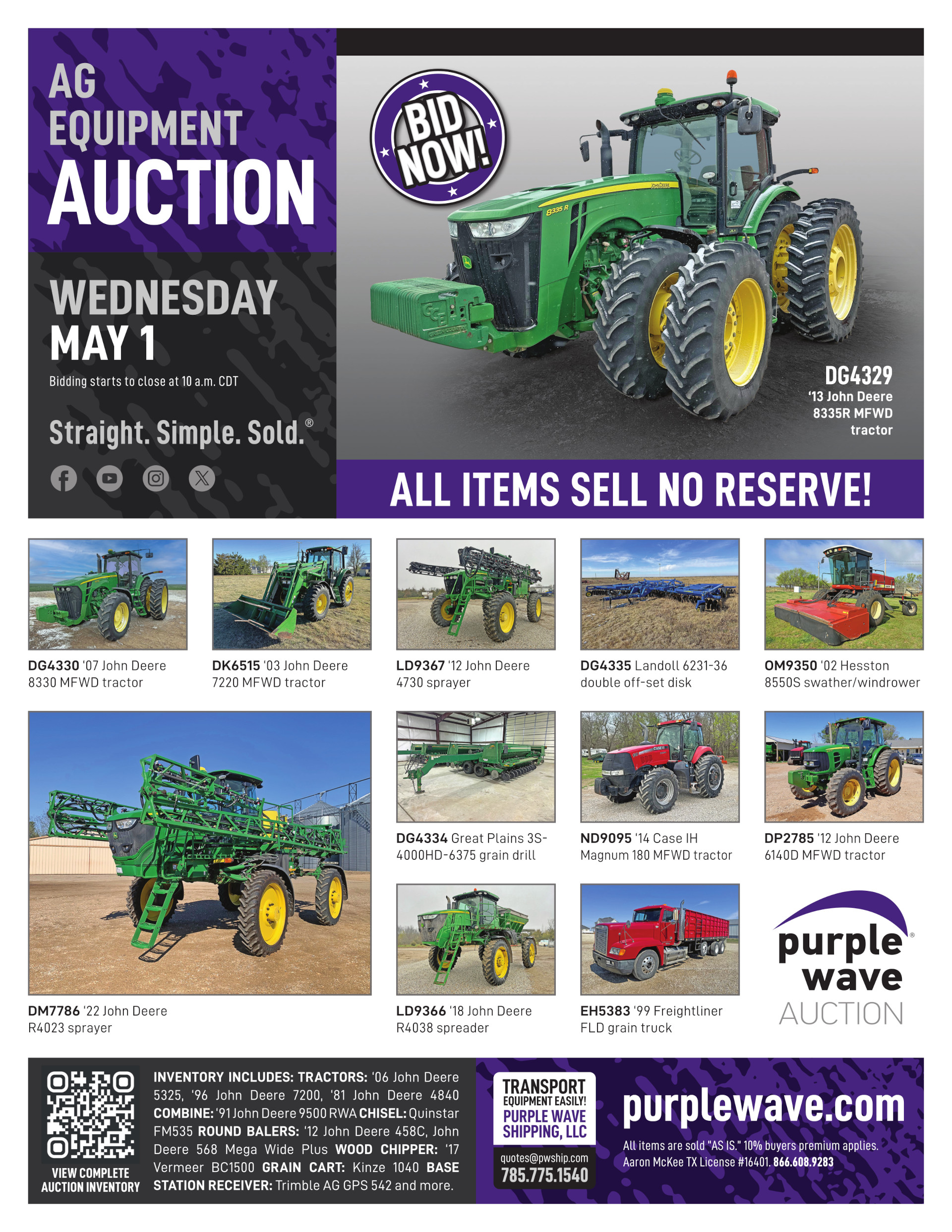 This auction is conducted by Purple Wave, Inc., whose home office is 825 Levee Drive, Manhattan, Kansas. Aaron McKee, Texas auctioneer license # 16401, operates Purple Wave, Inc. Complaints against us may be directed to the Texas Department of Licensing and Regulation, P.O. Box 12157, Austin, Texas 78711, (512) 463-6599. For additional required information, see the attached document.