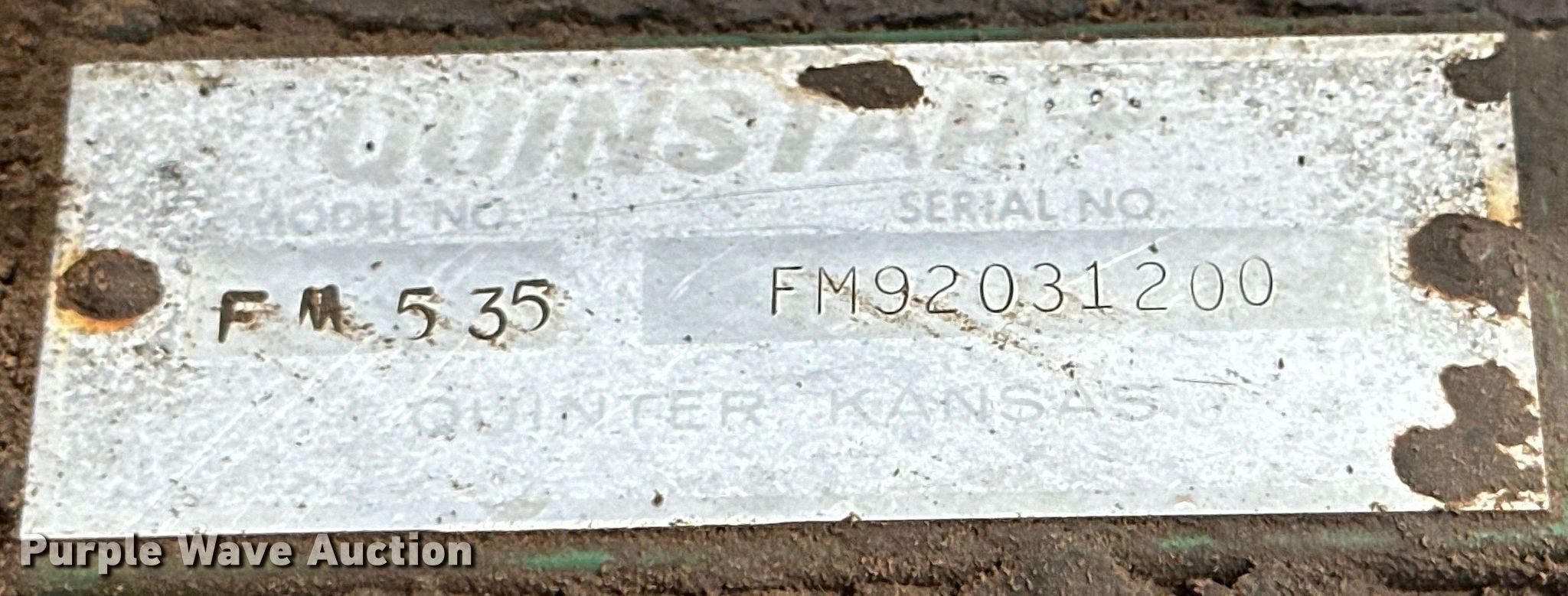 Quinstar FM535 chisel. Overall width: 35', Serial: FM92031200. Features Shanks: 11, Operation Hydraulic lift, Hydraulic fold. Tires Tire size: 12.5-15. Hart Farms. 9200 Farm to Market Road 520. Spearman, TX 79081