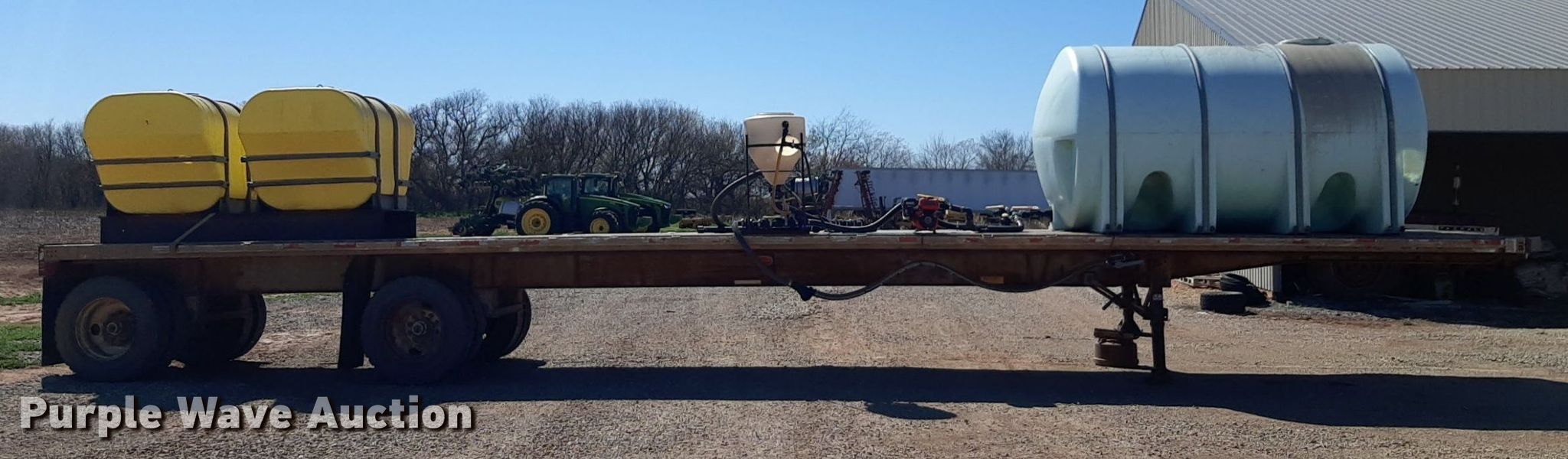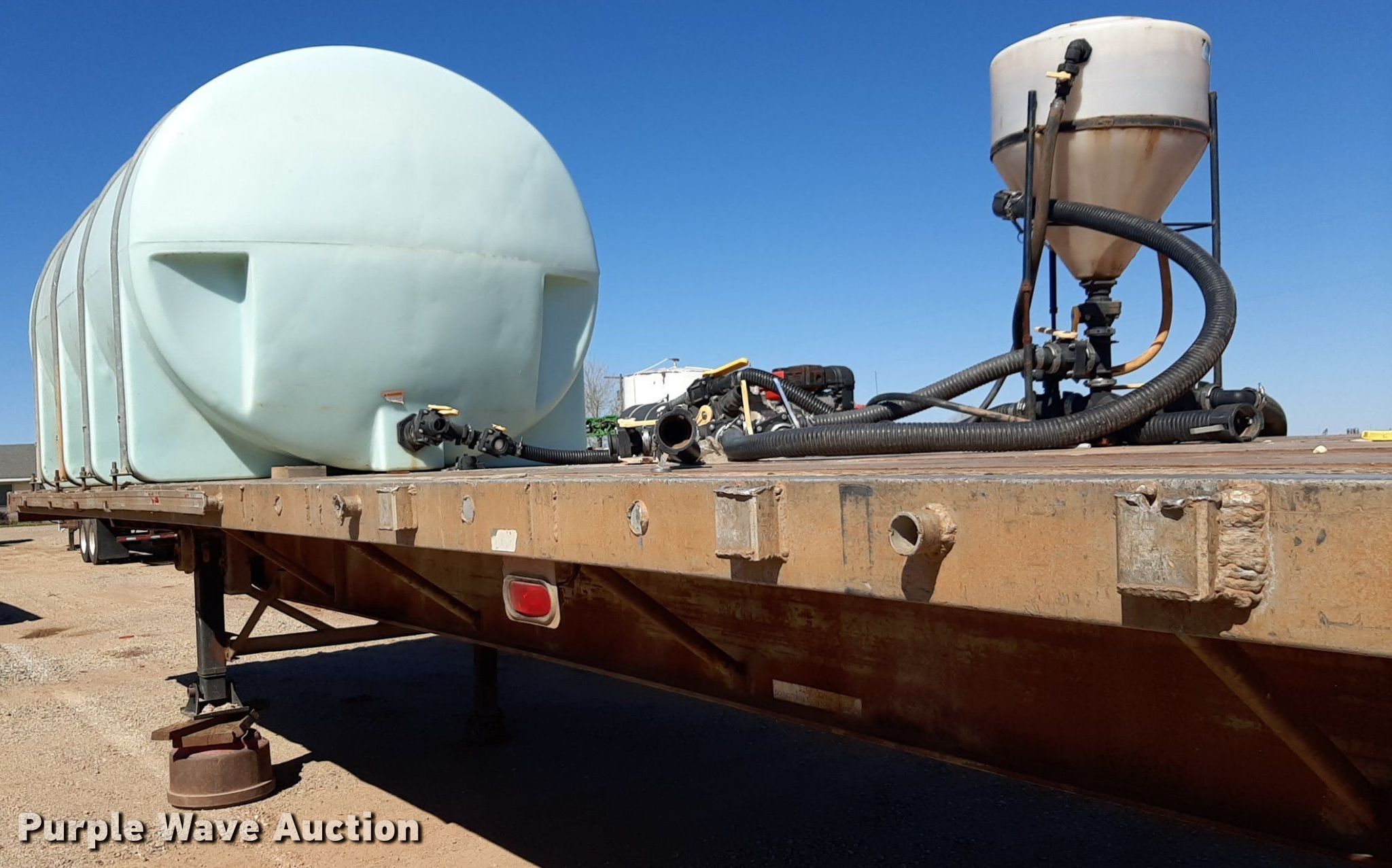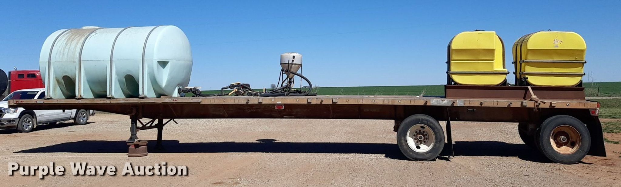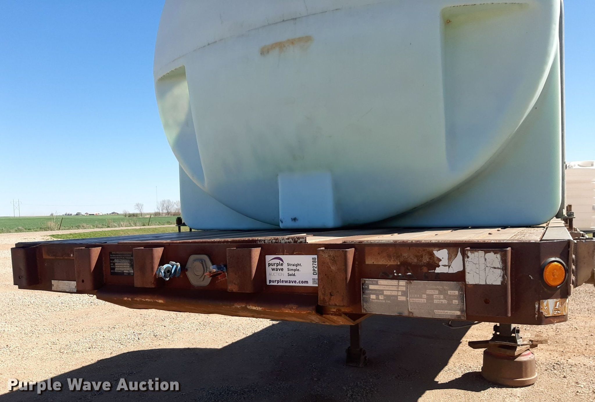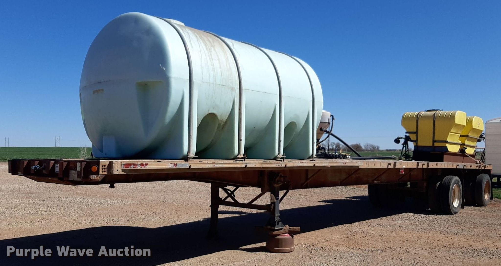 1992 Trailmobile F81T-5JA flatbed trailer. VIN: 1PTF81TR3N9002606. Dimensions Overall: 48' L x 96" W. Features Deck type: Aluminum. Chassis Landing gear: Dual, Suspension: Air, Brakes: Air, Axles: Spread. Features (3) poly tanks Capacity: 3,000 gallons, (2) 450 gallons, Engine Predator, Displacement: 212 cc, Fuel type: Gas. Tires Steel wheels, Size: 11R24.5. Transfer of ownership documentation will be a bill of sale. OKC Farms LLC. Medford, OK 73759