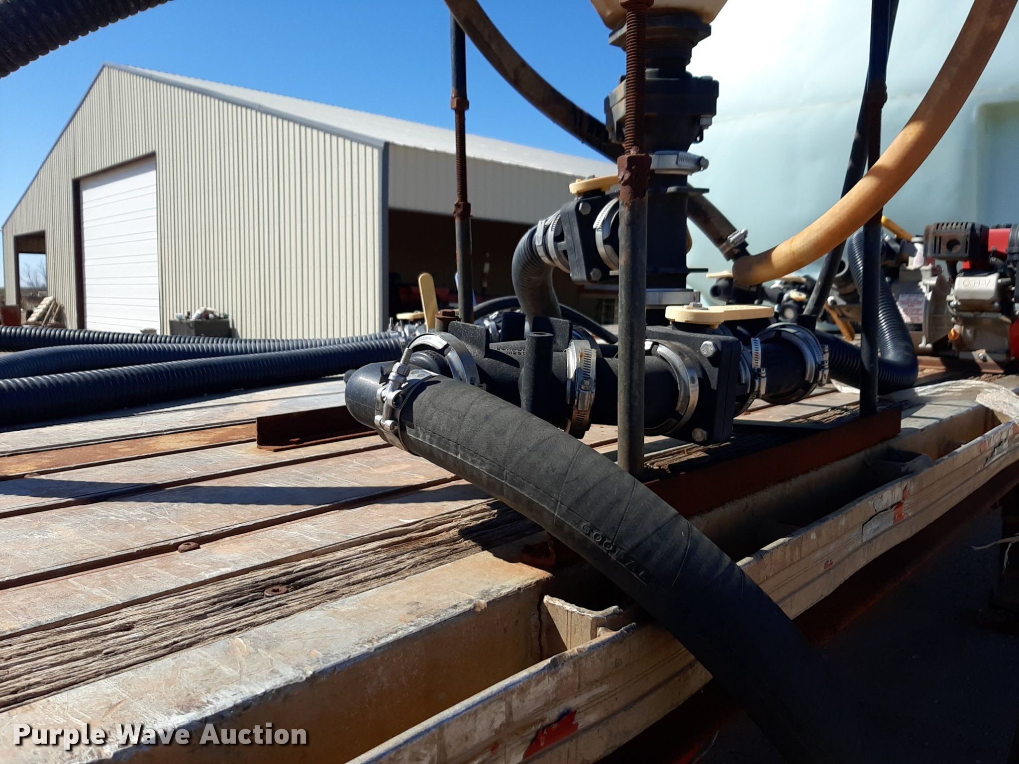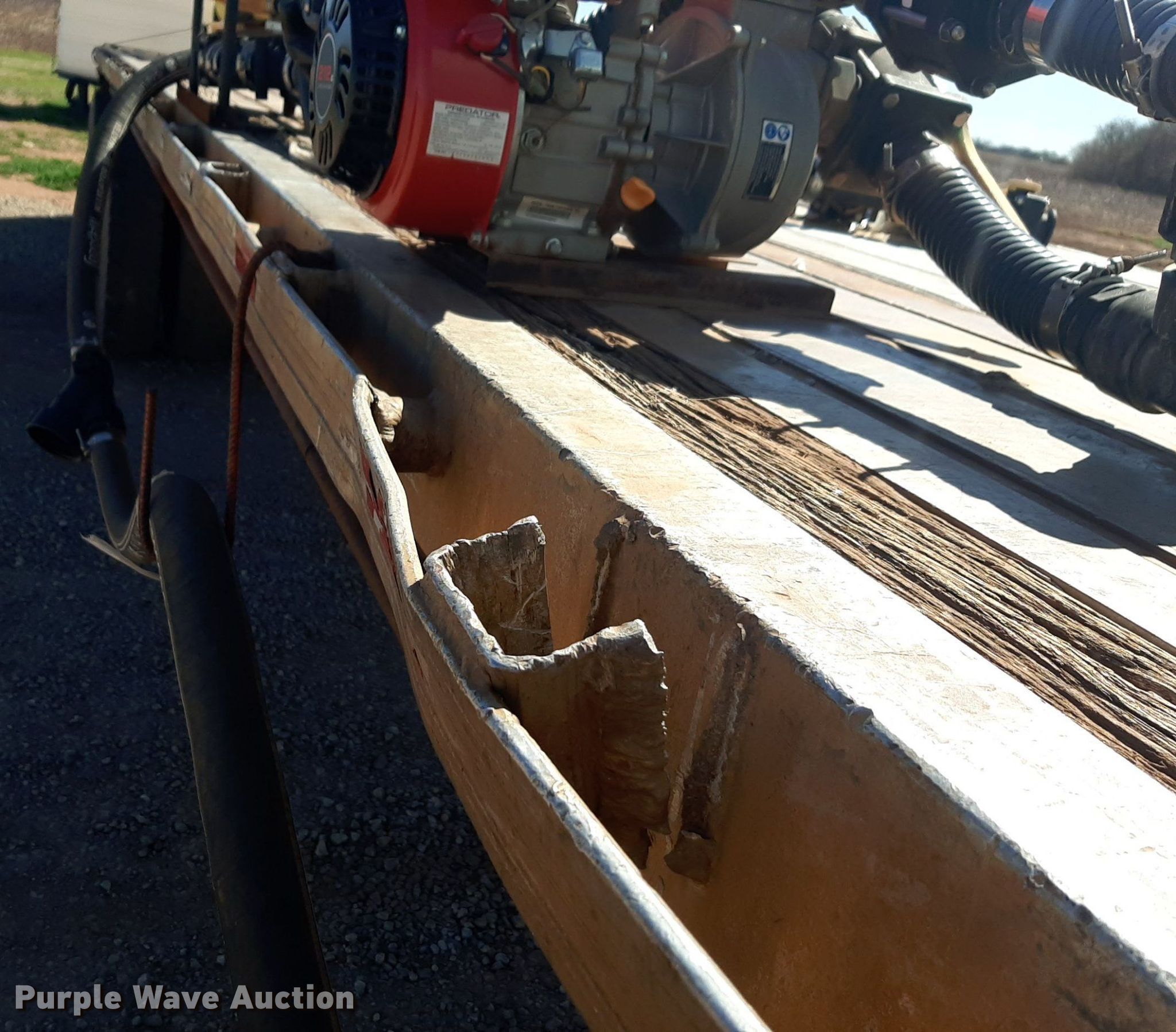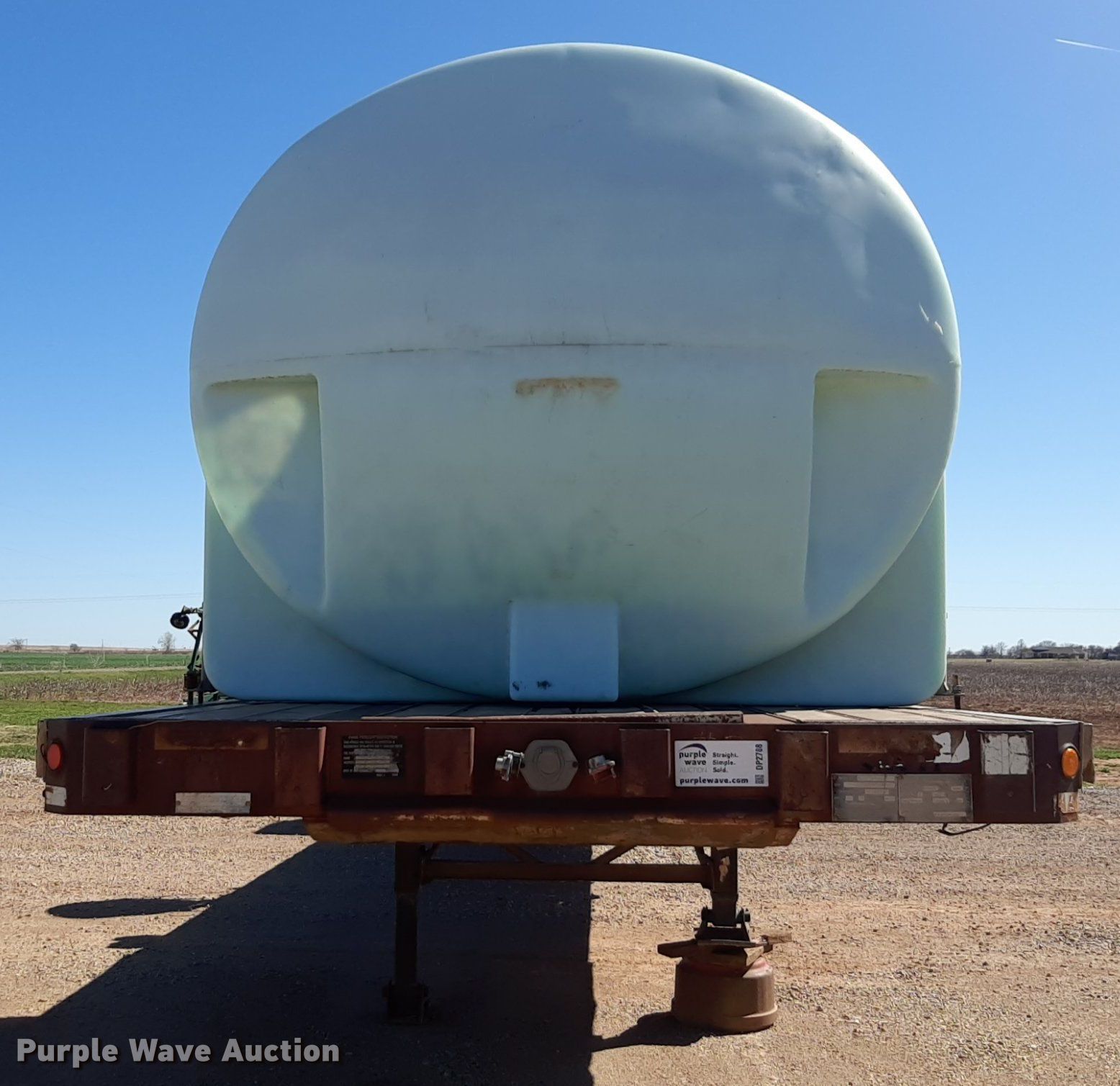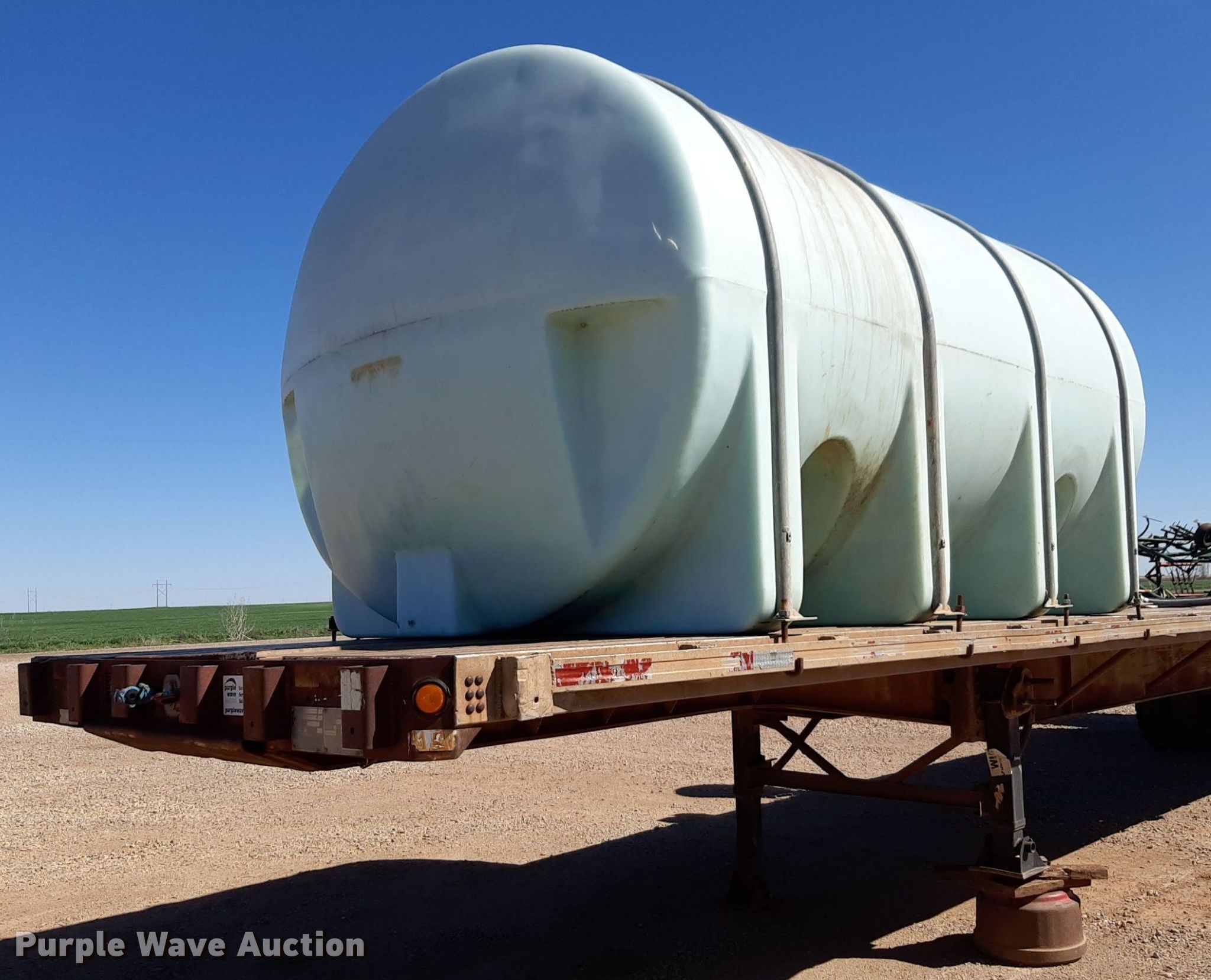 1992 Trailmobile F81T-5JA flatbed trailer. VIN: 1PTF81TR3N9002606. Dimensions Overall: 48' L x 96" W. Features Deck type: Aluminum. Chassis Landing gear: Dual, Suspension: Air, Brakes: Air, Axles: Spread. Features (3) poly tanks Capacity: 3,000 gallons, (2) 450 gallons, Engine Predator, Displacement: 212 cc, Fuel type: Gas. Tires Steel wheels, Size: 11R24.5. Transfer of ownership documentation will be a bill of sale. OKC Farms LLC. Medford, OK 73759