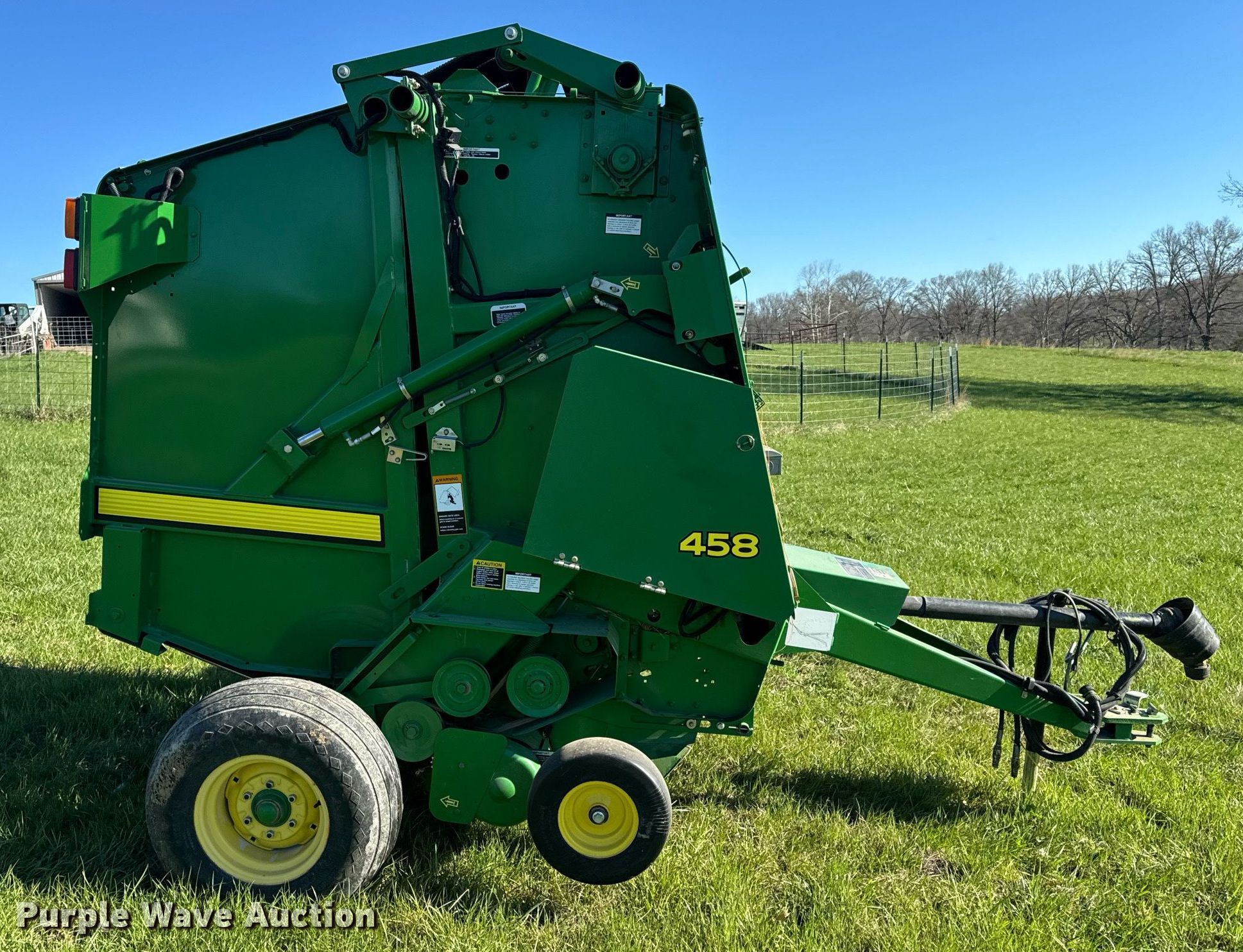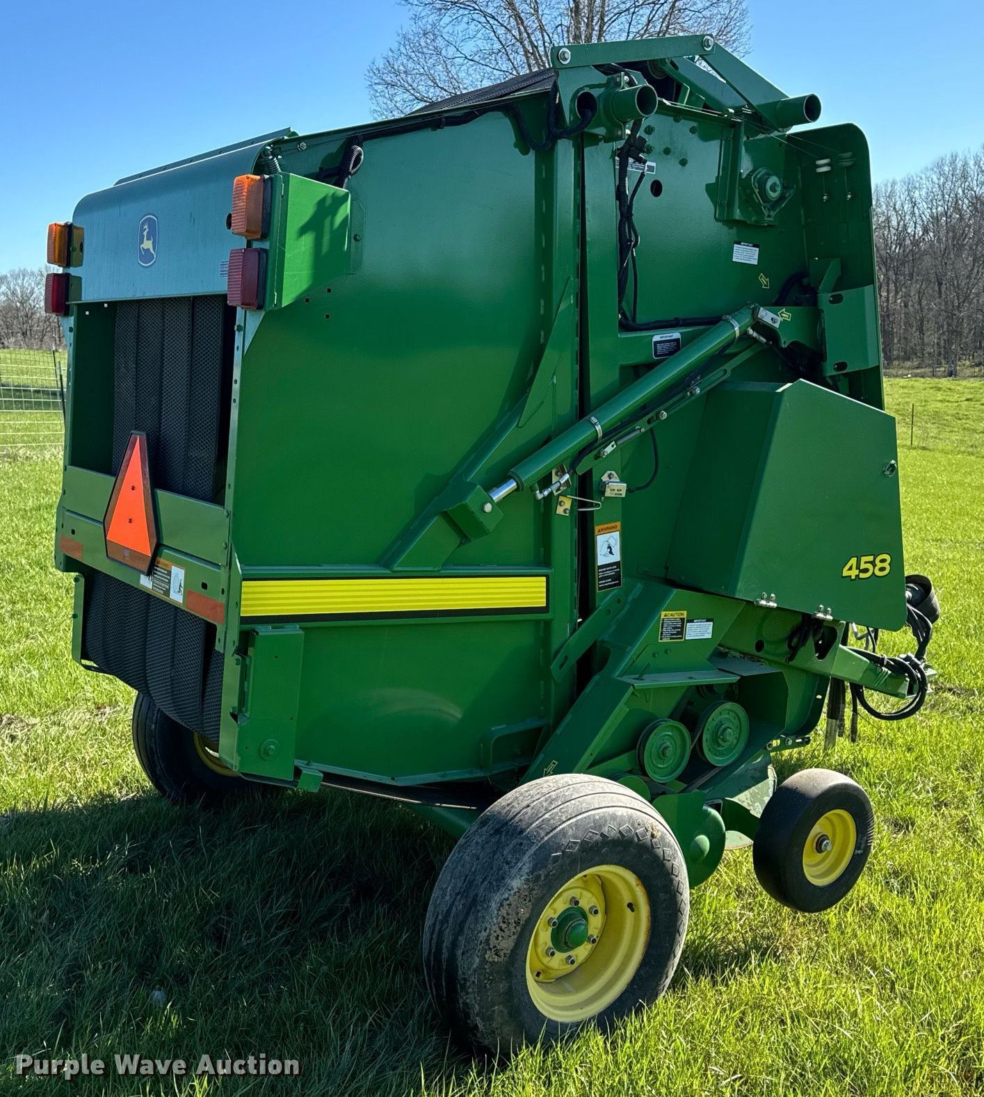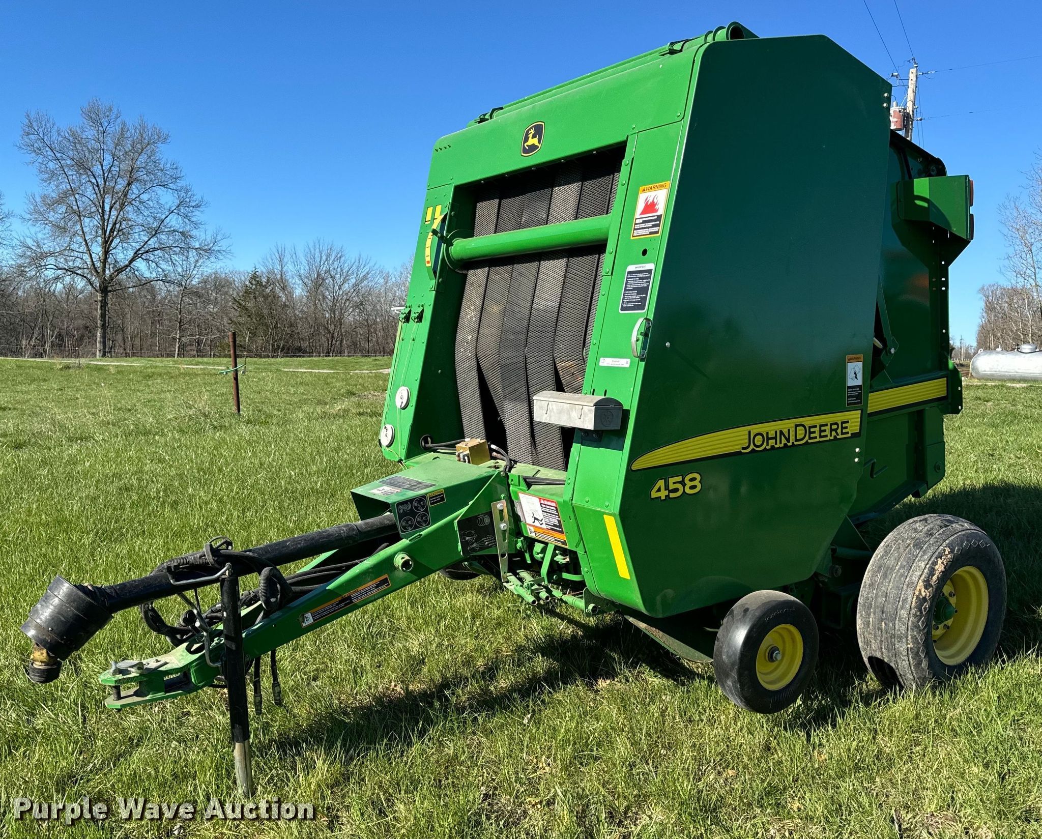 Purple Wave is selling a used Round Baler in Missouri. This item is a 2012 John Deere 458C round baler with the following: Bale count: 1,647, Serial: 1E00458CVCC382025