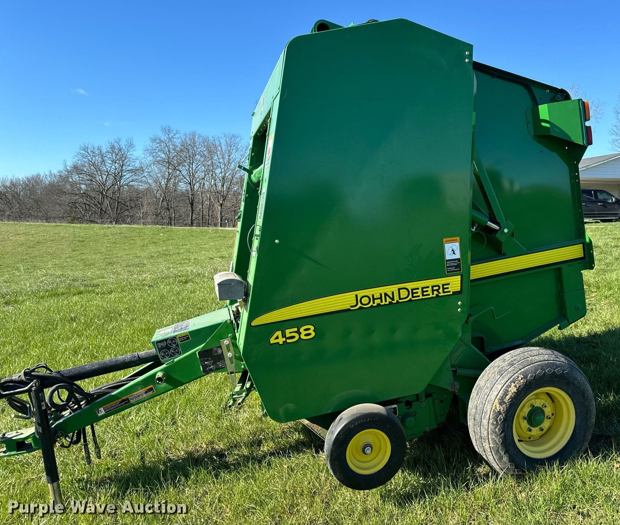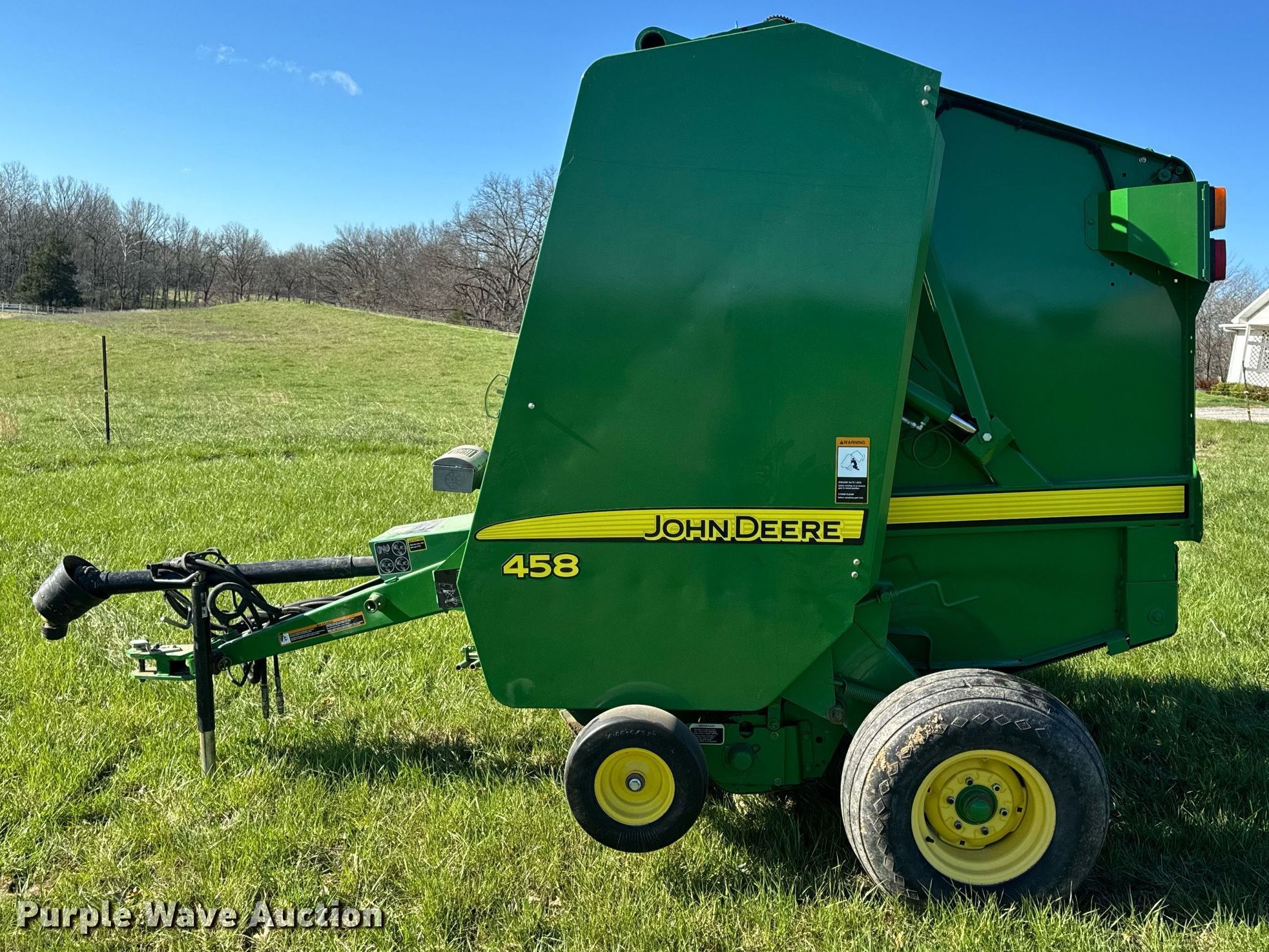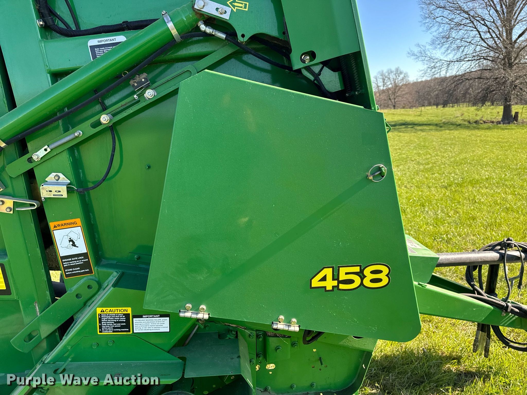 Purple Wave is selling a used Round Baler in Missouri. This item is a 2012 John Deere 458C round baler with the following: Bale count: 1,647, Serial: 1E00458CVCC382025
