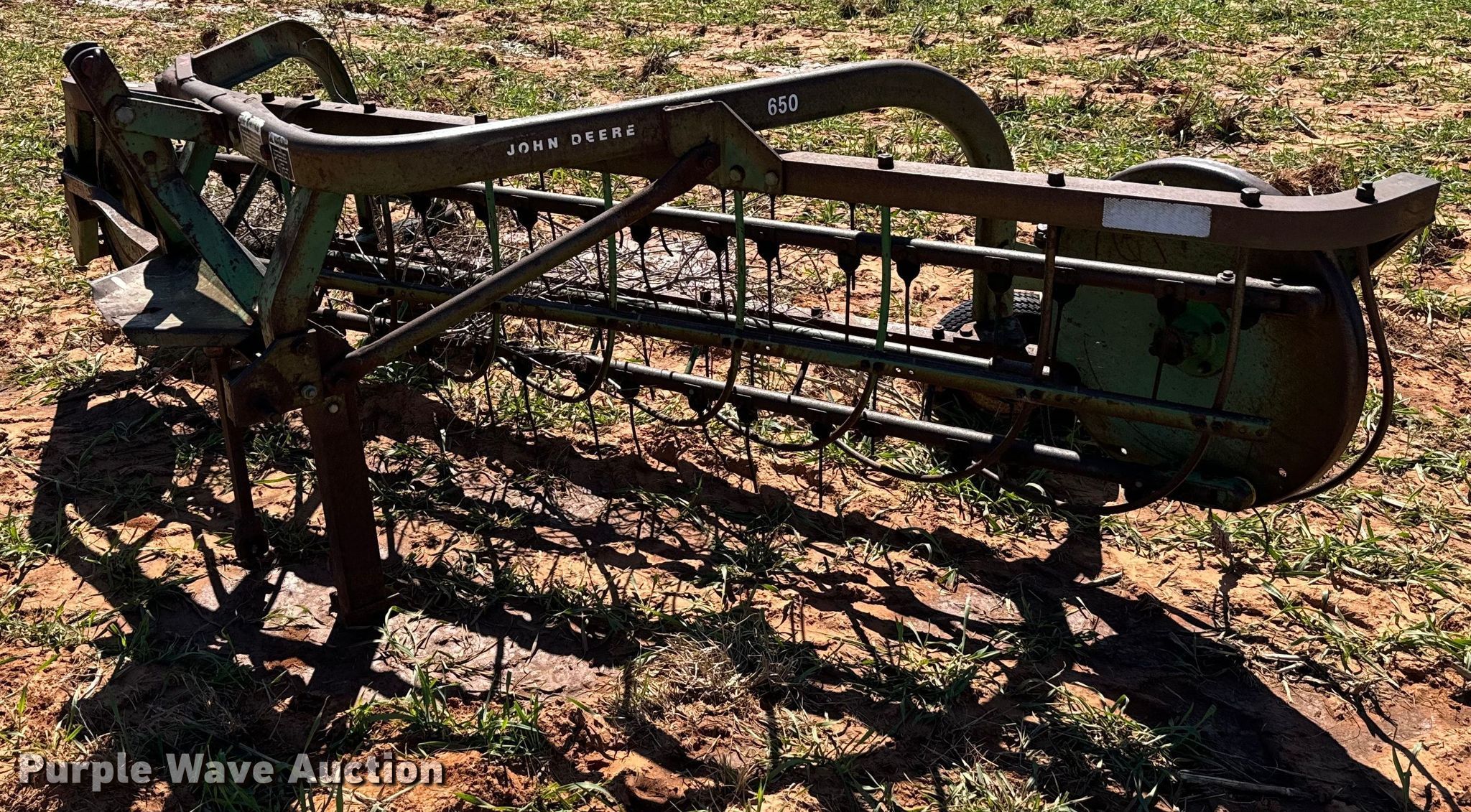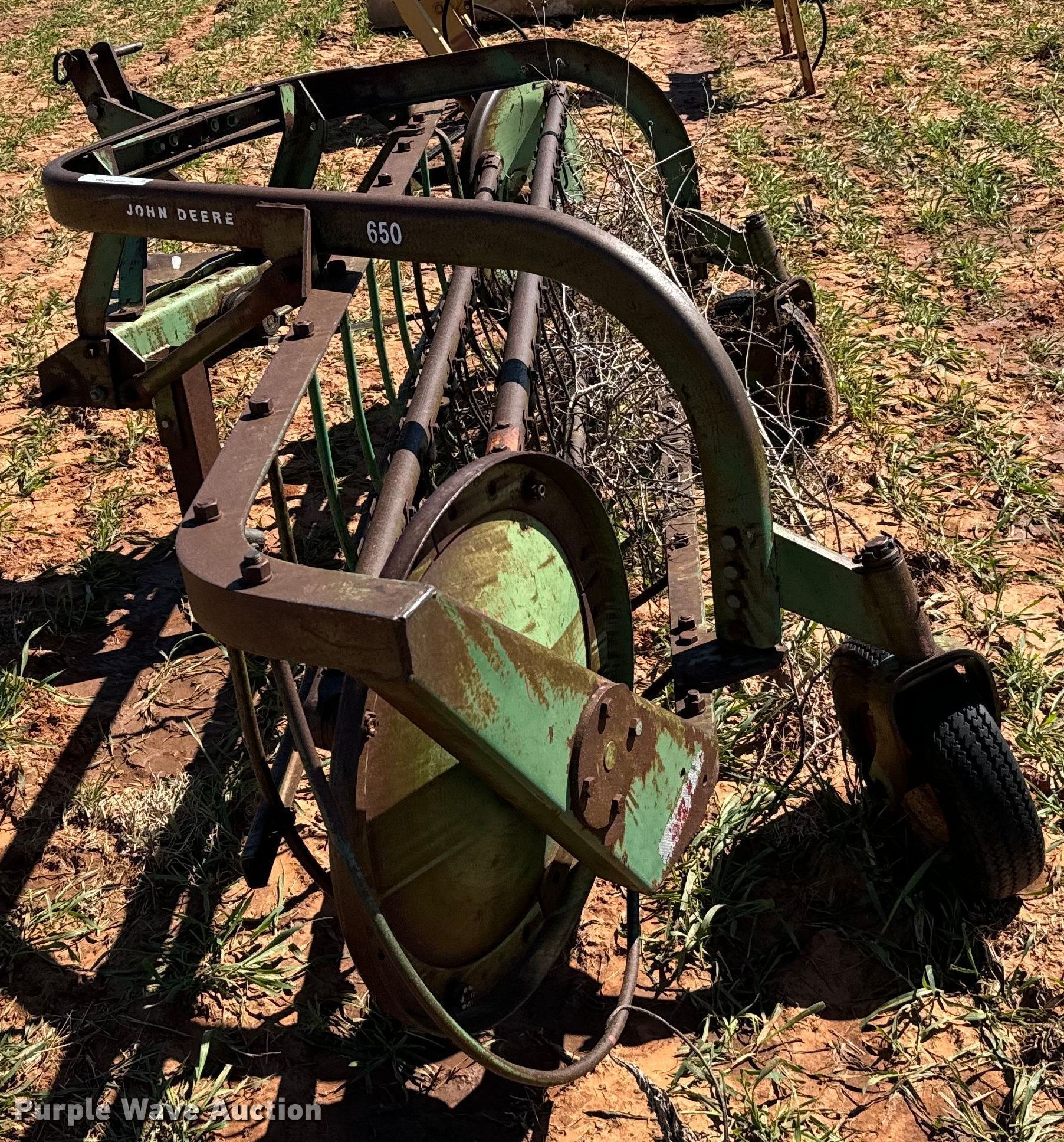 Purple Wave is selling a used Hay Rake in Texas. This item is a John Deere 650 hay rake with the following: Serial: 455810E