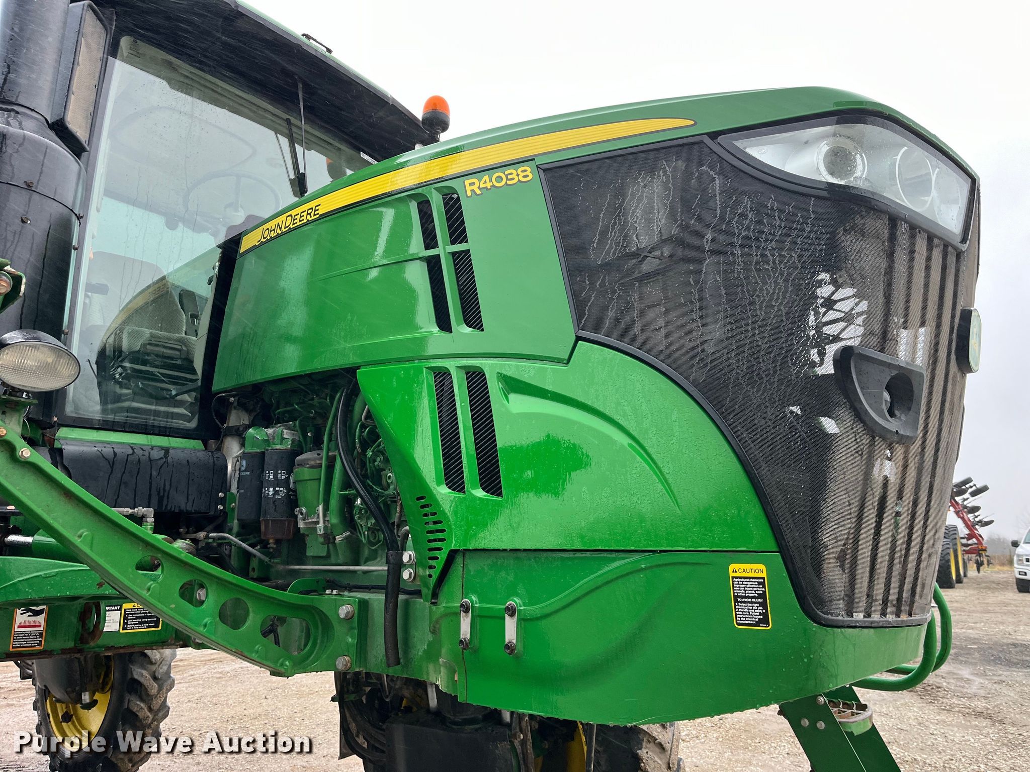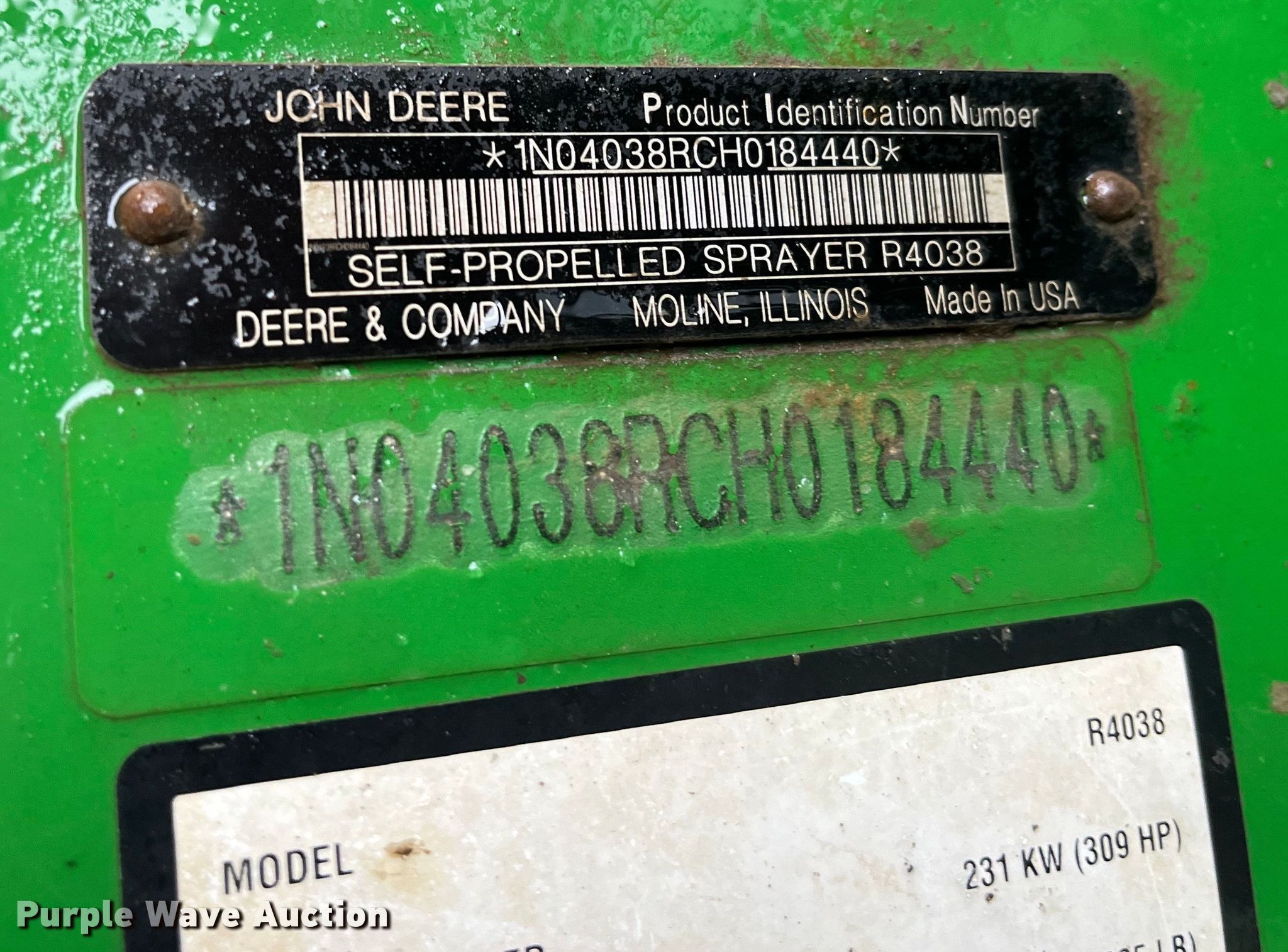 Purple Wave is selling a used Applicator Self Propelled in Missouri. This item is a 2018 John Deere R4038 spreader with the following: Engine hours: 4,724 on meter, Serial: 1N04038RCH0184440