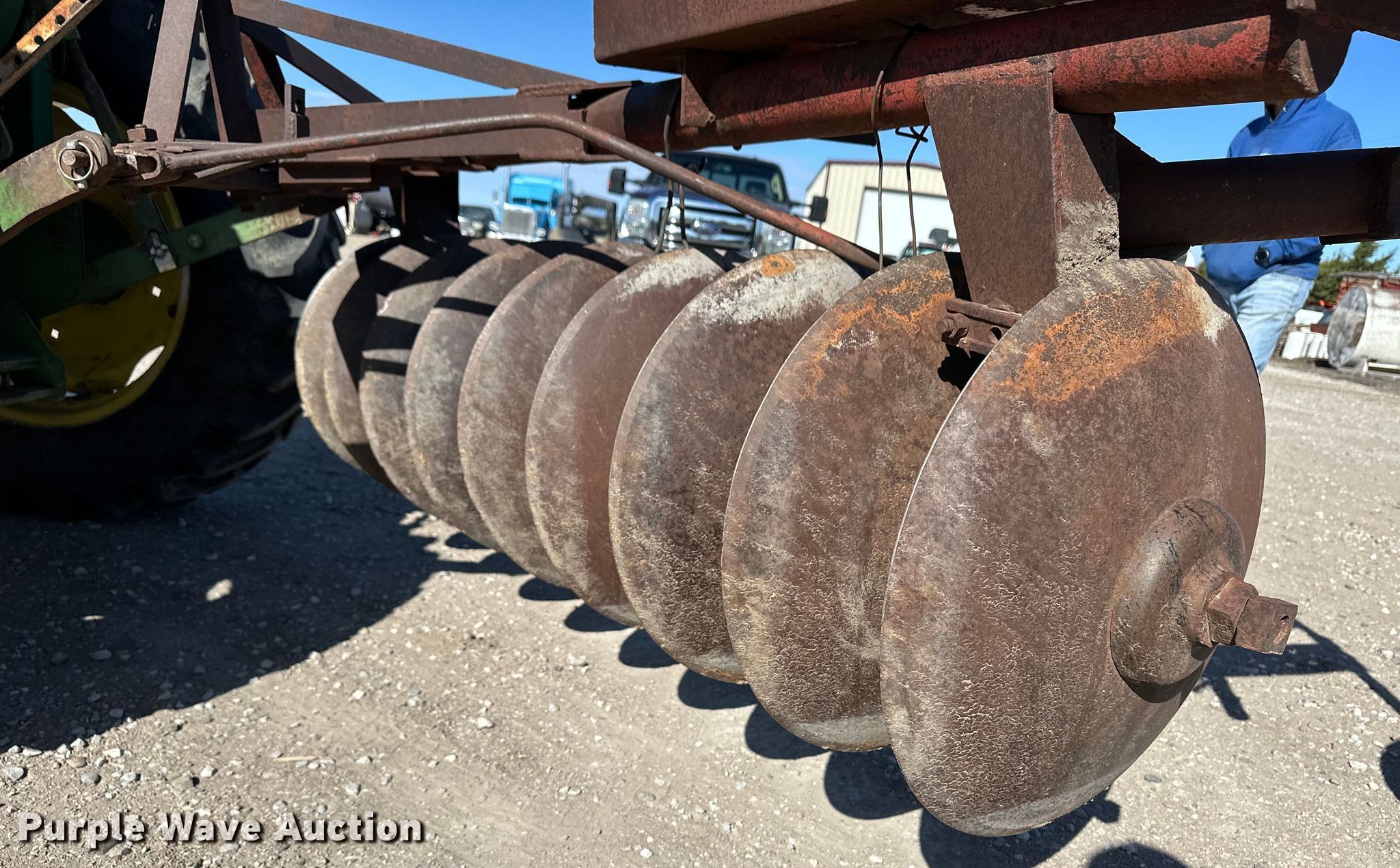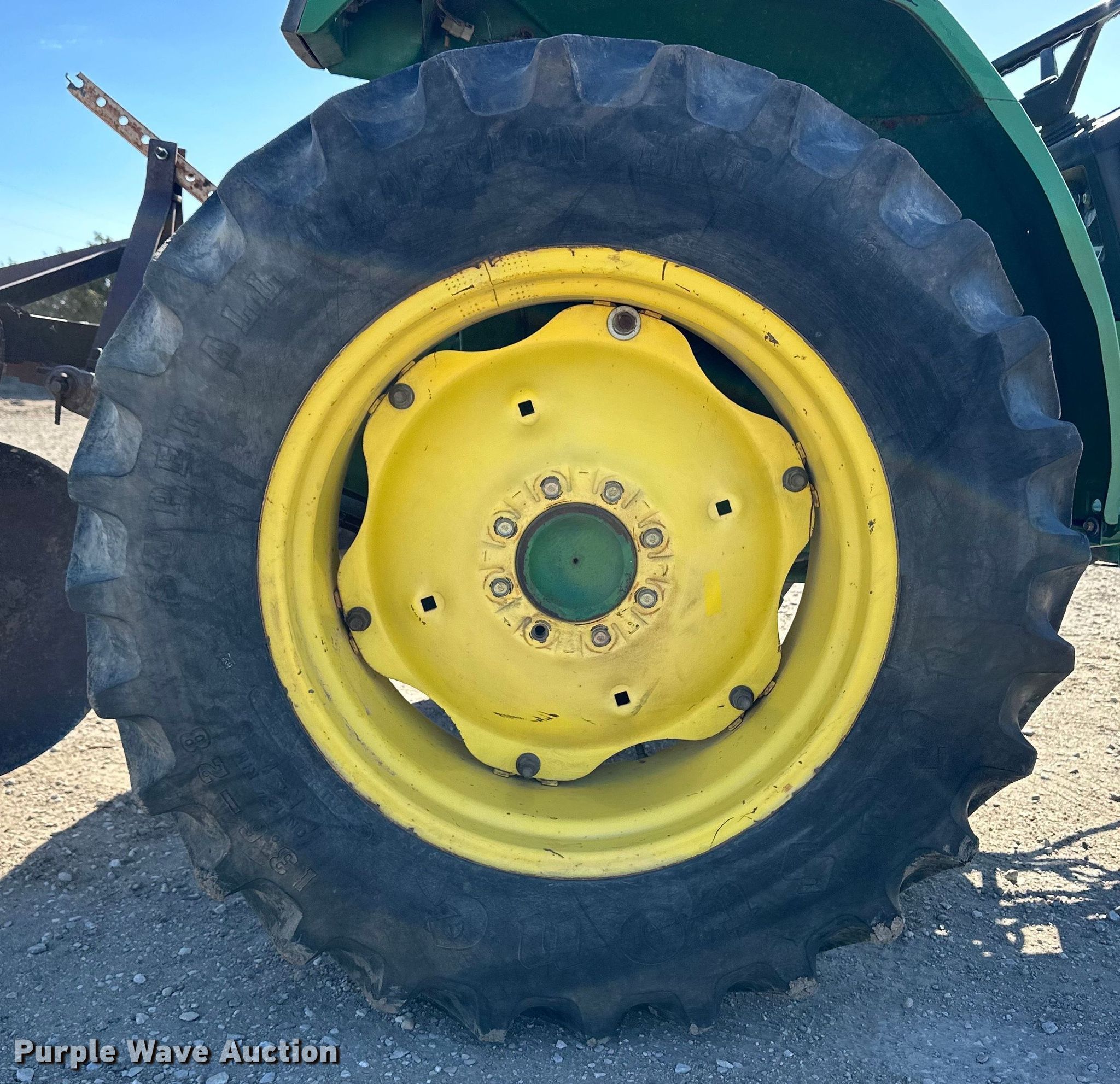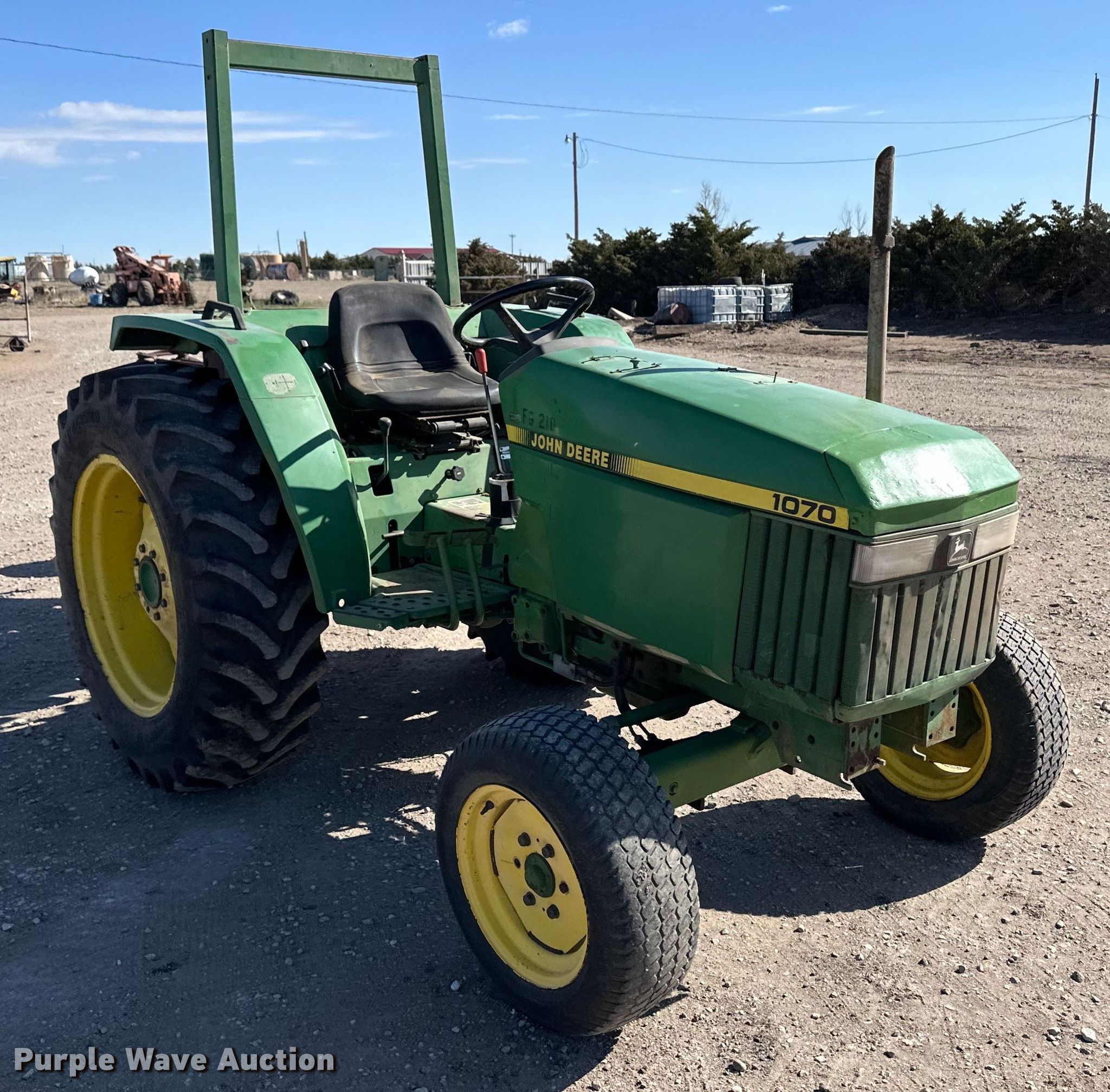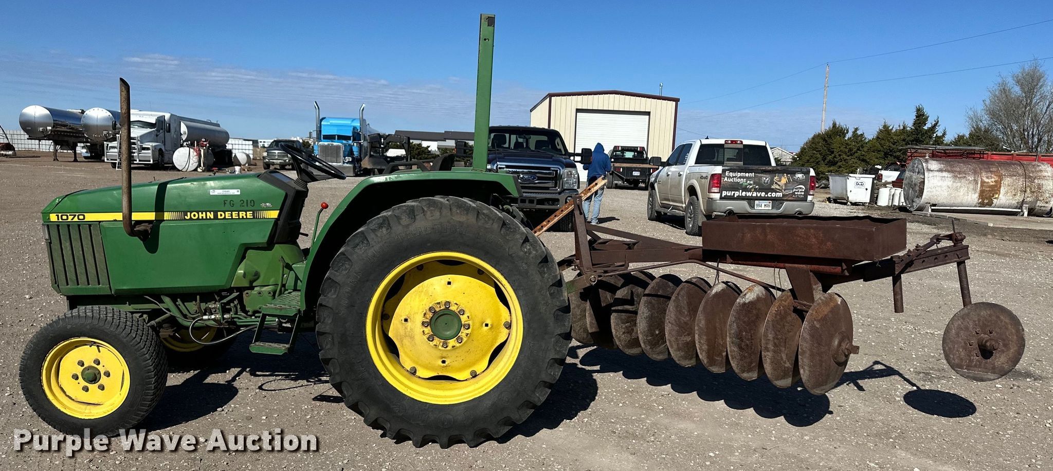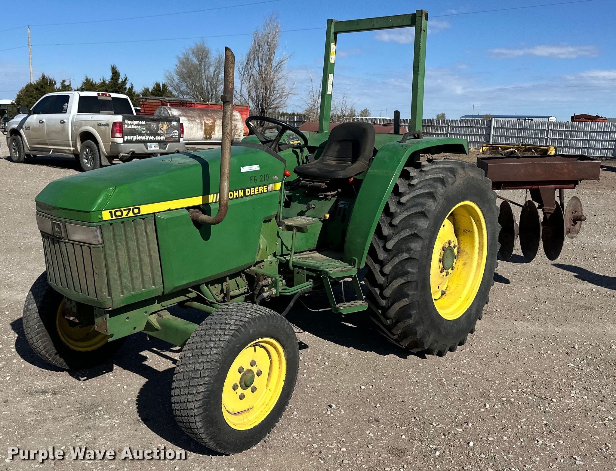 1995 John Deere 1070 tractor. Hours: 6,925 on meter, Serial: M01070A140227. Engine John Deere, Cylinders: 3, Fuel type: Diesel. Transmission Manual, 9F - 3R. Features PTO: 540, Three point, Hydraulic remote sets Front: 2, Rear: 1, Disk 5' W x 22" diameter, Disk spacing: 8", Hitch: Three point. Tires Front: 27x8.50-15, Rear: 13.6-28. Flatland Equipment LLC. Sublette, KS 67877