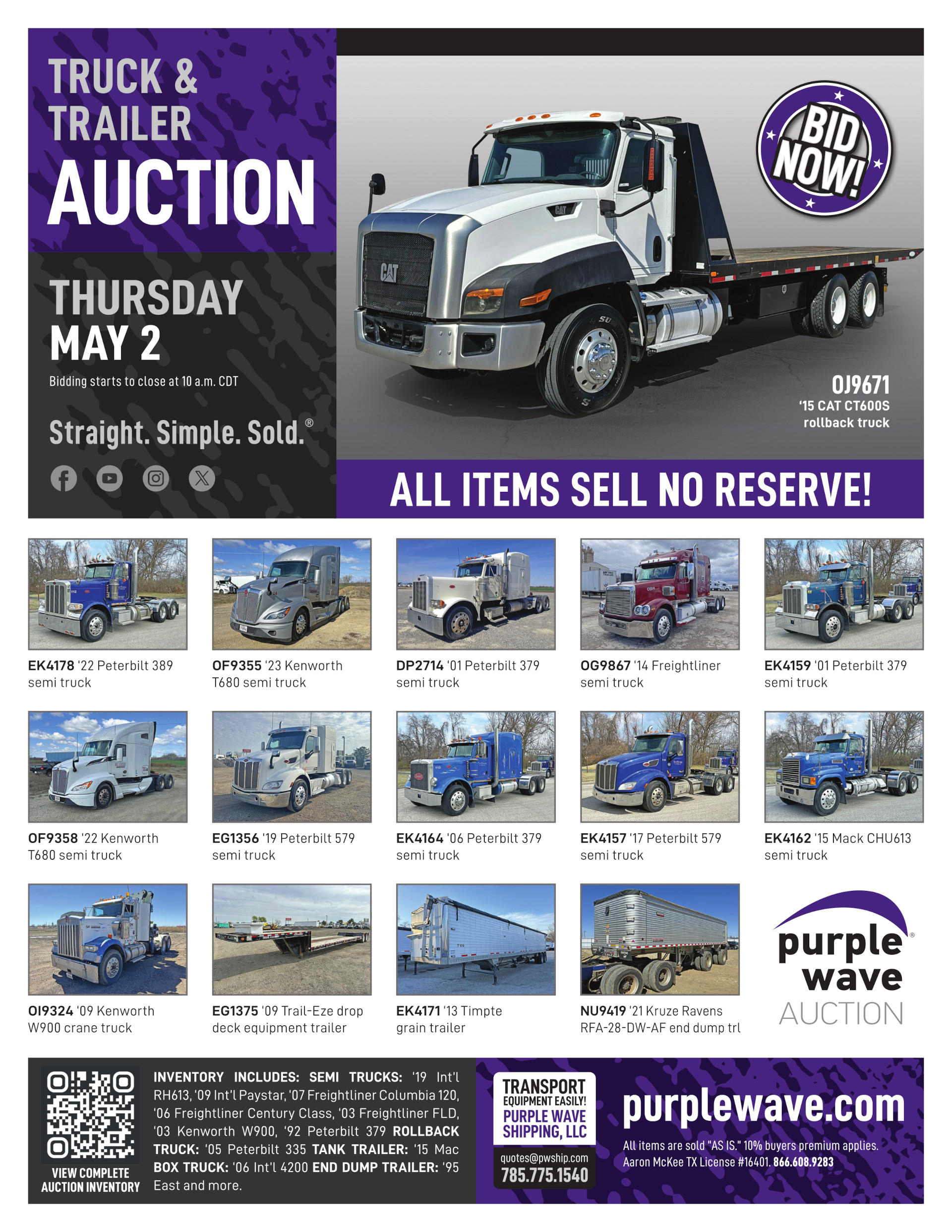 Purple Wave Shipping, LLC provides shipping and transportation services to winning bidders on ag, construction and fleet type assets. Purple Wave Shipping, LLC does not provide shipping on items weighing less than 1,000 pounds.