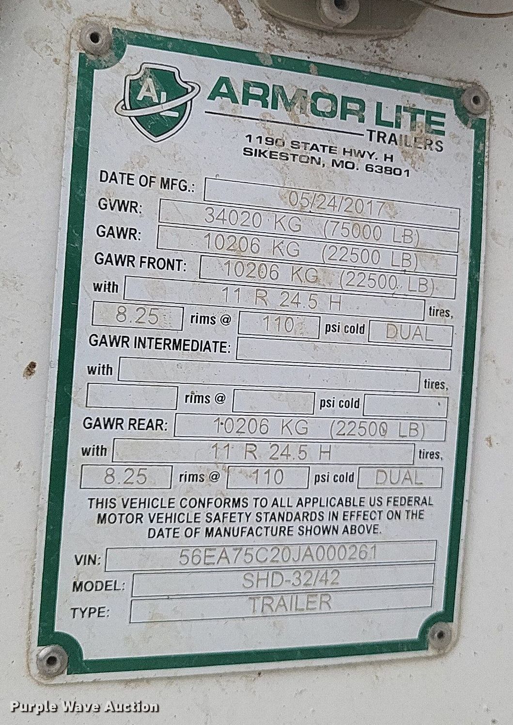 2018 Armor Lite SHD-32/42 end dump trailer. VIN: 56EA75C20JA000261. Dimensions Overall: 34' L x 97" W, Side height: 4'. Features Body type: Steel, Ram: Single, End gate: Air operated, Roll tarp. Chassis Landing gear: Dual, Suspension: Spring, Brakes: Air, Axles: Tandem, GVWR: 75,000 lbs, GAWR: 22,500 lbs. Tires Aluminum wheels, Steel wheels, Size: 275/80R24.5. Missouri title. Title distribution may be delayed up to 14 days from verification of funds. Kevin Duty Sales. Miner, MO 63801