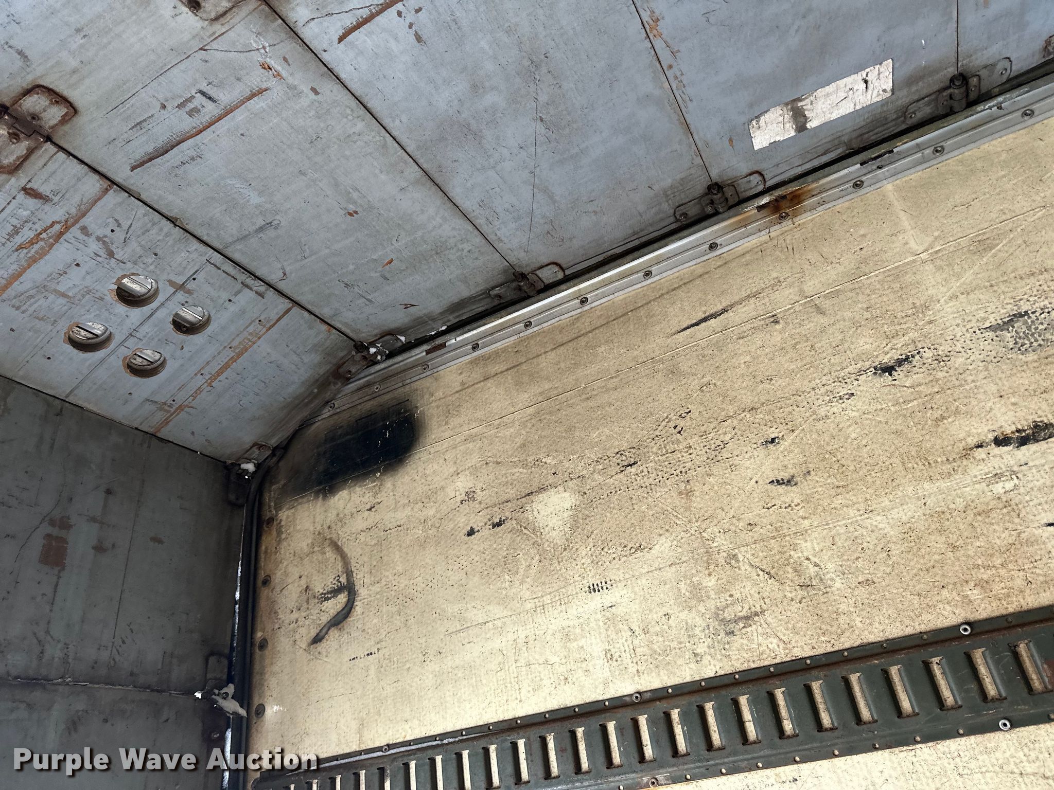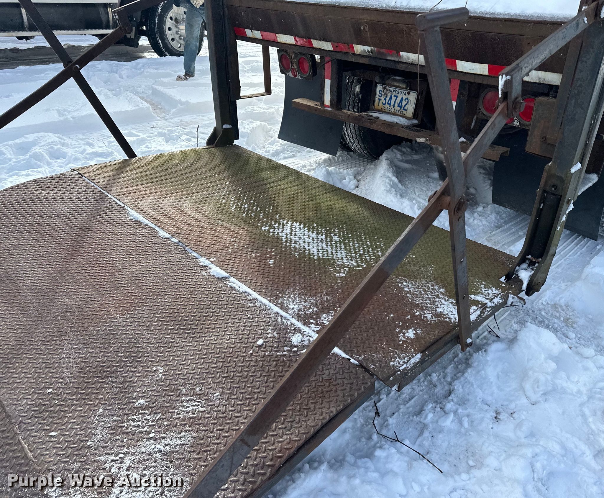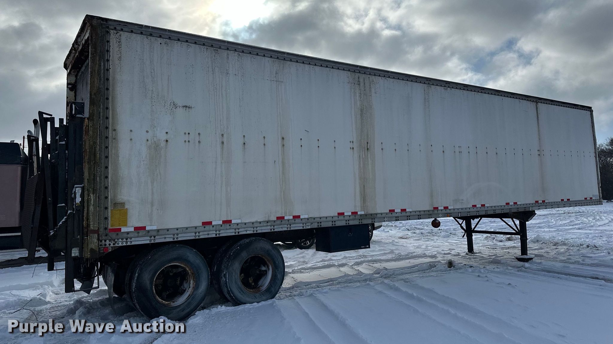 1981 Stoughton FRPV-455T-AR dry van trailer. VIN: 1DW1A4527BS324504, Unit #: 501. Dimensions Overall: 45' L x 96" W. Features Deck type: Wood, E-track rail system, End gate lift Walco. Chassis Landing gear: Dual, Suspension: Air, Brakes: Air, Axles: Tandem. Tires Steel wheels, Size: 11R22.5. Minnesota title. Title distribution may be delayed up to 14 days from verification of funds. J.R.'S Advanced Recyclers. 8245 Argenta Trail. Inver Grove Heights, MN 55077