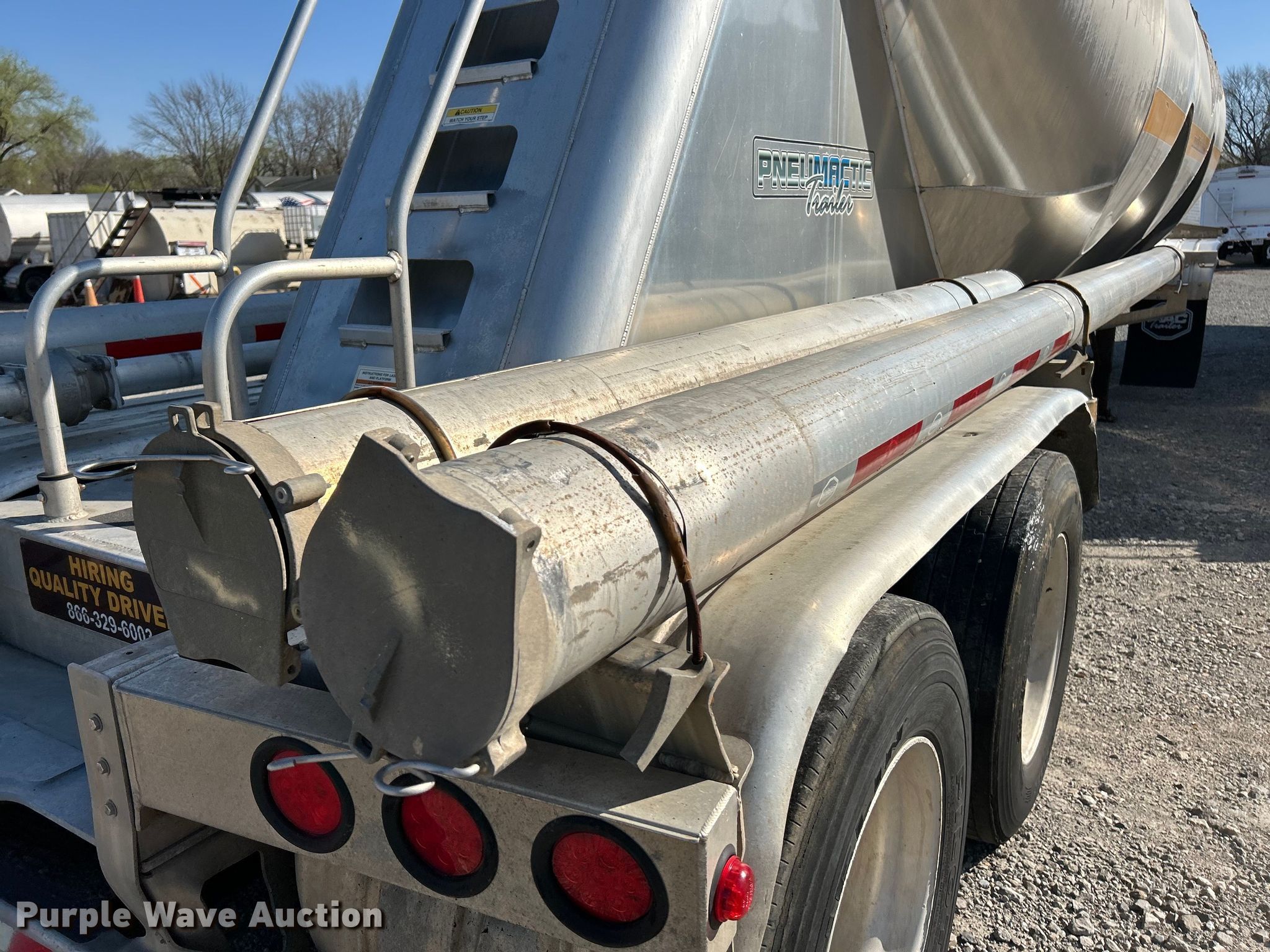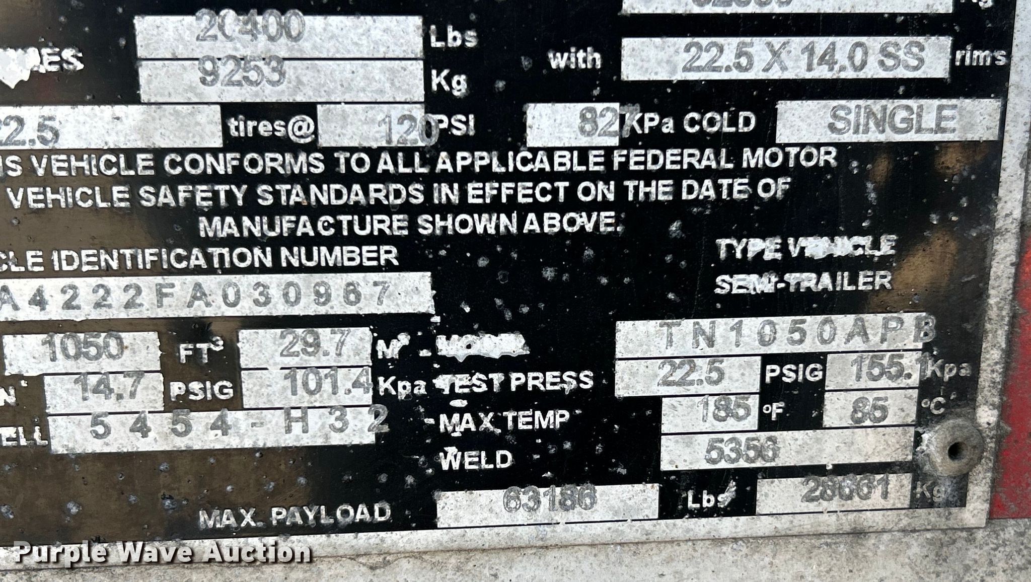 2015 Mac tank trailer. VIN: 5MATA4222FA030967. Dimensions Overall: 42' L x 96" W. Features Tank type: Aluminum, Number of manways/manholes: 3 Width: 20", Full length walkway, Outlet size: 4.5", Capacity: 1050 cu ft. Chassis Landing gear: Dual, Suspension: Air, Brakes: Air, Axles: Tandem, GVWR: 72,000 lbs, GAWR: 20,400 lbs. Tires Aluminum wheels, Size: 295/75R22.5. Missouri title. Title distribution may be delayed up to 14 days from verification of funds. Fuel Carriers Inc. Retirement. St. Charles, MO 63301