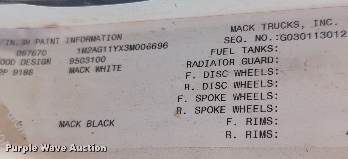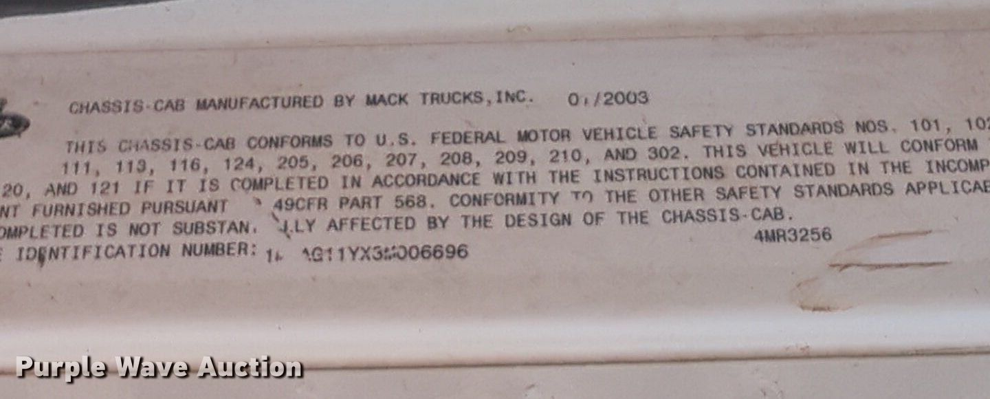 Purple Wave is selling a used Oilfield Truck in Oklahoma. This item is a 2003 Mack CV713 winch truck with the following: Miles: Unknown, VIN: 1M2AG11YX3M006696