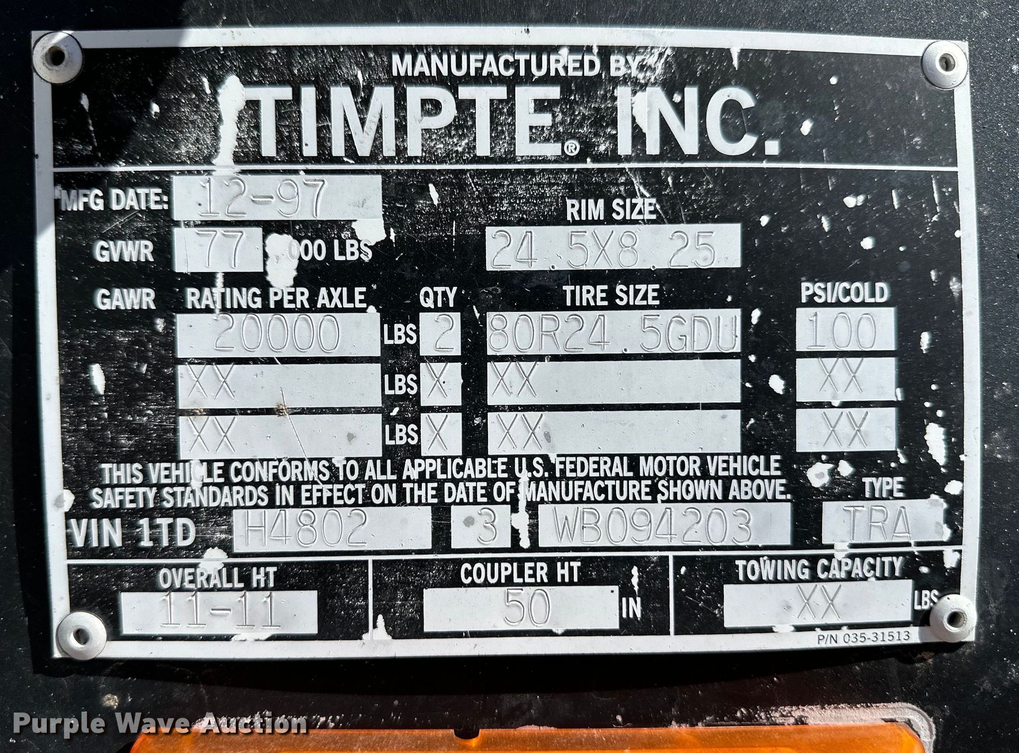 Take a look at this used 1998 Timpte grain trailer being sold on May 2nd, 2024 in the SOLD! May 02 Truck and Trailer Auction made by Timpte. Take a look at all of the item information below or take a look at similar auctions for Ag Trailers.