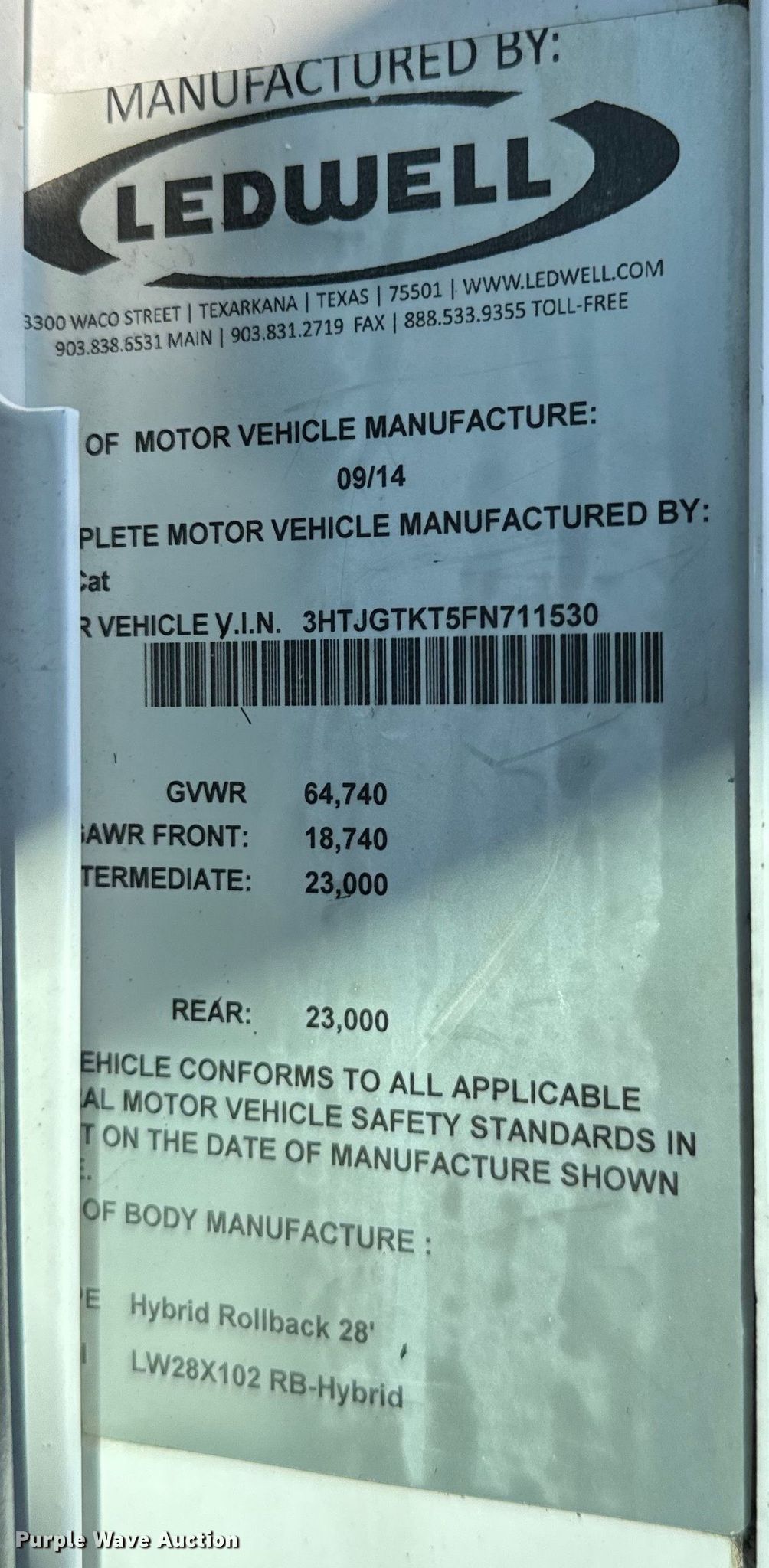 2015 Caterpillar CT600S rollback truck. Miles: 168,836 on odometer, VIN: 3HTJGTKT5FN711530. Engine Caterpillar CT13, Displacement: 13.0L, Cylinders: 6, Fuel type: Diesel. Transmission Eaton Fuller, Manual, Speed: 10. Chassis Double frame, Differential lock: Full, Axles: Tandem, Suspension: Spring over walking beam, Brakes: Air, GVWR: 64,740 lbs. Interior AC, heat, Heated mirrors, Power windows, power locks, Cruise control, Auxiliary controls. Features Rollback bed Ledwell LW28X102 RB-Hybrid, 28' L x 8' 6" W, Ram: Double, Capacity: 30,000 lbs, Winch Capacity: 20,000 lbs, Underlift, Remote control. Tires Front: 315/80R22.5, Rear: 11R22.5. Missouri title. Title distribution may be delayed up to 14 days from verification of funds. Collinsville, OK 74021