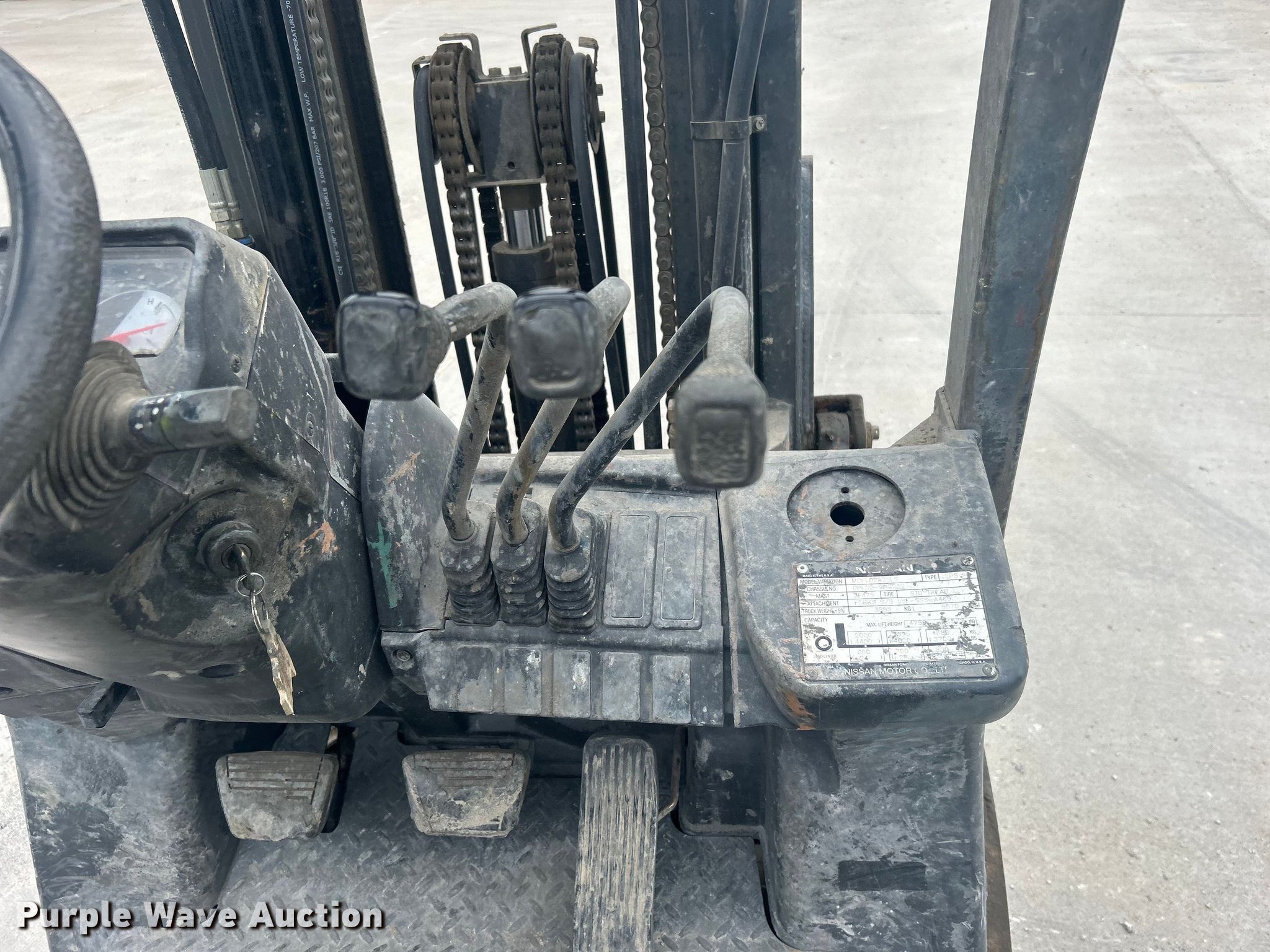 Purple Wave is selling a used Warehouse Forklift in Oklahoma. This item is a Nissan 50 forklift with the following: Hours: 3,271 on meter, Serial: MCPL02A25LS, Unit #: 213009