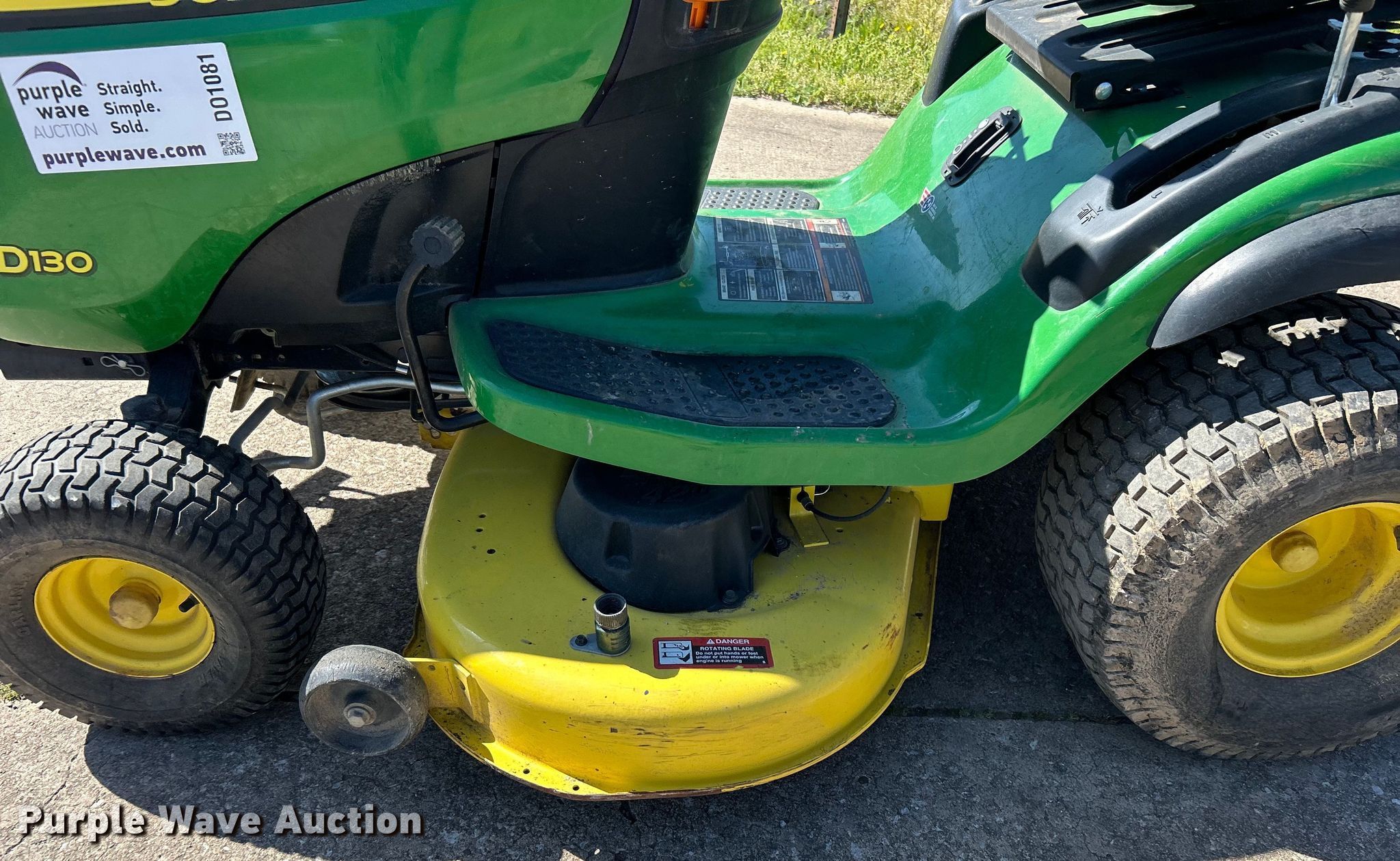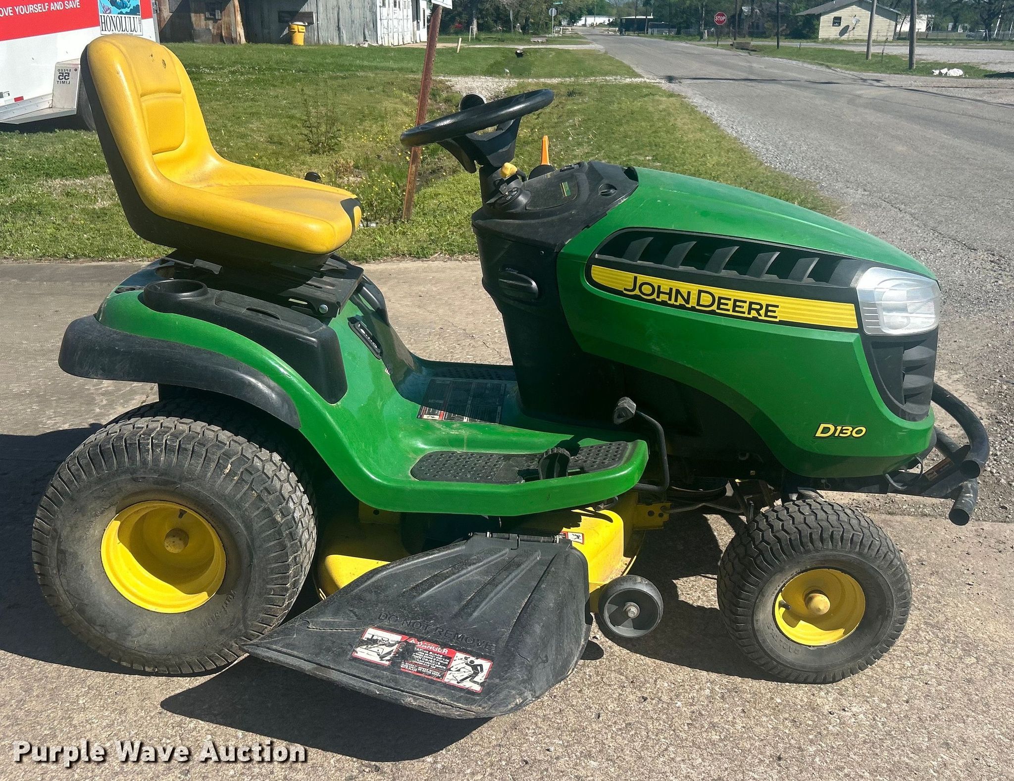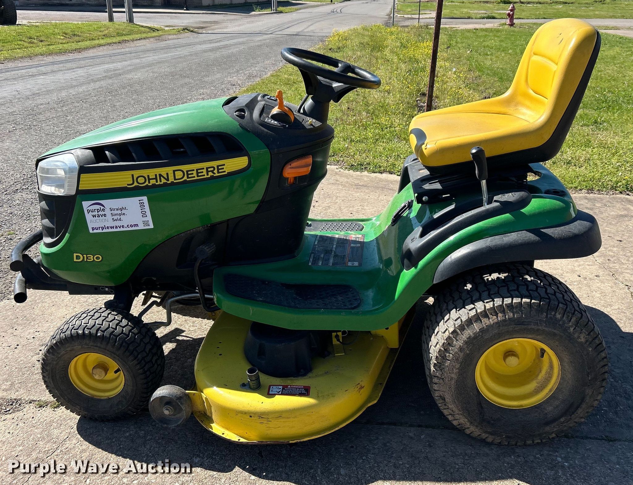 Purple Wave is selling a used Lawn Mower in Oklahoma. This item is a 2015 John Deere D130 lawn mower with the following: Hours: 65 on meter, Cutting width: 42", Serial: 1GXD130ETFG703165