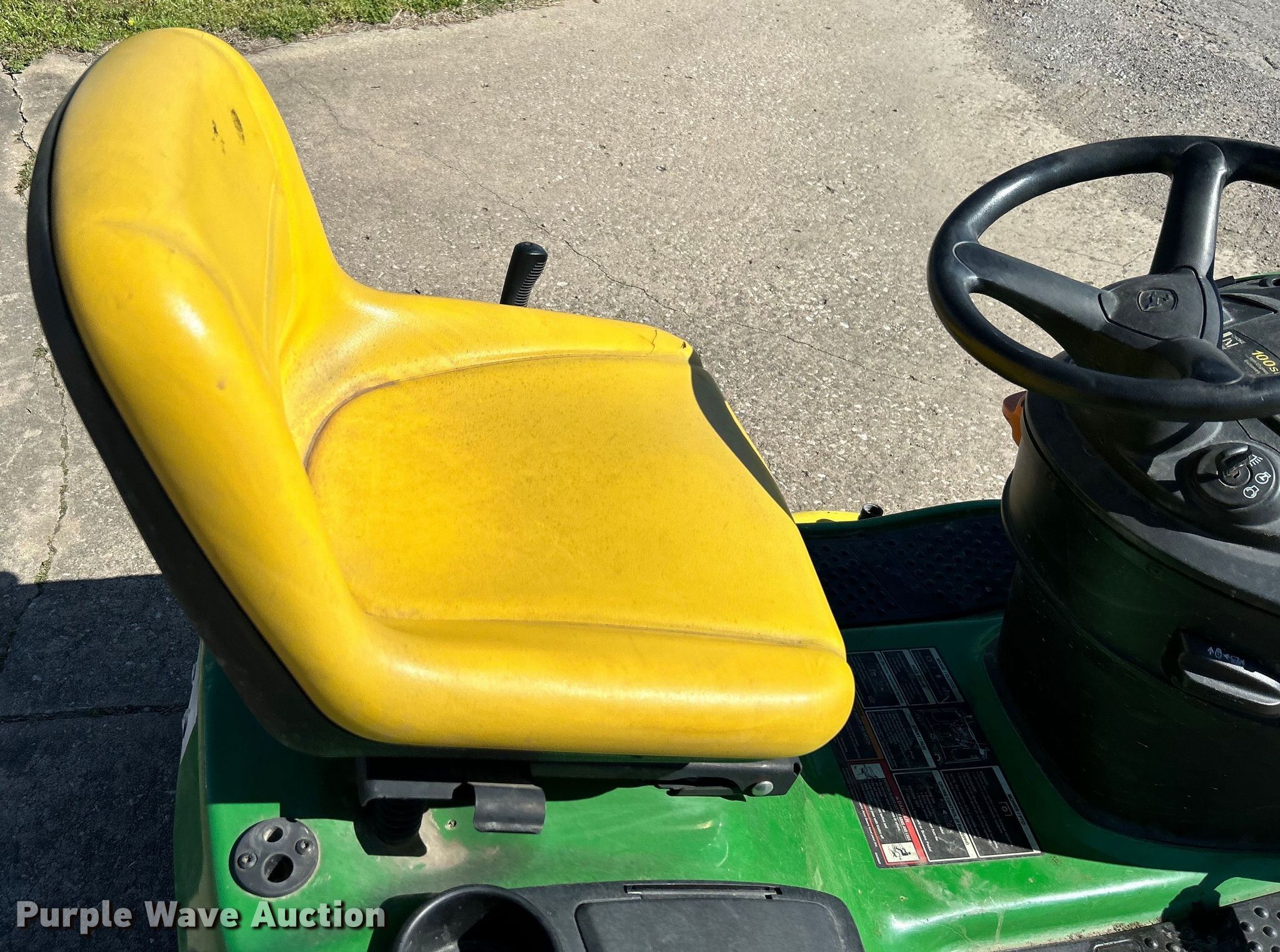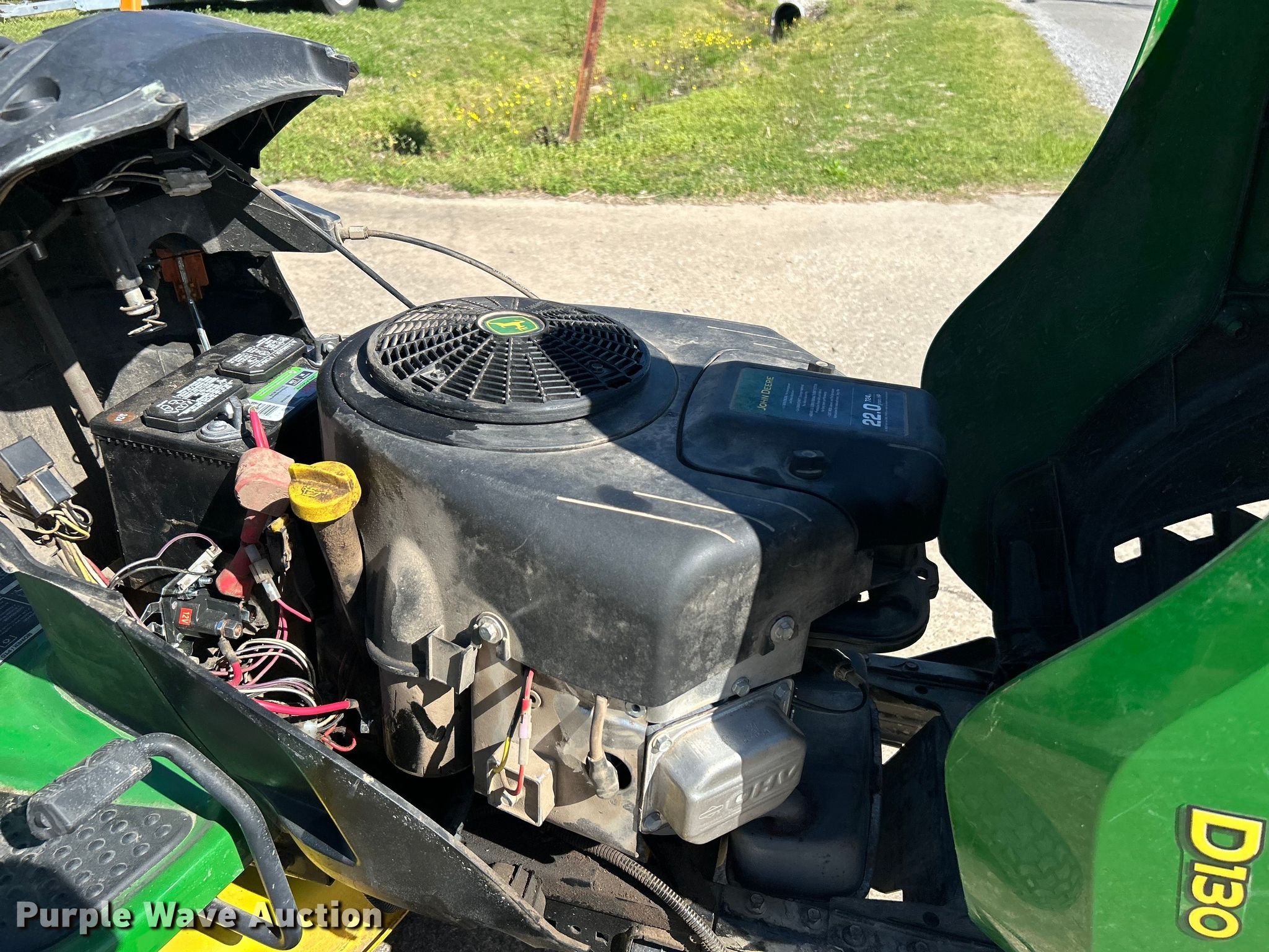 2015 John Deere D130 lawn mower. Hours: 65 on meter, Cutting width: 42", Serial: 1GXD130ETFG703165. Engine John Deere, Displacement: 724 cc, Cylinders: 2, Fuel type: Gas, HP: 22. Transmission Hydrostatic. Features Mower deck Width: 42". Tires Front: 15x6.00-6 NHS, Rear: 20x10.00-8. Haskell, OK 74436