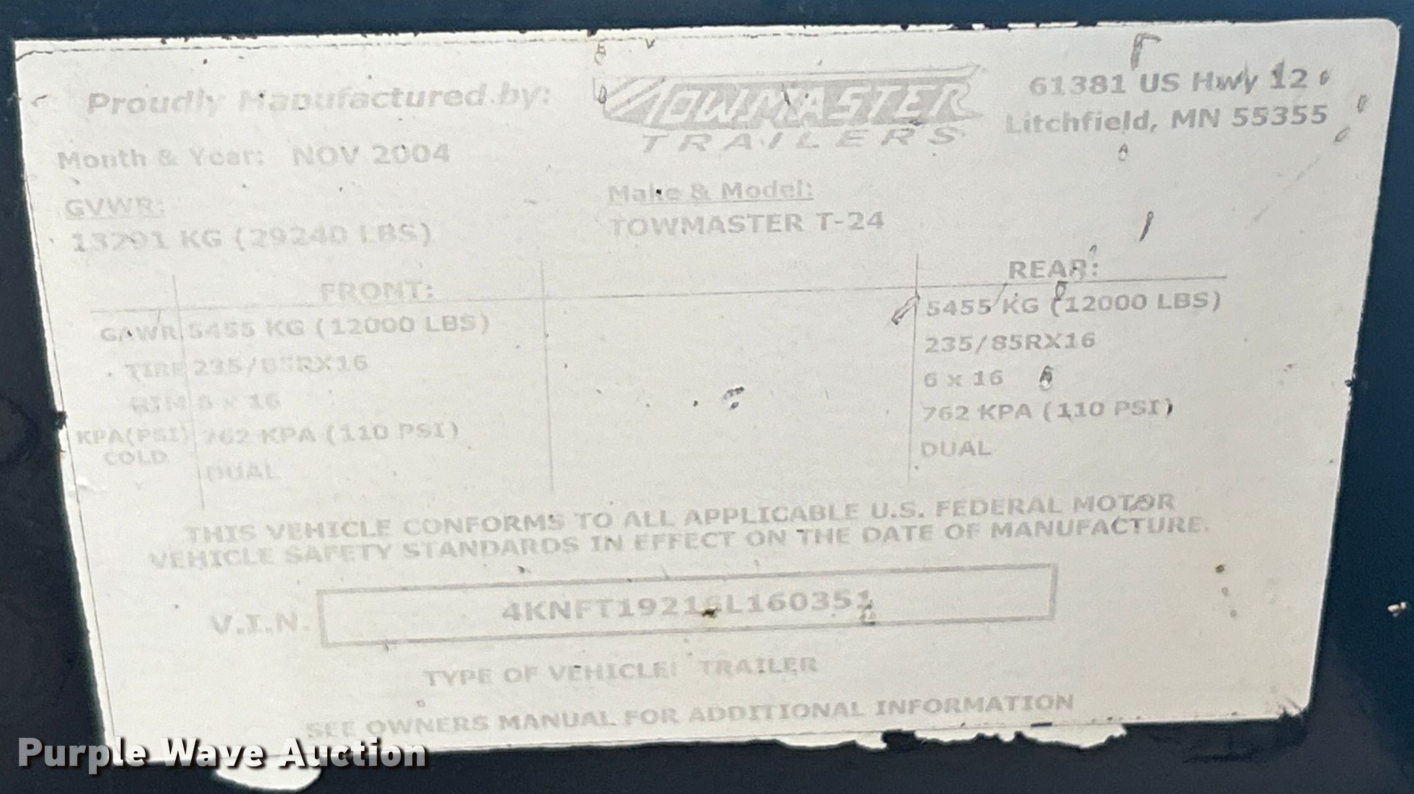 2006 Towmaster equipment trailer. VIN: 4KNFT19216L160351. Dimensions Overall: 31' L x 102" W, Deck: 19' L x 96" W, Tail length: 6', Ramps: Manual Length: 6'. Features Deck type: Wood. Chassis Hitch: Pintle, Landing gear: Single, Suspension: Spring, Brakes: Air, Axles: Tandem, GVWR: 29,240 lbs, GAWR: 12,000 lbs. Tires Steel wheels, Size: ST235/85R16. Oklahoma title. Title distribution may be delayed up to 14 days from verification of funds. 15107 North 137th East Avenue. Collinsville, OK 74021