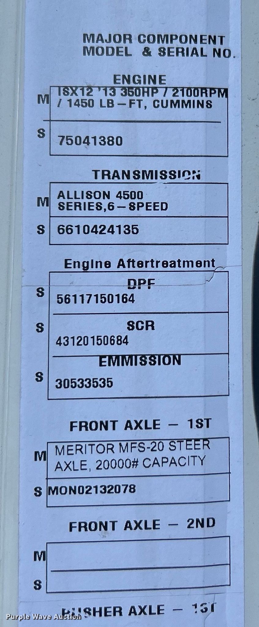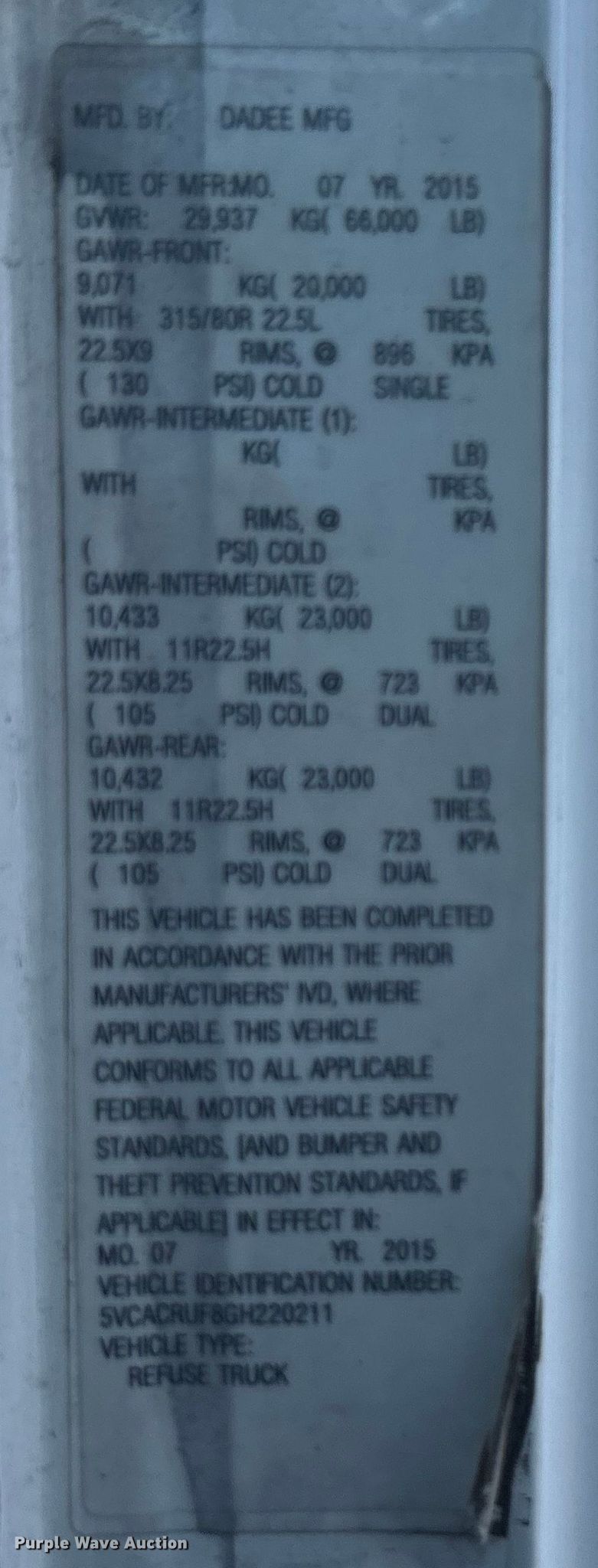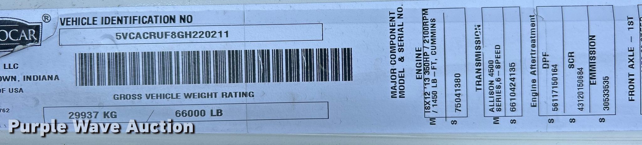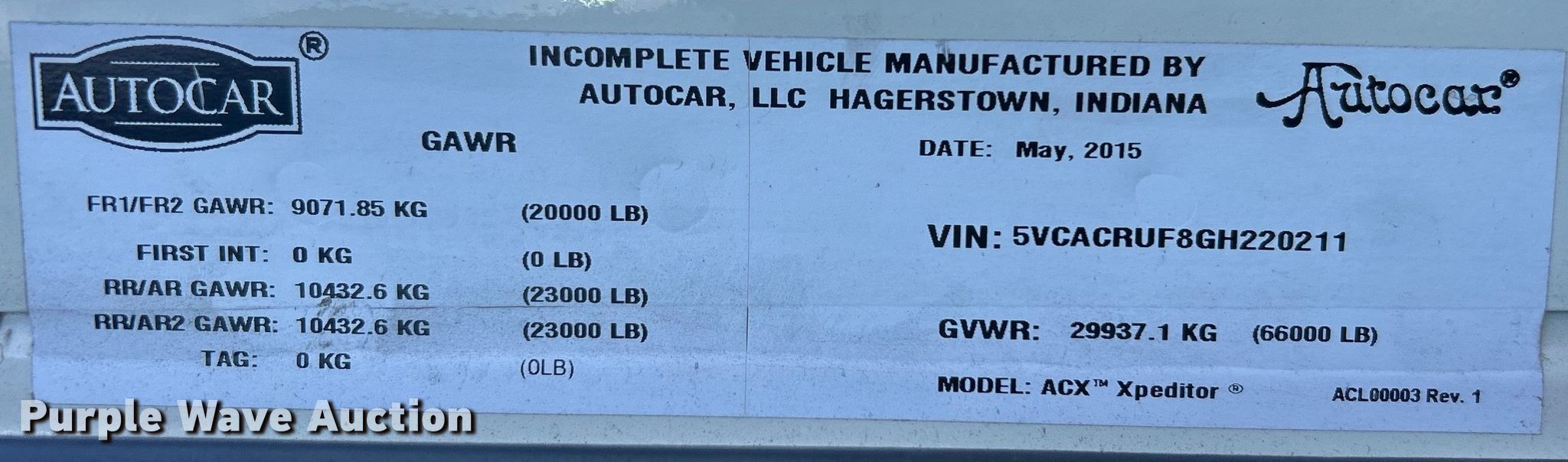 2016 Autocar ACX Xpeditor refuse truck. Miles: Unknown, VIN: 5VCACRUF8GH220211. Engine Cummins ISX12, Displacement: 12.0L, Cylinders: 6, Fuel type: Diesel. Transmission Automatic. Chassis Axles: Tandem, Suspension: Spring over walking beam, Brakes: Air, PTO, GVWR: 66,000 lbs. Interior AC, Heat, Cruise control, Backup camera. Features Refuse bed Dadee Mfg. Scorpion, Serial: SCASLB0488, Load: Side, Cart tipper. Tires Front: 315/80R22.5, Rear: 11R22.5. Notes Interior parts missing, Driveshaft missing , Non-operational unit. Texas salvage vehicle title. Mileage has not been verified. Exempt will be written in the odometer disclosure on the title. Title distribution may be delayed up to 14 days from verification of funds. 15107 North 137th East Avenue. Collinsville, OK 74021