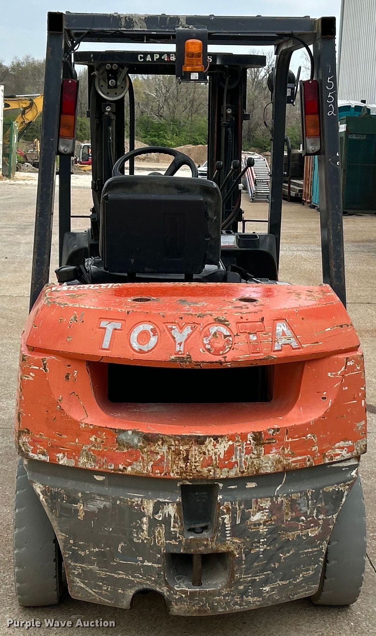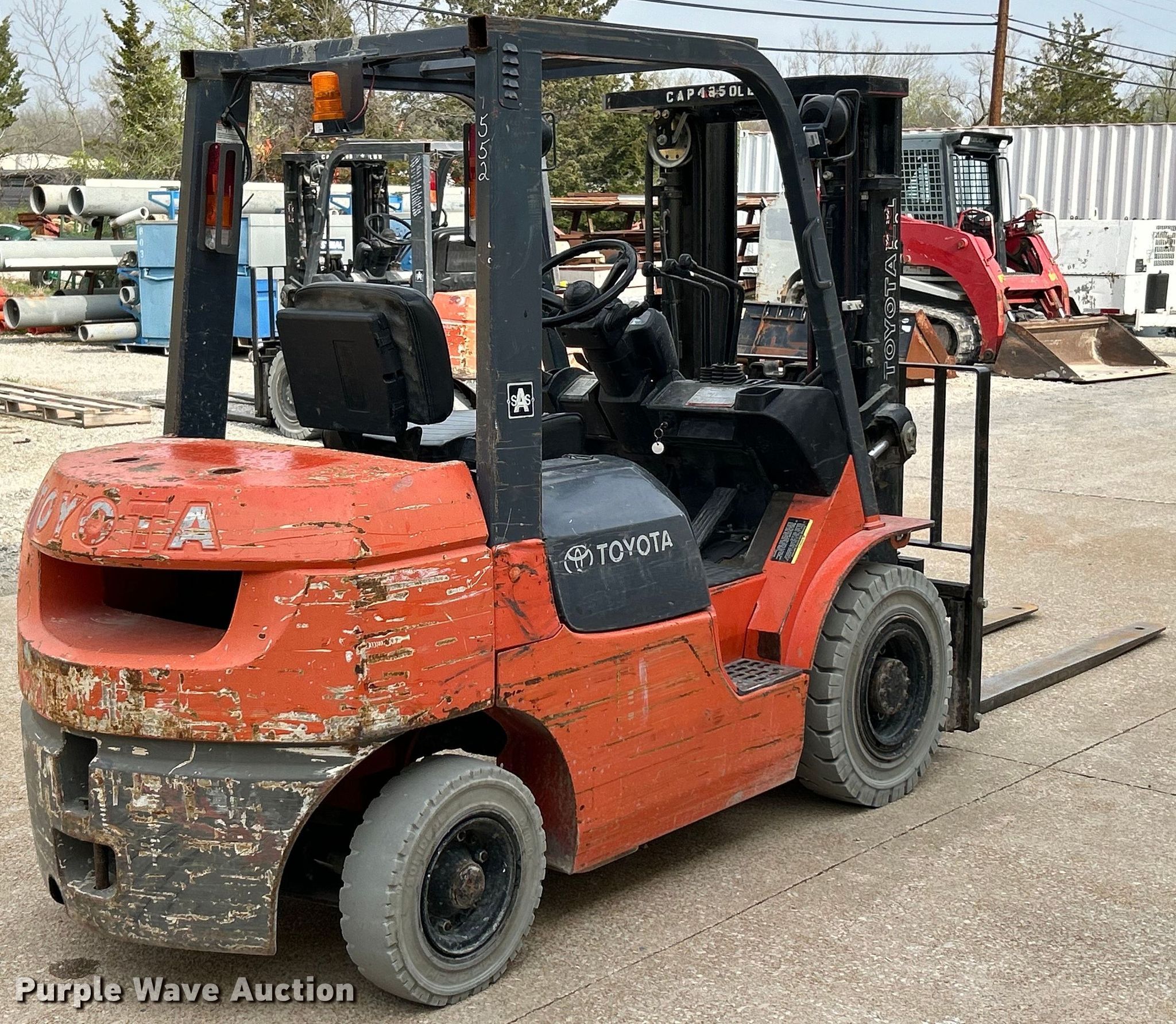 2005 Toyota 7FGU25 forklift. Hours: 6,081 on meter, Serial: 79552. Engine Toyota, Displacement: 2.237L, Cylinders: 4, Fuel type: Gas. Transmission Powershift. Operators station OROPS. Features Maximum lift capacity: 4,850 lbs, Maximum lift height: 159", Mast stages: 3, Side shift, Mast tilt, Fork length: 72". Tires Front: 7.00-12, Rear: 6.00-9. McCarthy Building Companies Inc. St. Louis, MO 63124