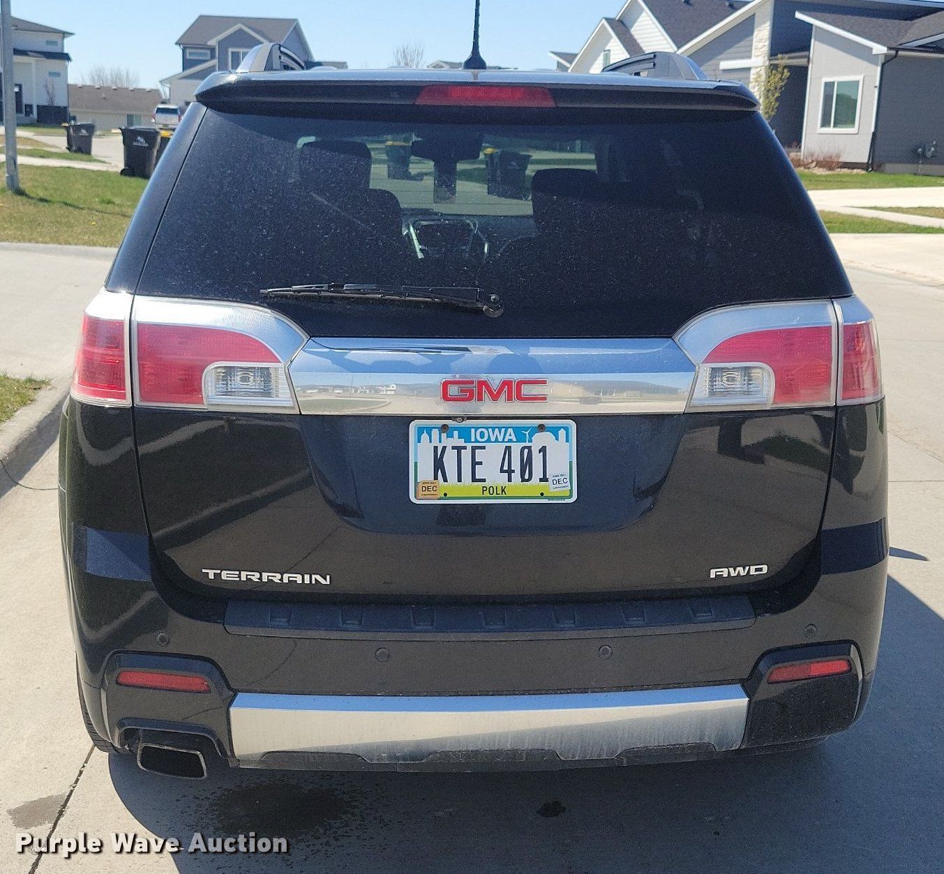 2013 GMC Terrain Denali SUV. Miles: 160,640 on odometer, VIN: 2GKFLZEKXD6221493. Engine Displacement: 2.4L L4 DOHC, Cylinders: 4, Fuel type: Gas. Transmission Automatic, All wheel drive. Interior AC, Heat, Seat: Heated, Power driver, Power passenger, Heated mirrors, Power windows, Power locks, Cruise control, Backup camera, Powered sunroof. Tires Size: 235/55R18. Notes Contents not included. Iowa title. Title distribution may be delayed up to 14 days from verification of funds. Waukee, IA 50263