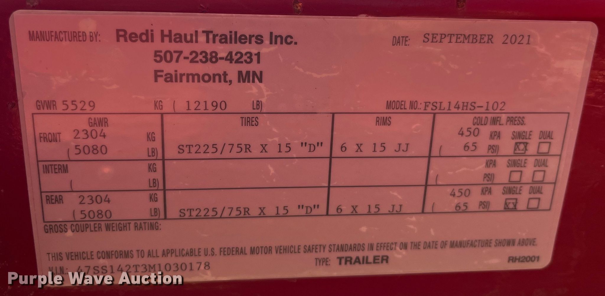 2021 Redi Haul utility trailer. VIN: 47SS142T3M1030178. Dimensions Overall: 24' 9" L x 103" W, Deck: 14' L x 81" W, Tail length: 3', Ramps: Manual Length: 48". Features Deck type: Wood. Chassis Ball hitch: 2 5/16", Landing gear: Single, Suspension: Spring, Axles: Tandem, GVWR: 12,190 lbs, GAWR: 5,080 lbs. Tires Steel wheels, Size: 225/75R15. Iowa title. Seller is an Iowa licensed motor vehicle dealer. The buyer may be required to pay sales tax and/or registration fees to the dealer prior to taking possession. Title will be assigned and distributed by the dealer. Please contact the seller for distribution questions. Cowan Equipment. Centerville, IA 52544