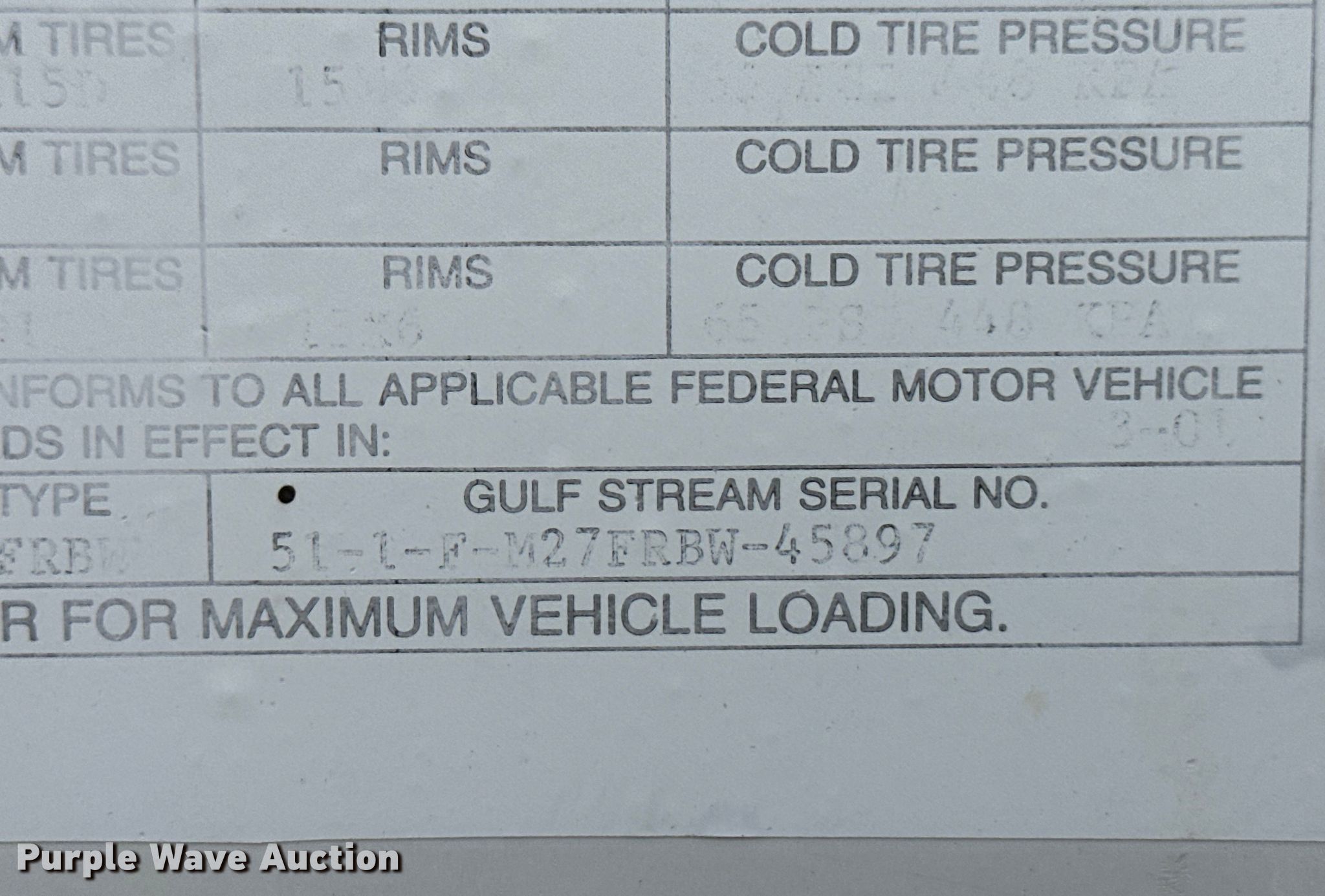 2001 Gulf Stream camper. Camper length: 27', VIN: 1NL1NFM2311045897. Chassis Axles: Tandem, Suspension: Spring, Brakes: Electric. Interior Kitchen: Sink, Refrigerator, Freezer, Microwave, Oven, Stove: Gas, Living room: Table, Pull out couch, Bathroom, Beds: 1 Bed type: Queen, Heater, AC units: 1. Features Slide outs: 1, Awnings: 1 Awning type: Manual. Tires Size: 225/75R15. Kansas title. Title distribution may be delayed up to 14 days from verification of funds. 1734 Rd. Q. Tribune, KS 67879
