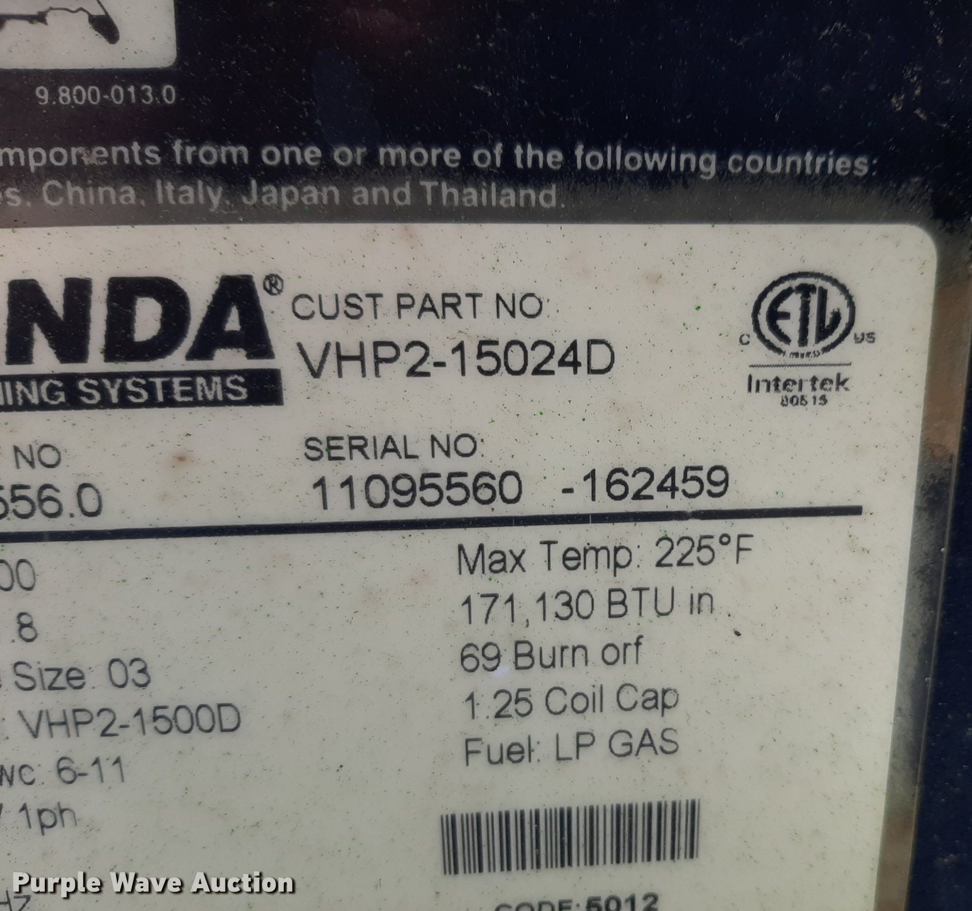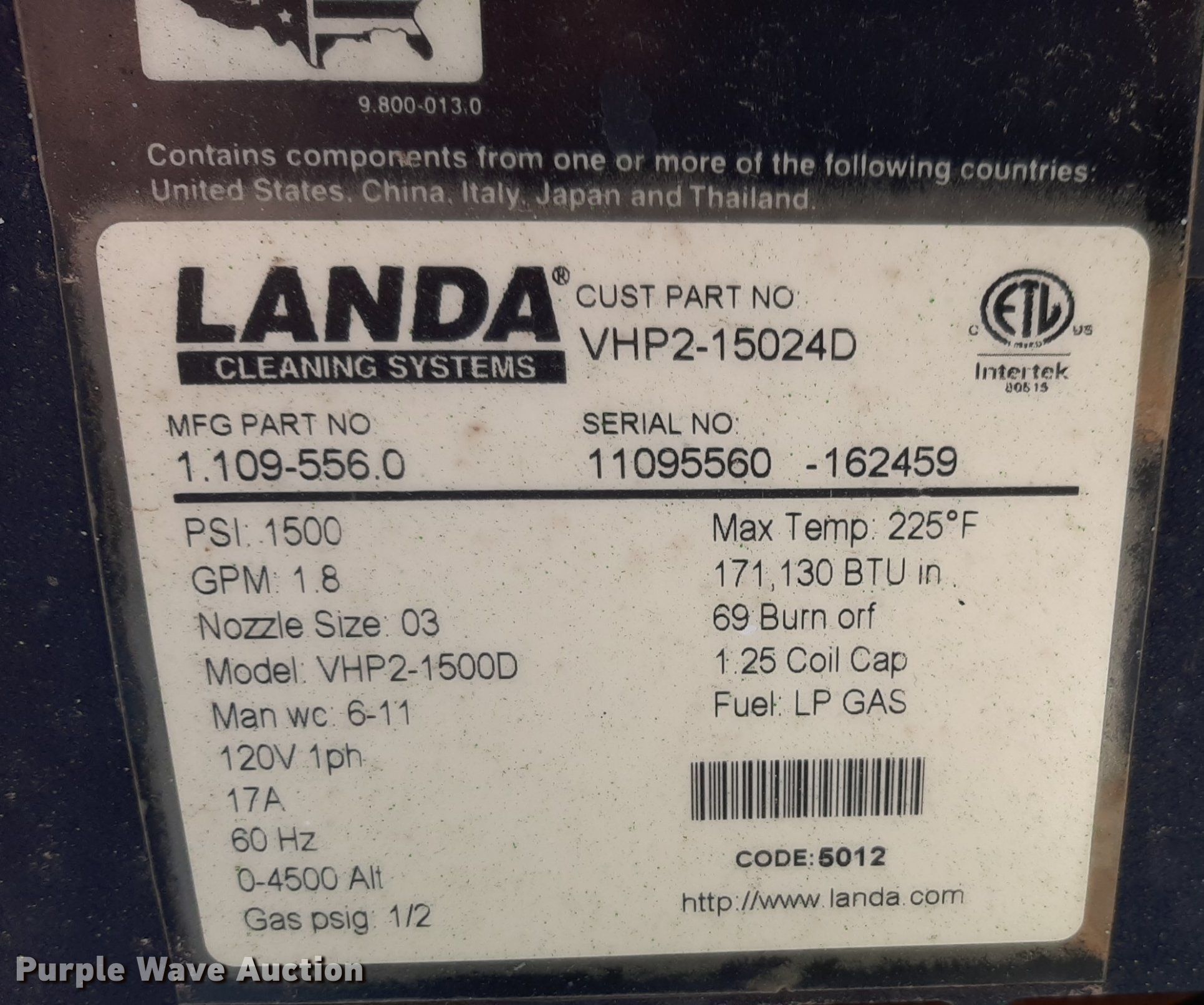 Purple Wave is selling a used Pressure Washer in Oklahoma. This item is a Landa VHP2-15024D pressure washer with the following: Serial: 11095560