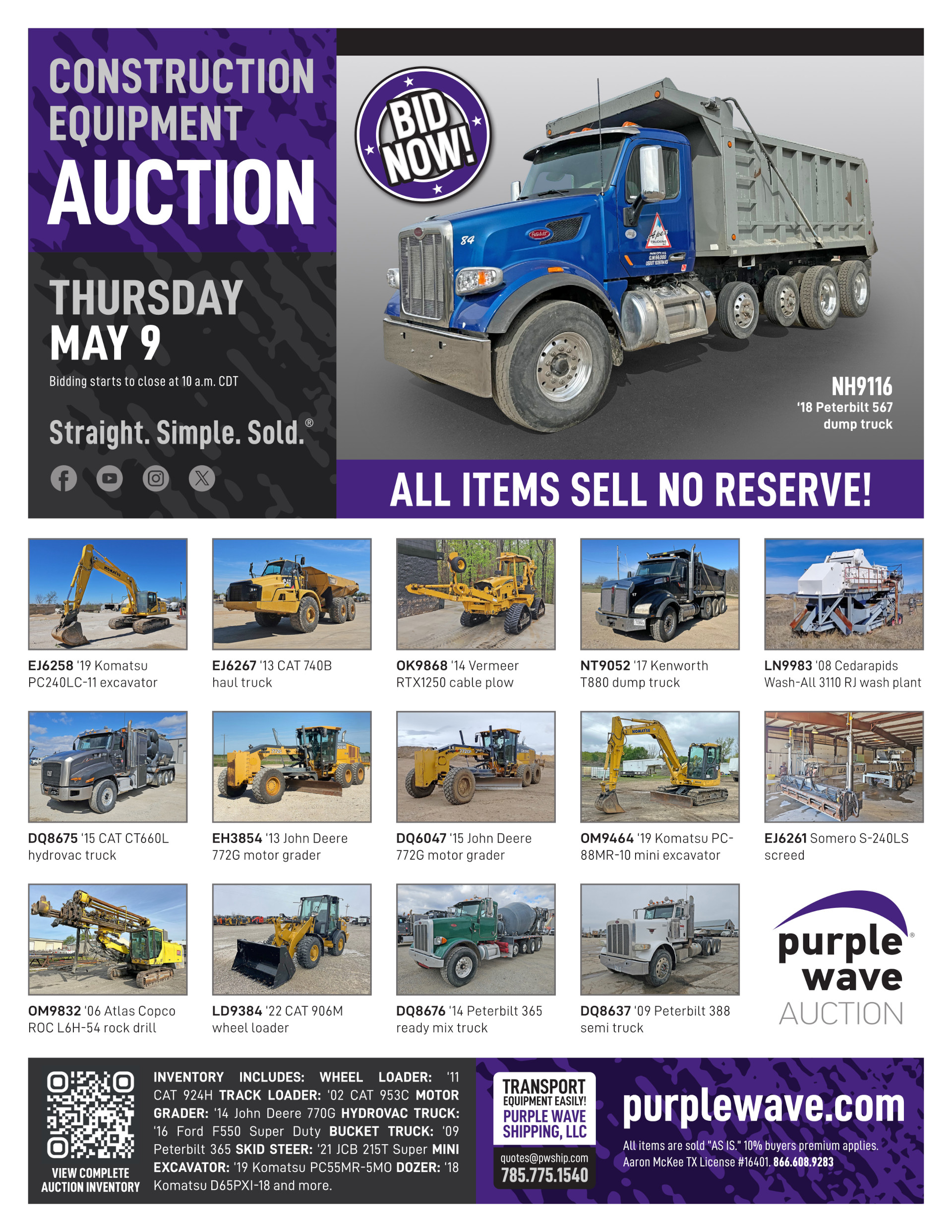 Purple Wave Shipping, LLC provides shipping and transportation services to winning bidders on ag, construction and fleet type assets. Purple Wave Shipping, LLC does not provide shipping on items weighing less than 1,000 pounds.