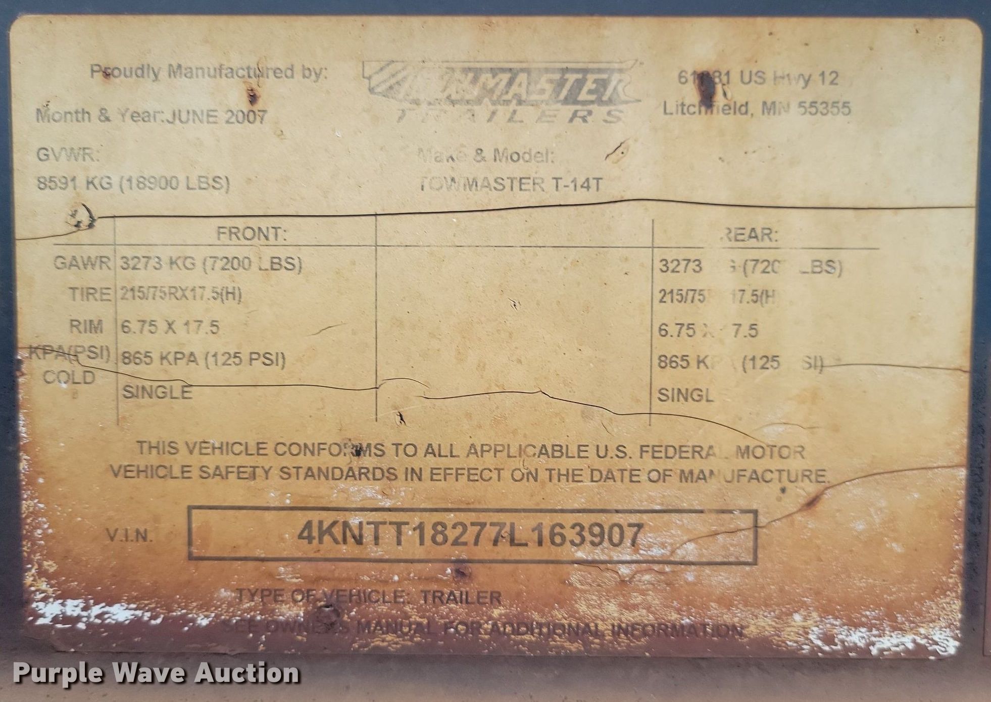 Purple Wave is selling a used Equip. Trailer in Missouri. This item is a 2007 Towmaster T-14T tilt deck equipment trailer with the following: VIN: 4KNTT18277L163907