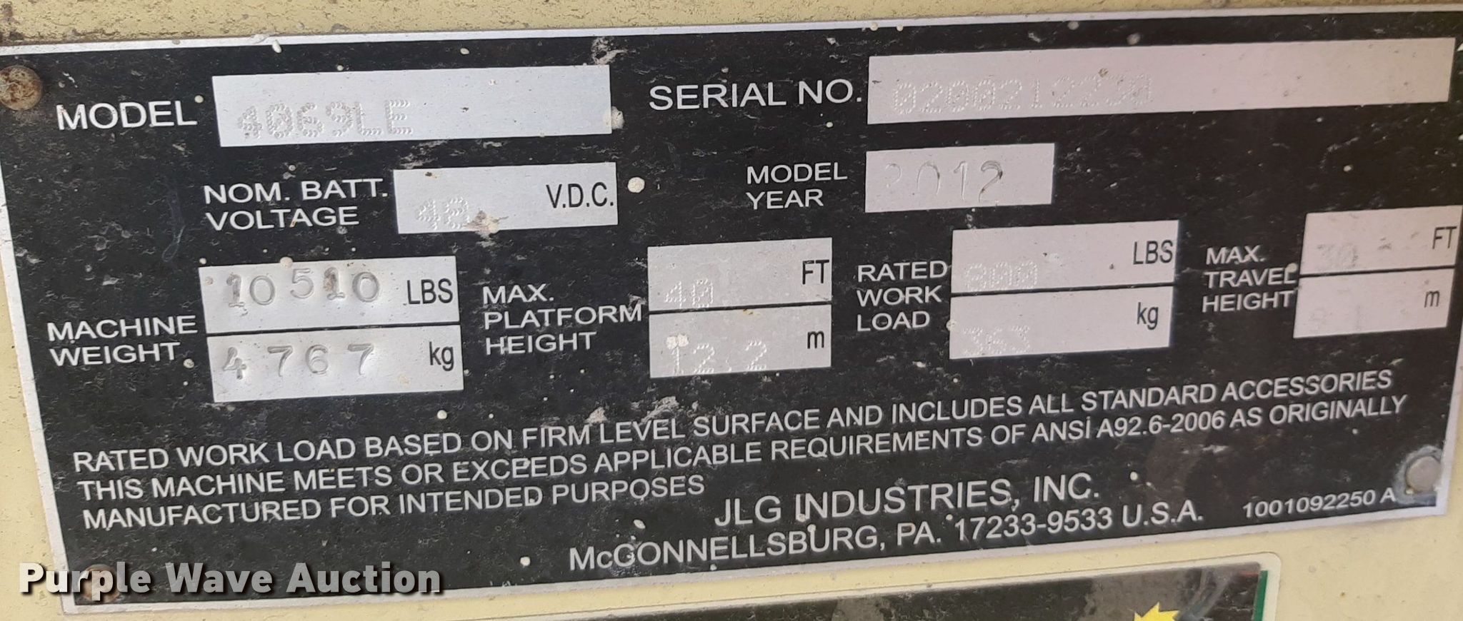 Purple Wave is selling a used Scissor or Vertical Lift in Kansas. This item is a 2012 JLG 4069LE scissor lift with the following: Hours: 536 on meter, Serial: 0200212230