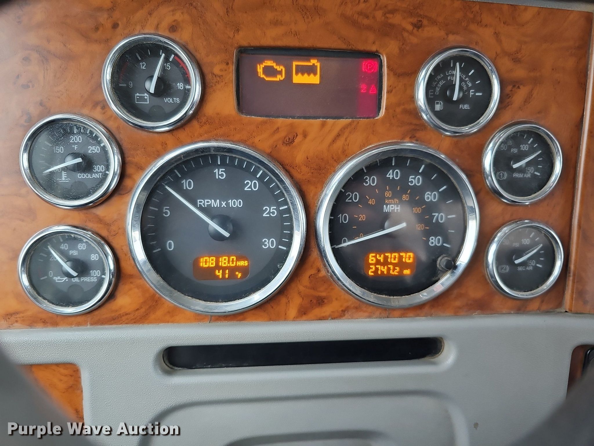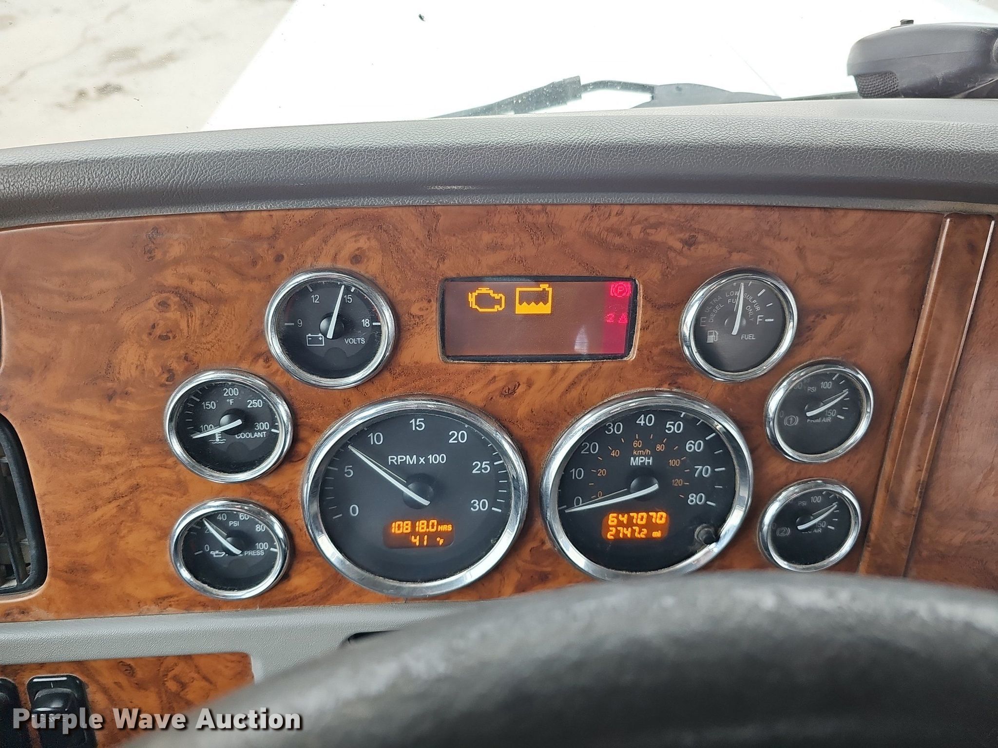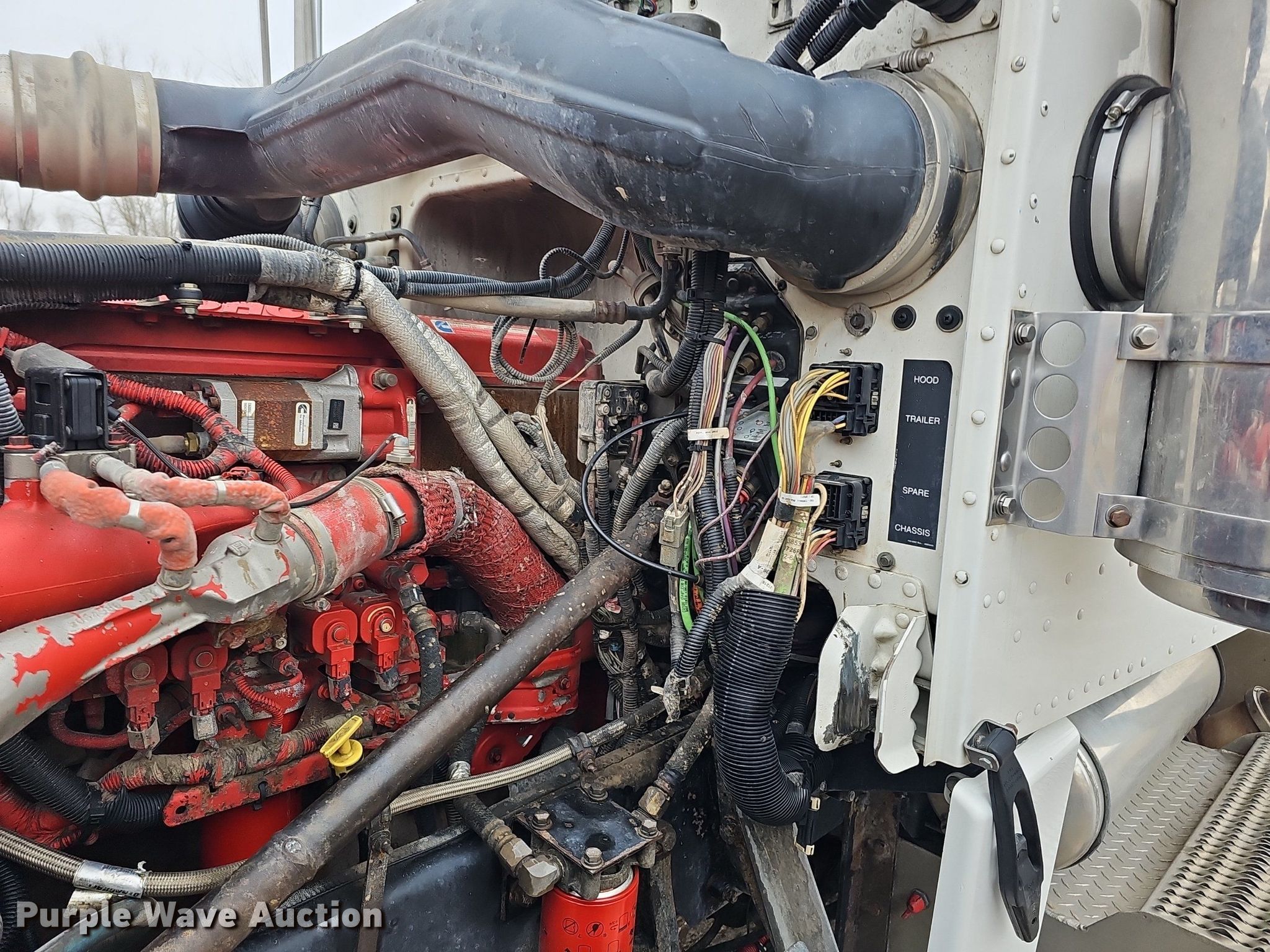 2009 Peterbilt 388 semi truck. Miles: 647,070 on odometer, Hours: 10,818 on meter, VIN: 1XPWD4EX99D783853. Engine Cummins ISX 485, Displacement: 14.9L, Serial: 79318623, Cylinders: 6, Fuel type: Diesel. Transmission Eaton Fuller, Manual, Speed: 18. Chassis Axles: Triple, Pusher axle, Differential lock: Full, Suspension: Air Dump valves, Brakes: Air, PTO, Wet kit, GVWR: 74,600 lbs FAWR: 14,320 lbs, IAWR: 23,000 lbs, RAWR: 23,000 lbs, Lift axle GAWR: 22,700 lbs, Wheelbase: 264". Interior AC, Heat, Power windows, Cruise control, Air ride cab. Features Deck plate: Aluminum, Fifth wheel type: Air operated, Sliding, Fuel tank: Dual, Headache rack. Tires Size: 11R24.5, Lift axle: 11R22.5. Notes Engine overhauled November 2021, Dash warning indicator: Check engine, Low coolant, Windshield chipped or cracked. View repairs. Nebraska title. Constructors, Inc.. 6500 N 70th Street. Lincoln, NE 68507