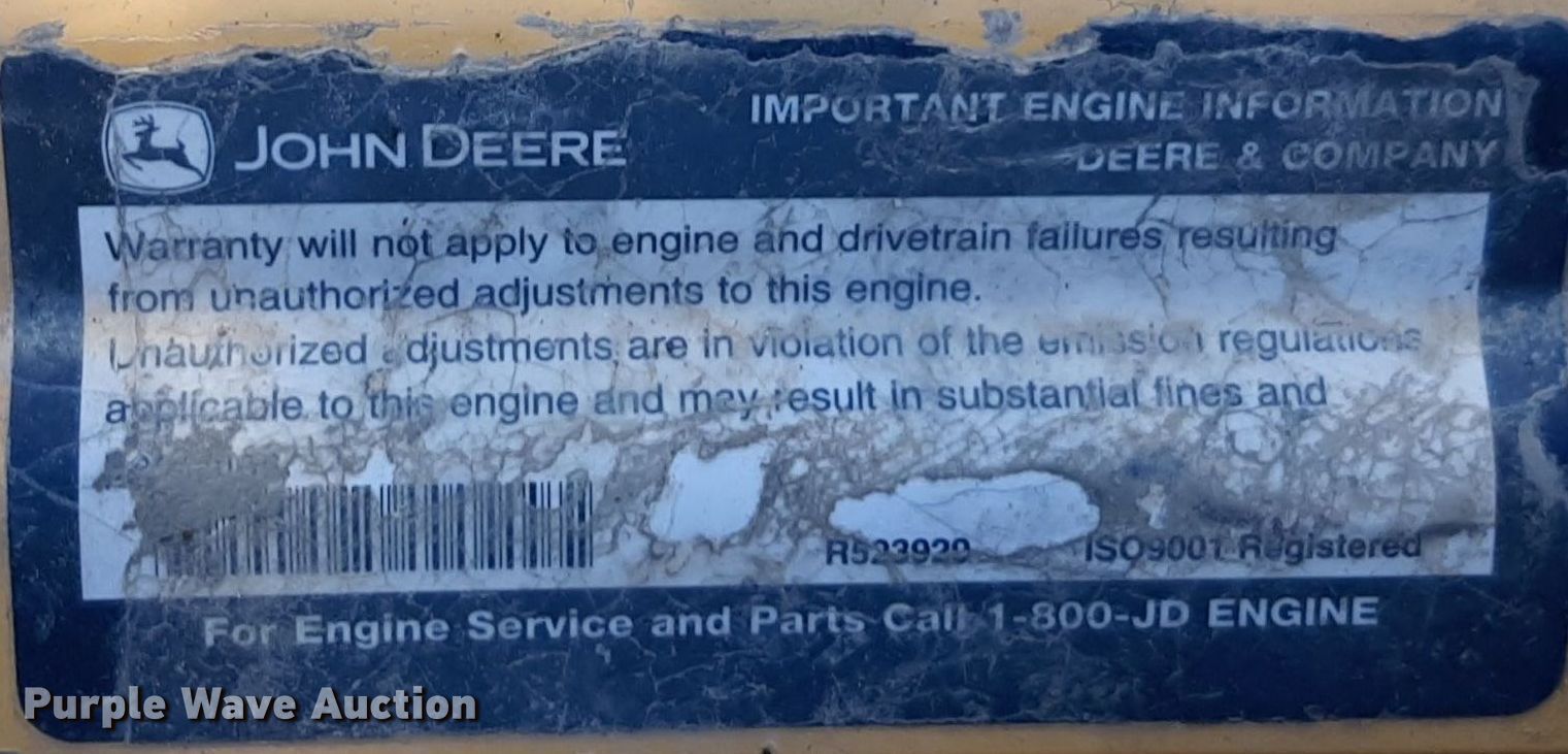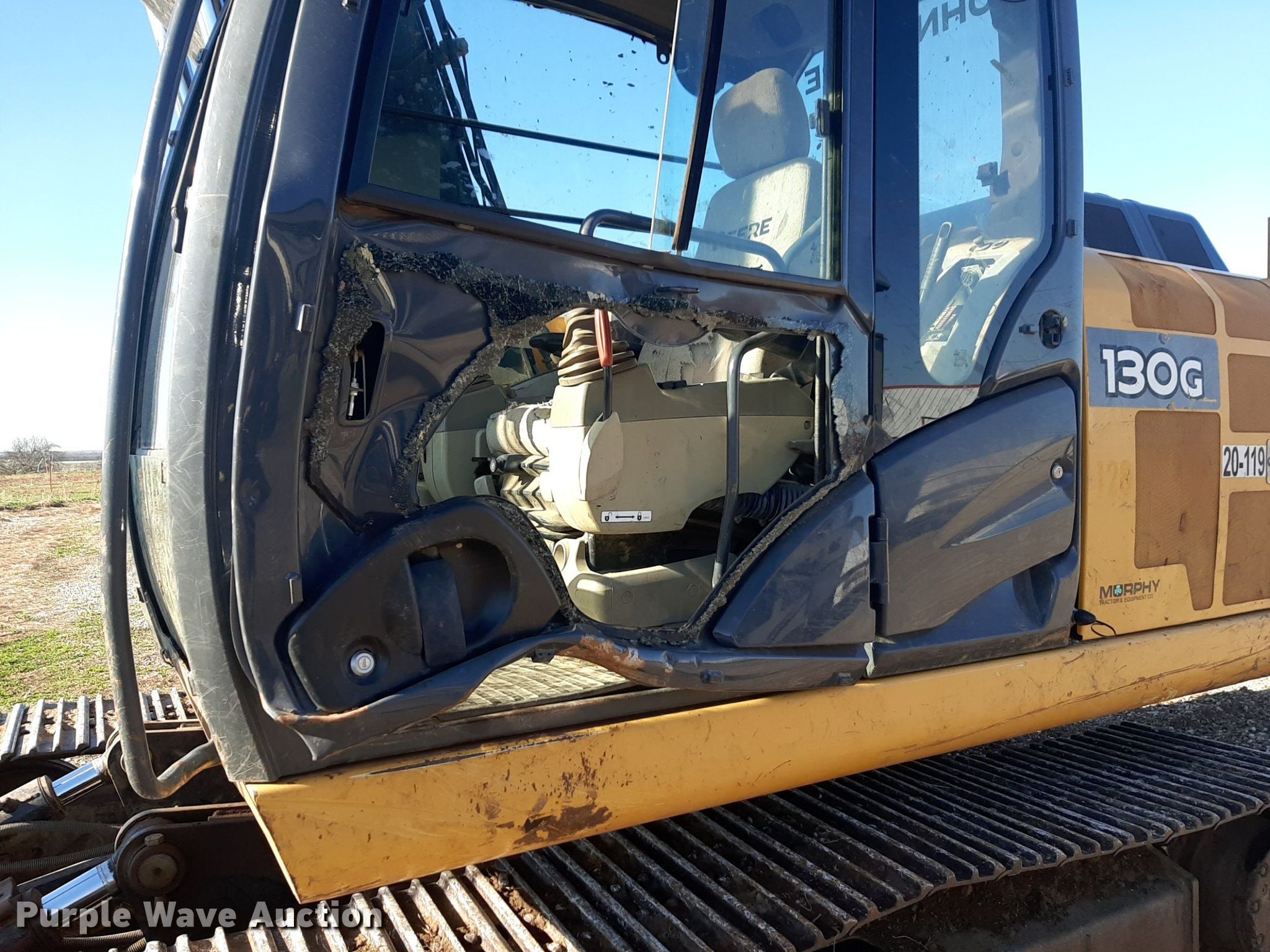 2015 John Deere 130G excavator. Hours: 9,097 on meter, Serial: 1FF130GXPFE040844. Engine Cylinders: 6, Fuel type: Diesel. Transmission Hydrostatic, Two speed travel. Operators station Enclosed cab, AC, Heat. Features Auxiliary hydraulics, Backfill blade Width: 102", Boom Standard, Stick Stick length: 11', Quick coupler: Hydraulic JRB, Bucket Width: 24", Teeth: 4. Tracks Width: 24", Grouser pads: Triple. Notes Non-operational door, damaged, Glass missing. Bryce Gragg. Moline, KS 67353
