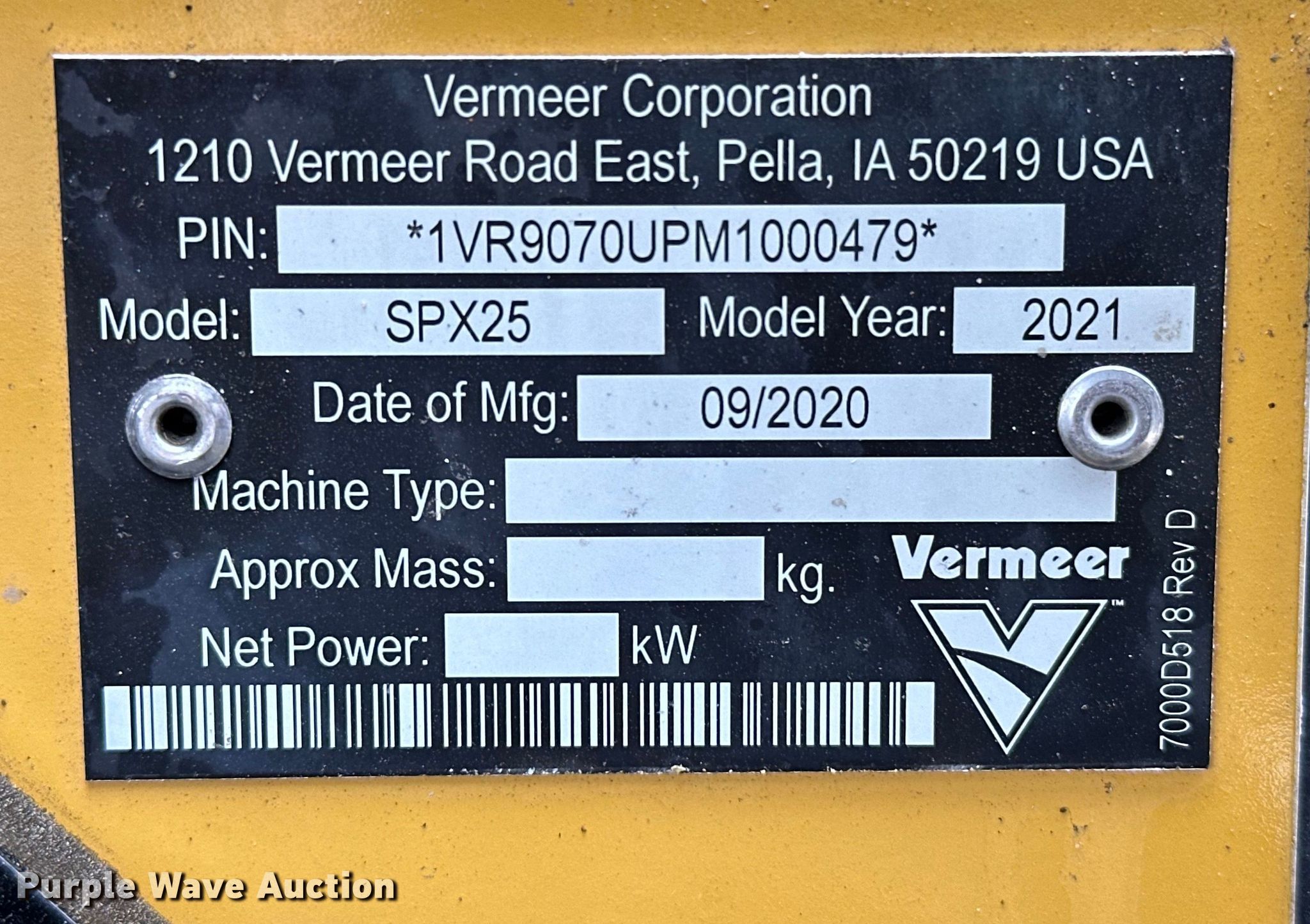Purple Wave is selling a used Cable Plow in Oklahoma. This item is a 2021 Vermeer SPX25 cable plow with the following: Hours: 65 on meter, Serial: 1VR9070UPM1000479
