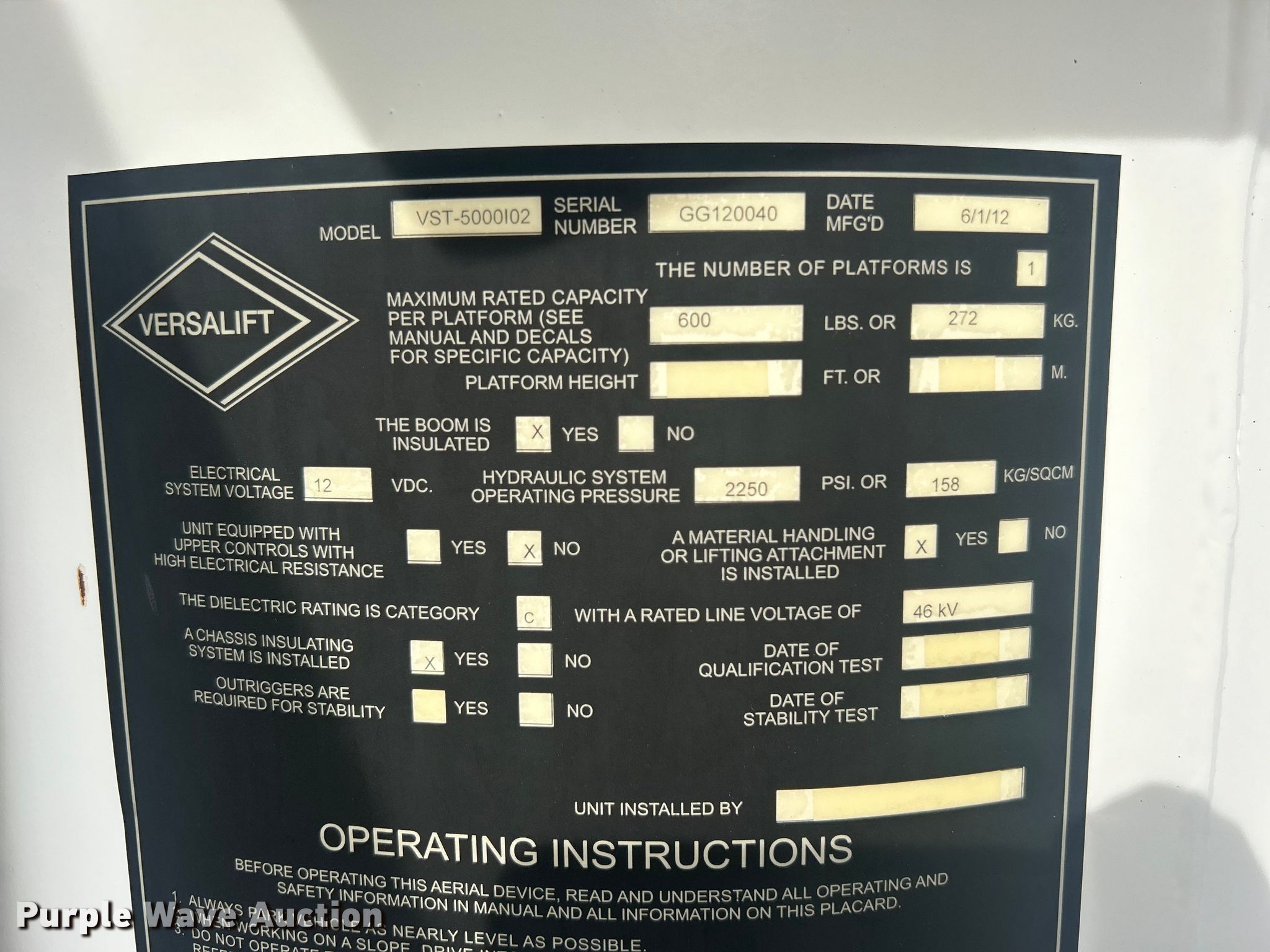 2012 Freightliner M2 Business Class bucket truck. Miles: 57,833 on odometer, Hours: 2,694 on meter, VIN: 1FVAC2BS8CDBU0405. Engine Cummins ISC6.3, Serial: 73342630, Displacement: 8.3L, Cylinders: 6, Fuel type: Diesel. Transmission Eaton Fuller, Manual, Speed: 10. Chassis Axles: Single, Suspension: Spring, Brakes: Air, PTO, GVWR: 33,000 lbs. Interior AC, Heat, Heated mirrors, Cruise control. Features Bed Dakota Bodies, Inc 132-LB, Serial: DB14759, 11' x 94" W, Boom 2012 Versalift VST-50000I02, Serial: GG120040, Maximum lift capacity: 600 lbs, Boom type: Articulating, Insulated, Telescopic, Man basket, Boom controls Platform/ basket, Material handler, Hi-rail system. Tires Size: 11R22.5. Notes Windshield chipped or cracked. Oklahoma title. Title distribution may be delayed up to 14 days from verification of funds. 15107 North 137th East Avenue. Collinsville, OK 74021