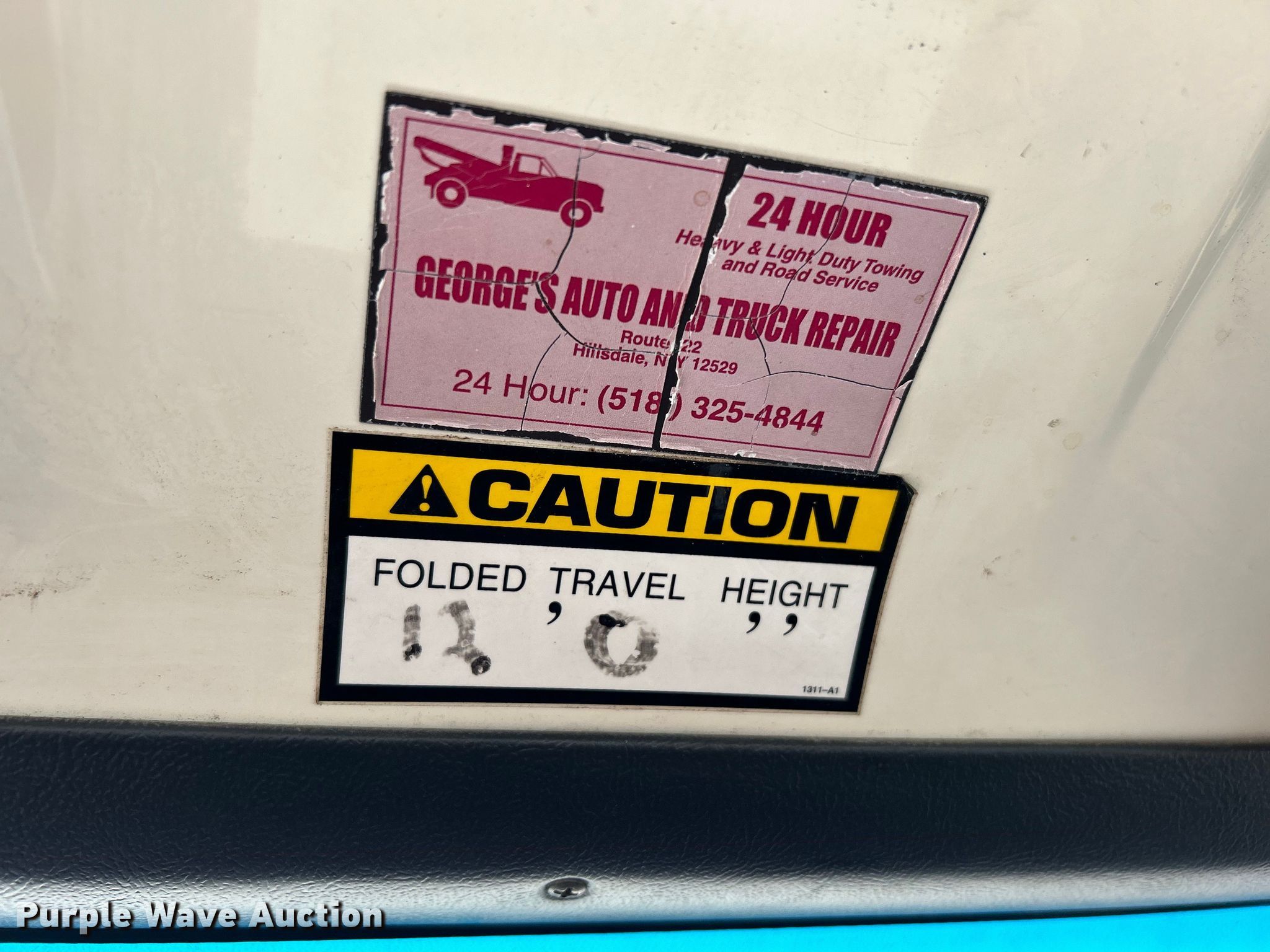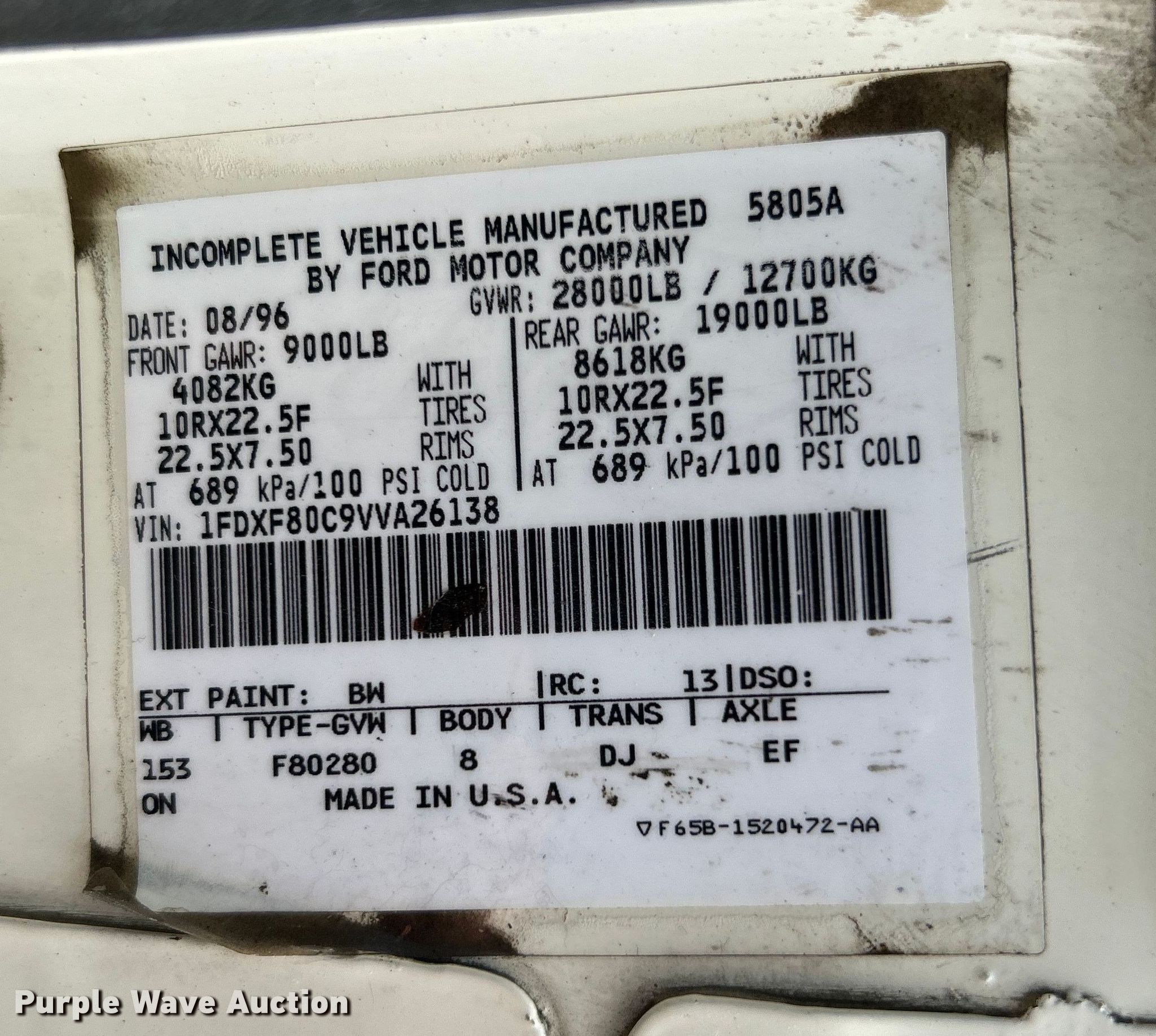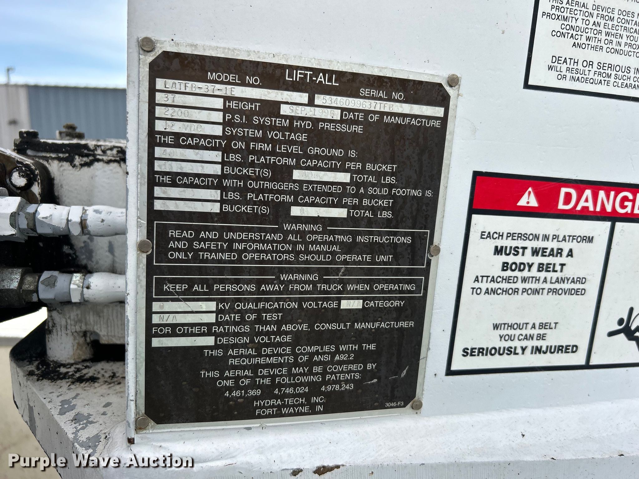1997 Ford F800 bucket truck. Miles: 171,371 on odometer, VIN: 1FDXF80C9VVA26138. Engine Cummins B5.9, Serial: 45400846, Displacement: 5.9L, Cylinders: 6, Fuel type: Diesel, HP: 190. Transmission Manual, Speed: 6. Chassis Axles: Single, Suspension: Spring, Brakes: Air, PTO, GVWR: 19,000 lbs, Wheelbase: 153". Interior AC, Heat. Features Bed Fibre Body, 10' 11" L x 94" W, Boom 1996 Lift-All LATFB-37-1E, Serial: 5346099637TFB, Maximum lift capacity: 400 lbs, Maximum lift height: 37', Boom type: Articulating, Telescopic, Man basket, Boom controls Platform/ basket.. Tires Size: 10R22.5. Oklahoma classic title. Title distribution may be delayed up to 14 days from verification of funds. 15107 North 137th East Avenue. Collinsville, OK 74021
