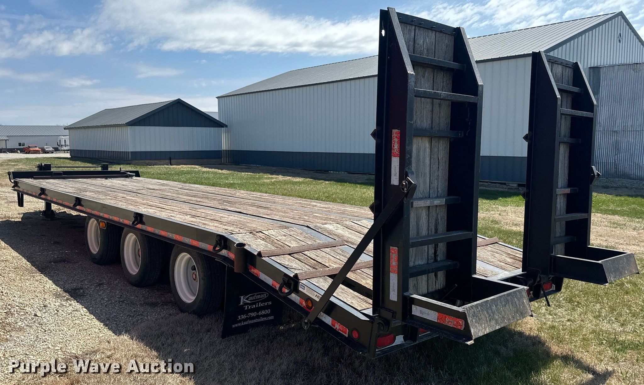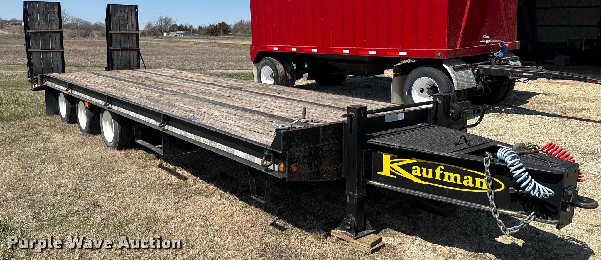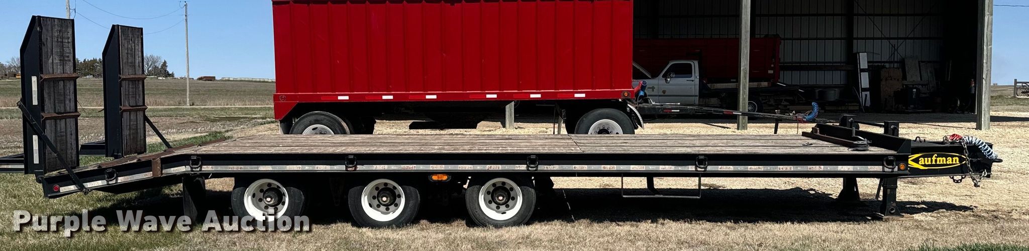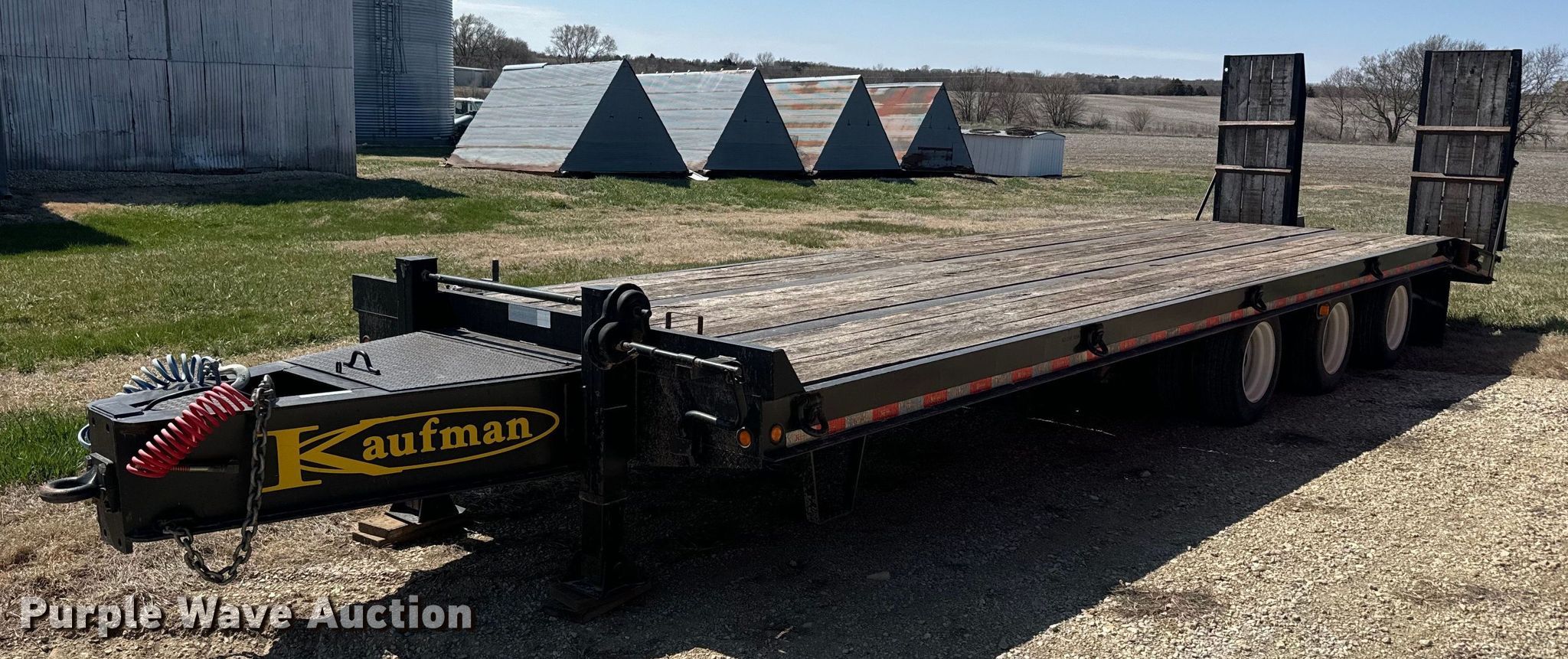 2012 Kaufman equipment trailer. VIN: 5SHAP3036CB001064. Dimensions Deck: 25' L x 101" W, Tail length: 5', Ramps: Manual Length: 5' 6". Features Deck type: Wood. Chassis Hitch: Pintle, Landing gear: Dual, Suspension: Spring, Brakes: Air, Axles: Triple. Tires Steel wheels, Size: 215/75R17.5. Kansas title. Title distribution may be delayed up to 30 days from verification of funds. CSV Farms. Wakefield, KS 67487