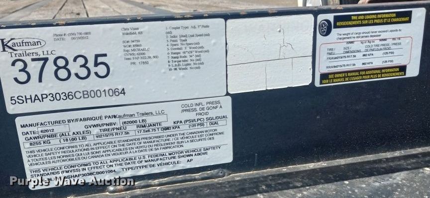 Purple Wave is selling a used Equip. Trailer in Kansas. This item is a 2012 Kaufman equipment trailer with the following: VIN: 5SHAP3036CB001064