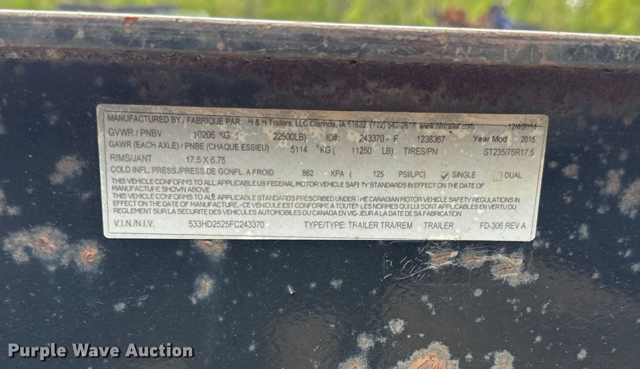 Purple Wave is selling a used Equip. Trailer in Florida. This item is a 2015 H&H FD-306 equipment trailer with the following: VIN: 533HD2525FC243370